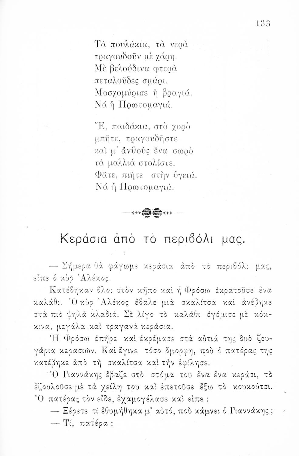Αναγνωστικό Β΄ Δημοτικού που περιλαμβάνει πεζογραφήματα και ποιήματα από την οικογενειακή και την κοινωνική ζωή των παιδιών, από την ελληνική ύπαιθρο, από τις ελληνικές εορτές και από τις 4 εποχές του χρόνου. Διαφοροποιείται αισθητά από τα βιβλία της επόμενης περιόδου που εμμένουν αρκετά στο τρίπτυχο "Πατρίς-θρησκεία-οικογένεια".