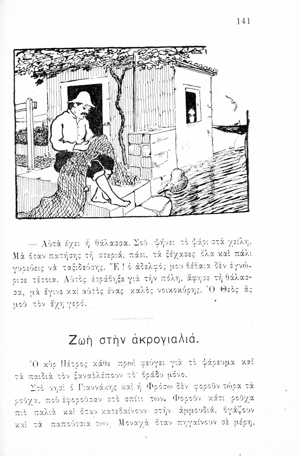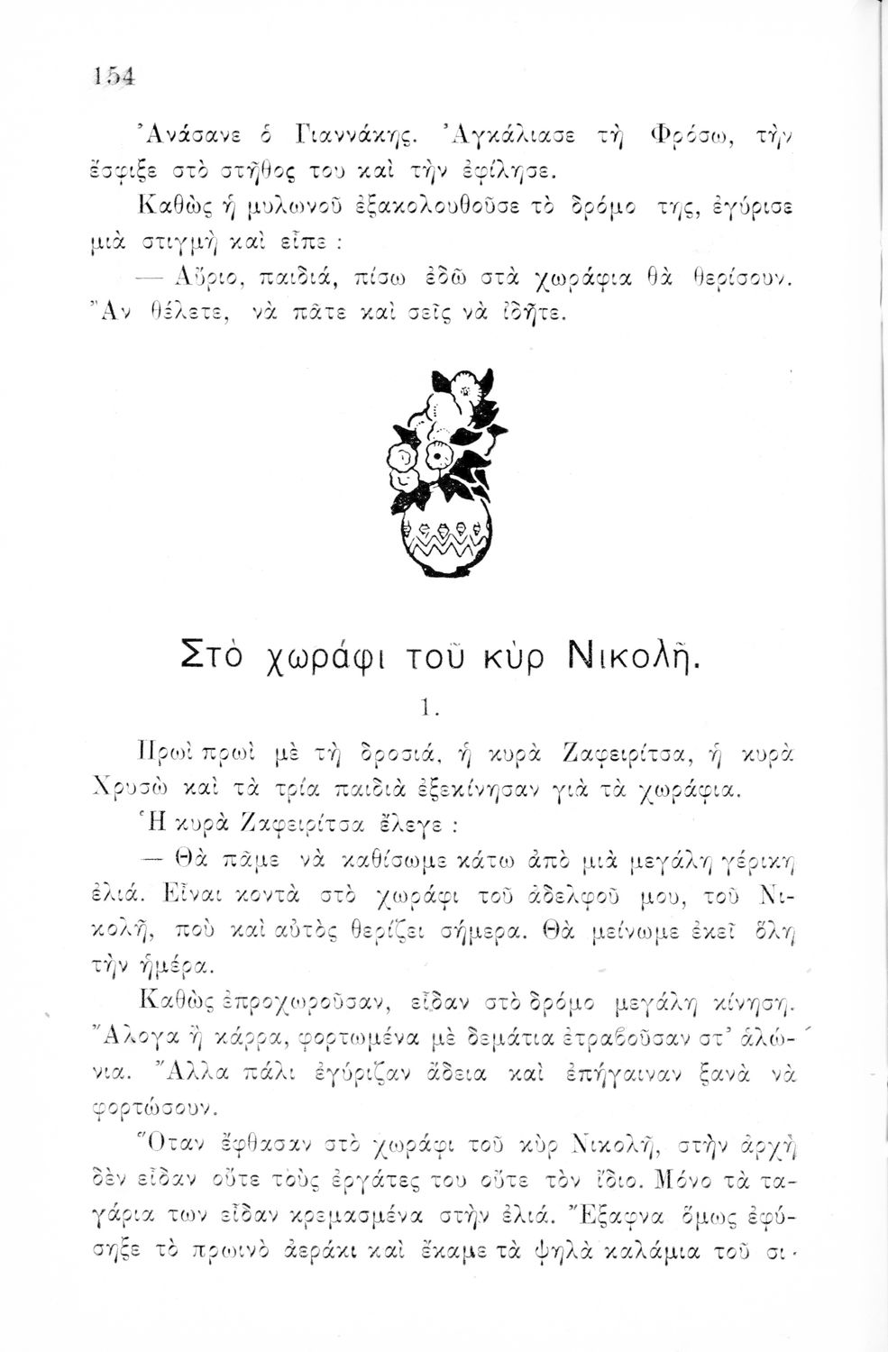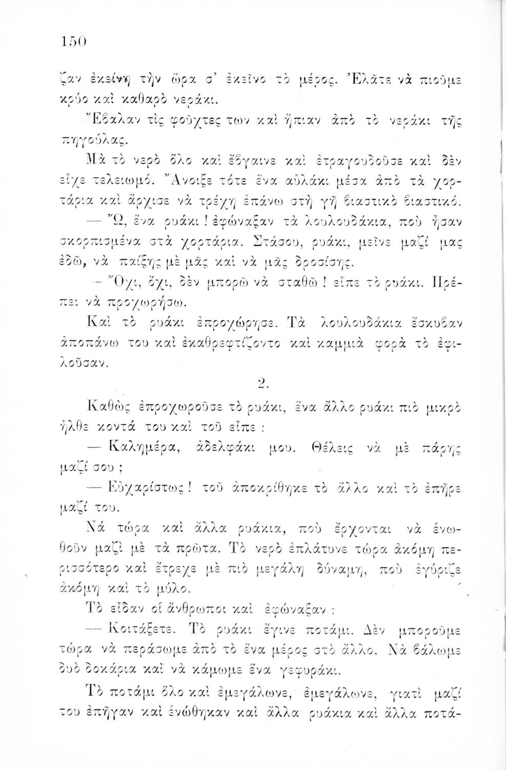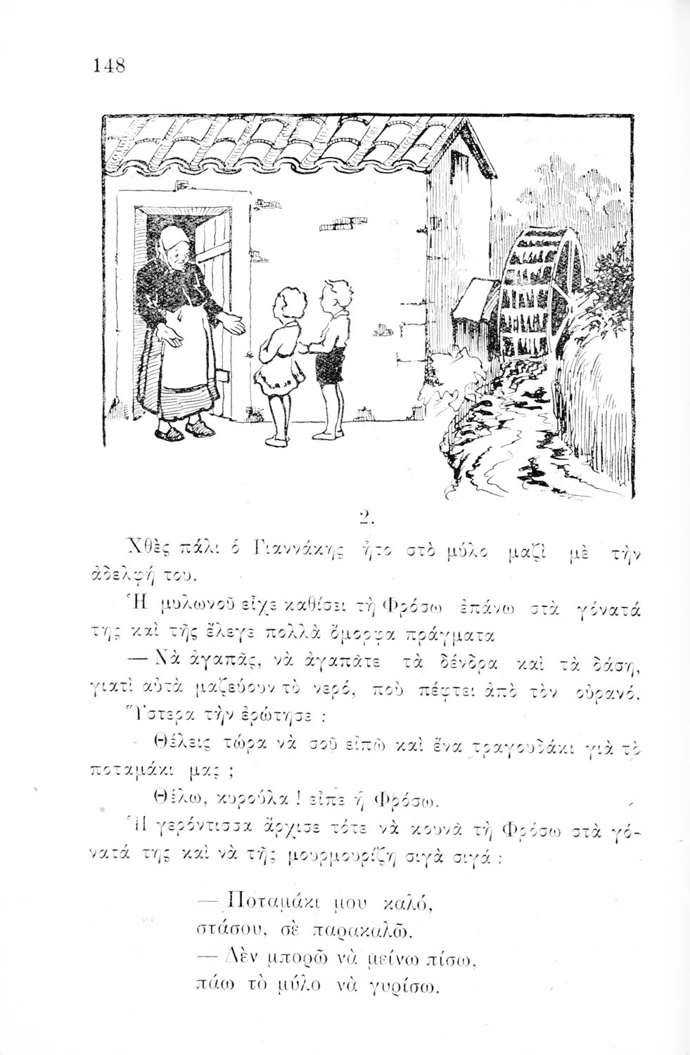 Αναγνωστικό Β΄ Δημοτικού που αποτελείται από πεζά γραμμένα σε καθαρεύουσα και ποιήματα σε δημοτική εμπνευσμένα από την οικογένεια, τη θρησκεία, την πατρίδα, την ελληνική φύση και ύπαιθρο, την αγάπη για τα ζώα,