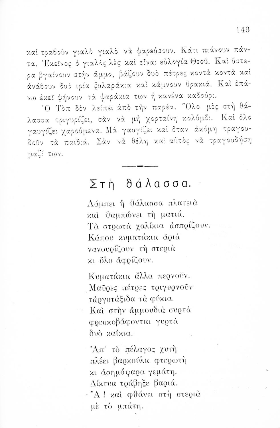 Αναγνωστικό Γ΄ Δημοτικού που περιλαμβάνει ποιήματα και πεζά εμπνευσμένα από την ελληνική φύση, τις ασχολίες των κατοίκων, την σύγχρονη ελληνική ιστορία, την ελληνική μυθολογία και τις θρησκευτικές γιορτές.