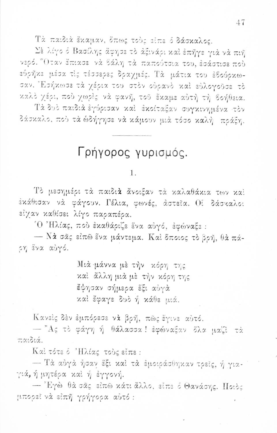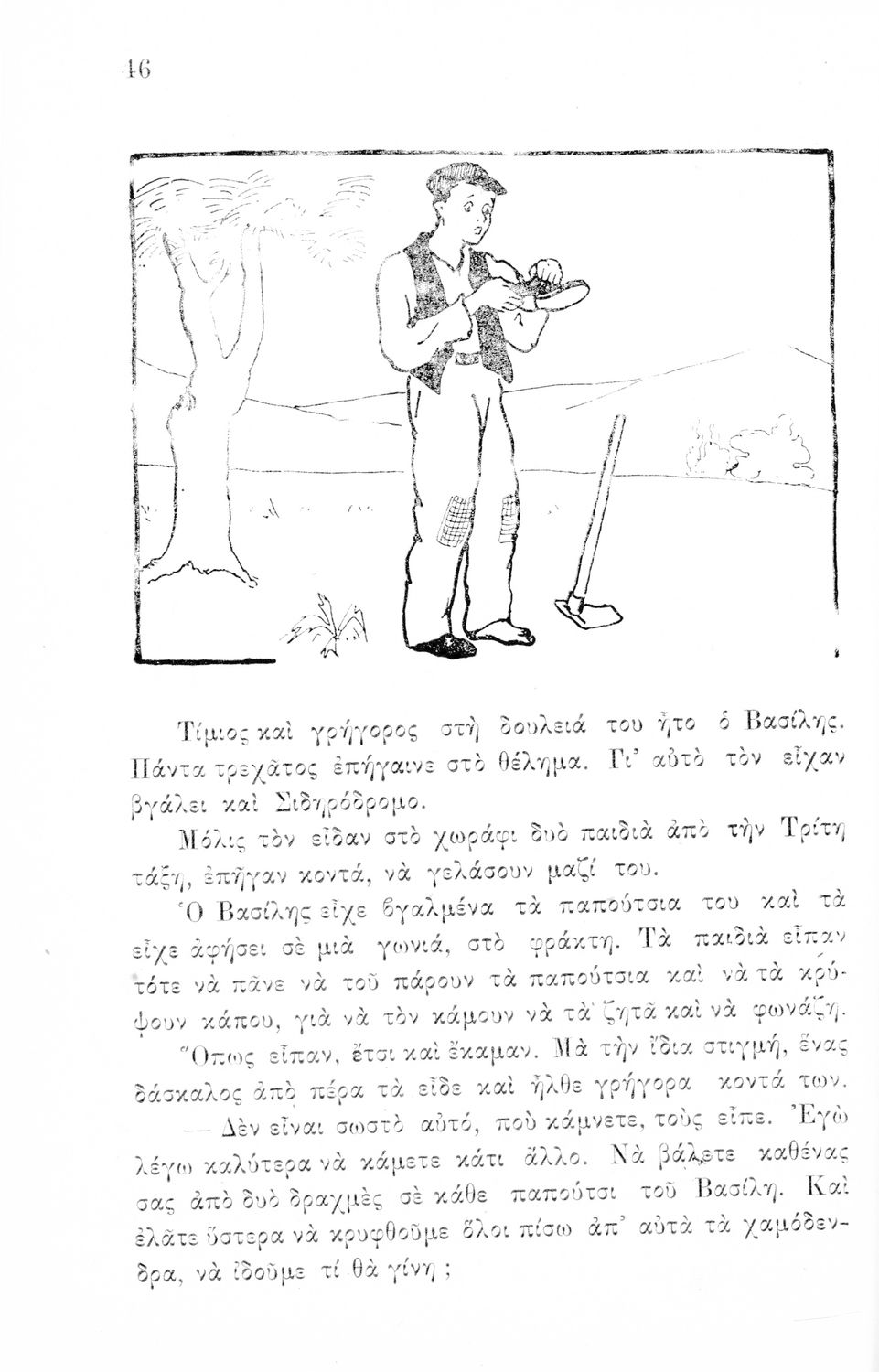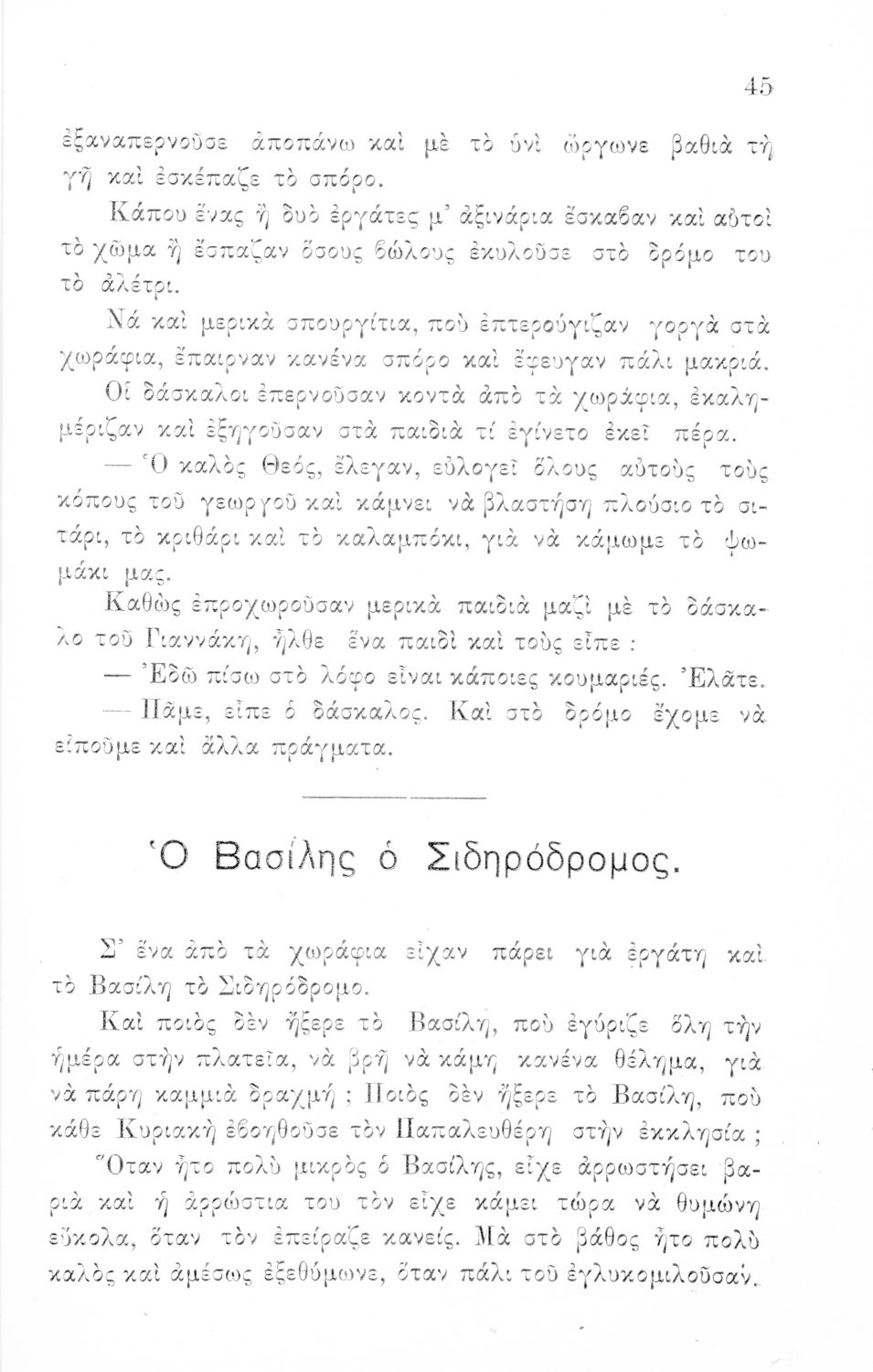 Αναγνωστικό Β΄ Δημοτικού που αποτελείται από πεζά γραμμένα σε καθαρεύουσα και ποιήματα σε δημοτική εμπνευσμένα από την οικογένεια, τη θρησκεία, την πατρίδα, την ελληνική φύση και ύπαιθρο, την αγάπη για τα ζώα,