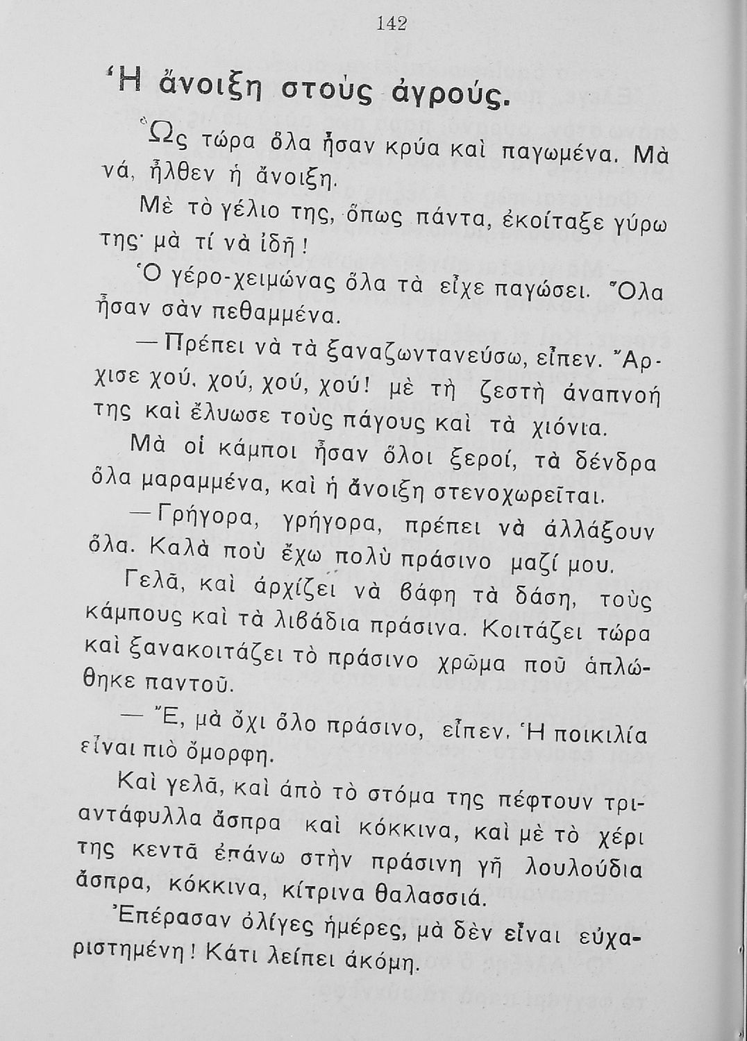 Αναγνωστικό Β΄ Δημοτικού που περιλαμβάνει πεζογραφήματα και ποιήματα από την οικογενειακή και την κοινωνική ζωή των παιδιών, από την ελληνική ύπαιθρο, από τις ελληνικές εορτές και από τις 4 εποχές του χρόνου. Διαφοροποιείται αισθητά από τα βιβλία της επόμενης περιόδου που εμμένουν αρκετά στο τρίπτυχο "Πατρίς-θρησκεία-οικογένεια".