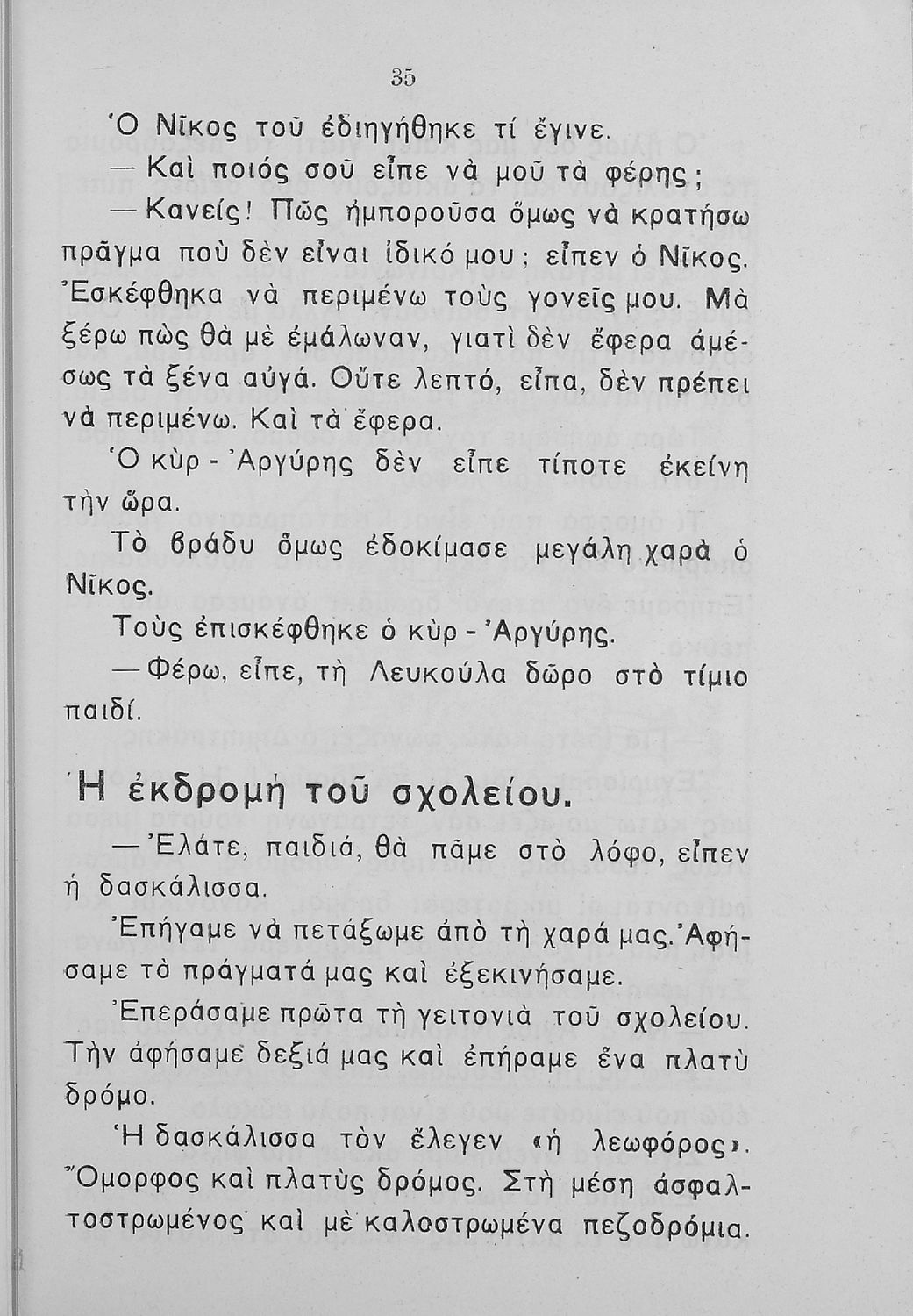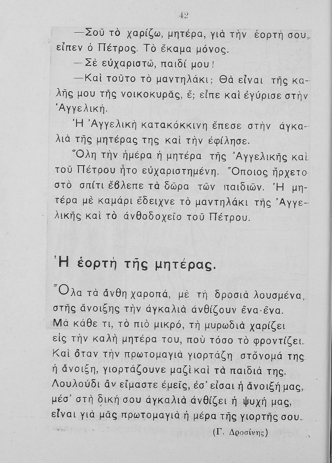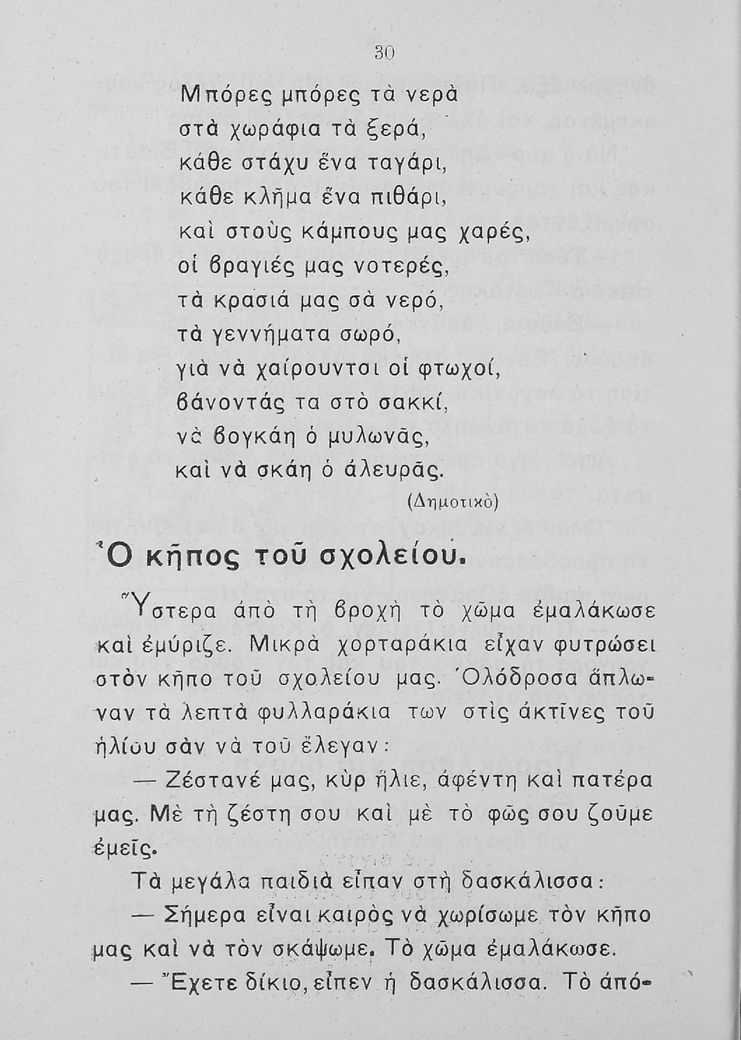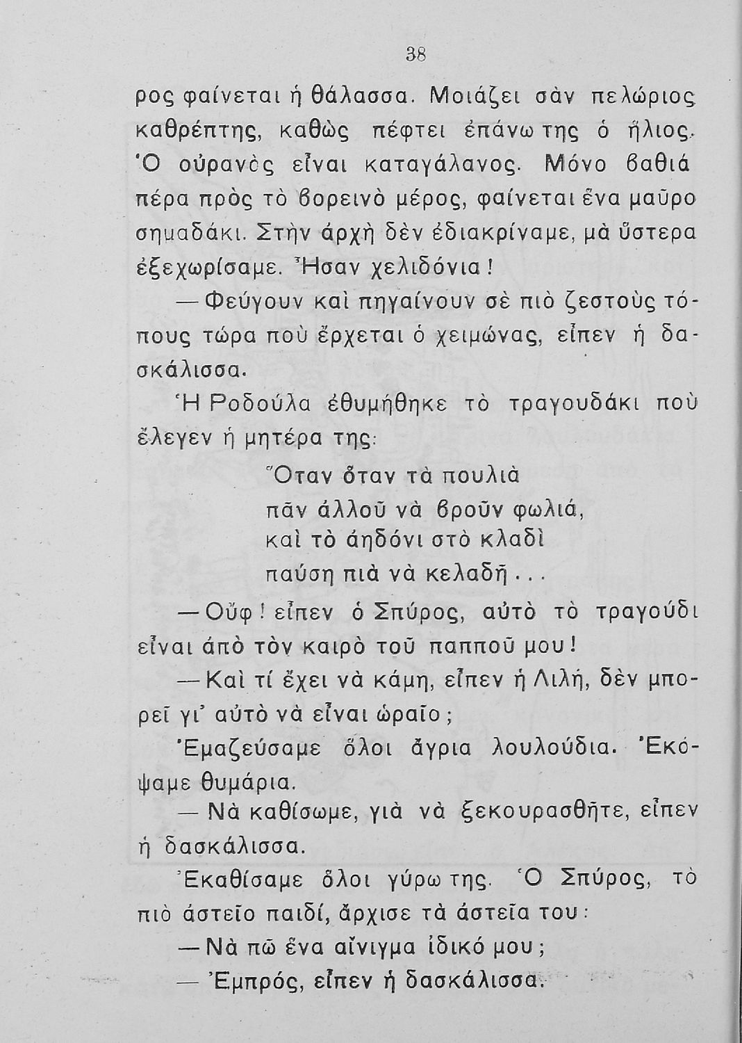 Αναγνωστικό Β΄ Δημοτικού που περιλαμβάνει πεζογραφήματα και ποιήματα από την οικογενειακή και την κοινωνική ζωή των παιδιών, από την ελληνική ύπαιθρο, από τις ελληνικές εορτές και από τις 4 εποχές του χρόνου. Διαφοροποιείται αισθητά από τα βιβλία της επόμενης περιόδου που εμμένουν αρκετά στο τρίπτυχο "Πατρίς-θρησκεία-οικογένεια".