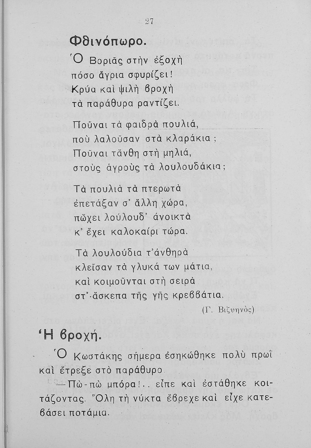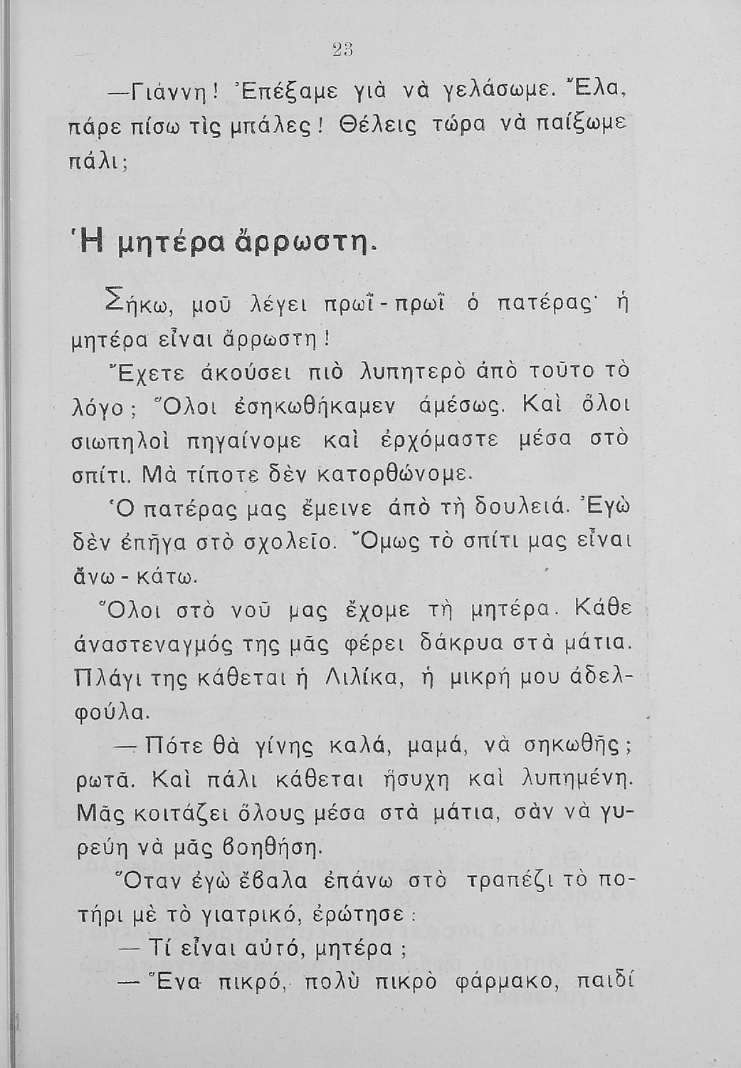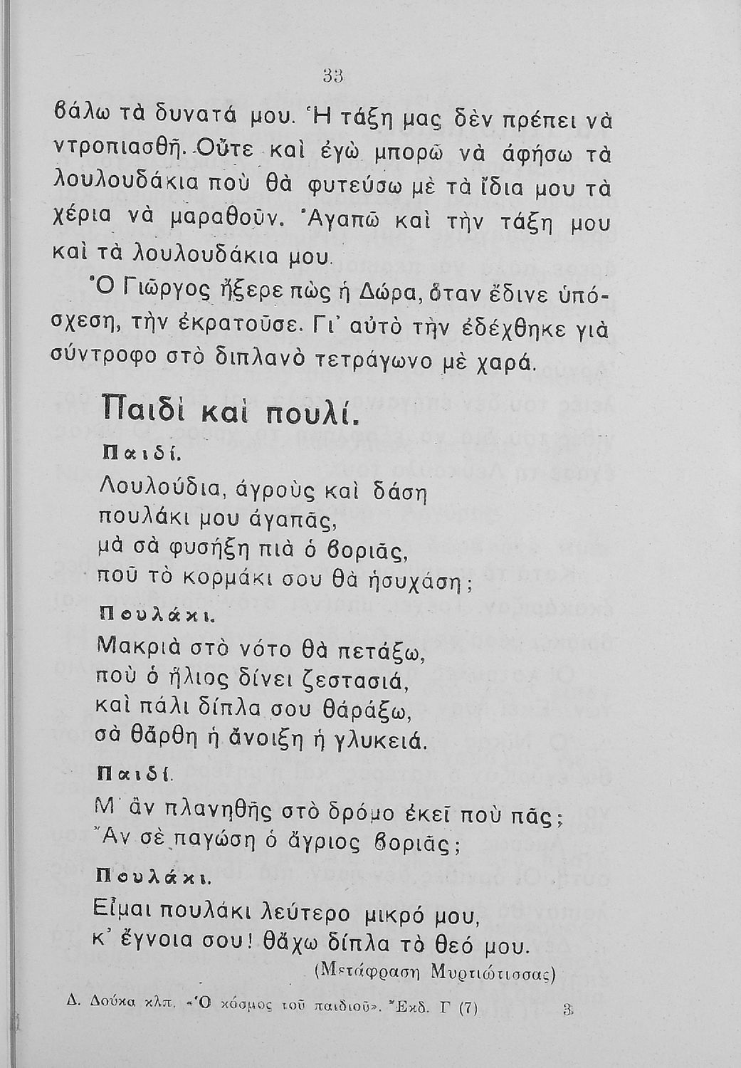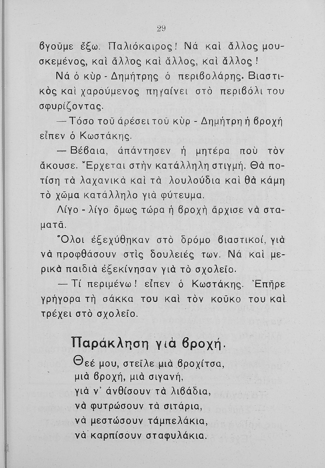 Αναγνωστικό Β΄ Δημοτικού που περιλαμβάνει πεζογραφήματα και ποιήματα από την οικογενειακή και την κοινωνική ζωή των παιδιών, από την ελληνική ύπαιθρο, από τις ελληνικές εορτές και από τις 4 εποχές του χρόνου. Διαφοροποιείται αισθητά από τα βιβλία της επόμενης περιόδου που εμμένουν αρκετά στο τρίπτυχο "Πατρίς-θρησκεία-οικογένεια".