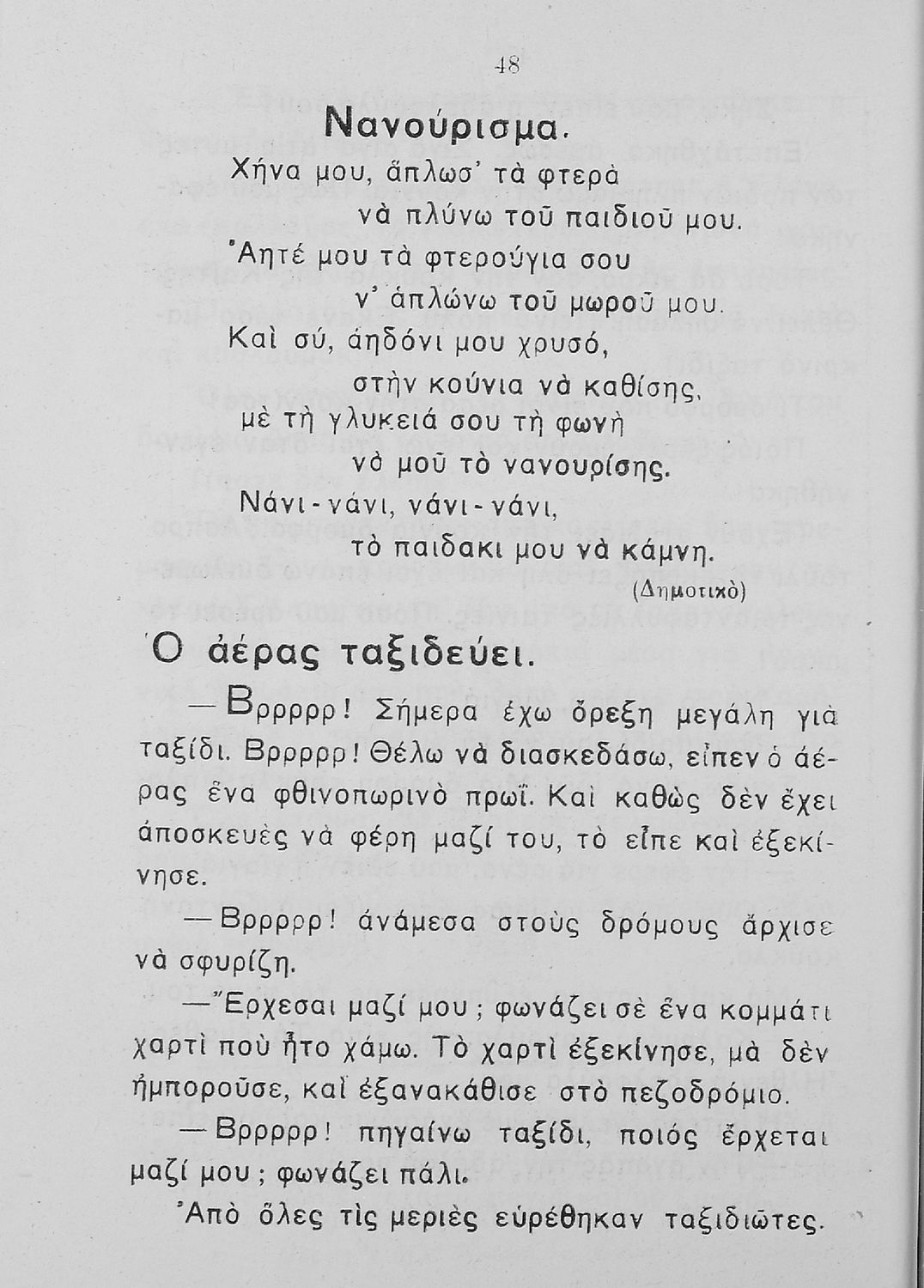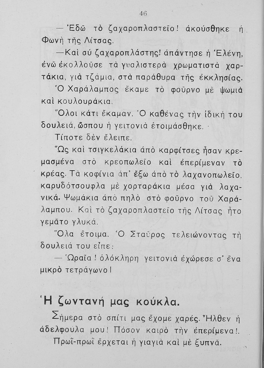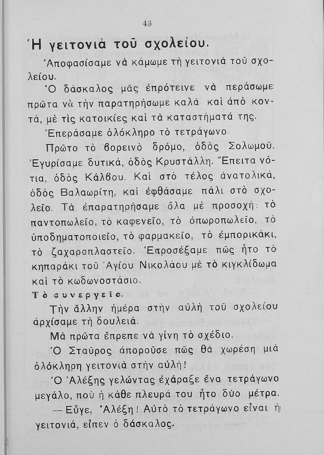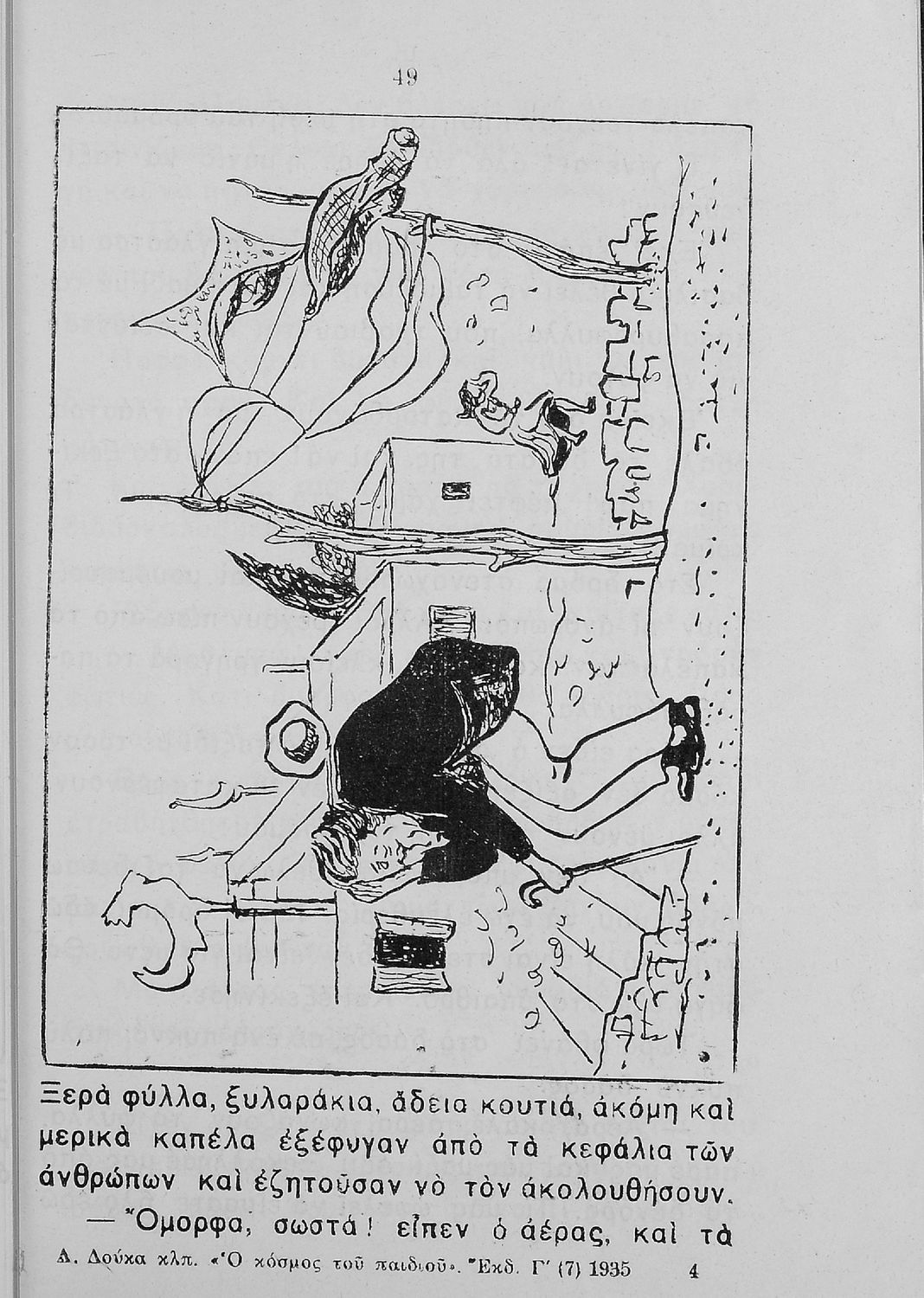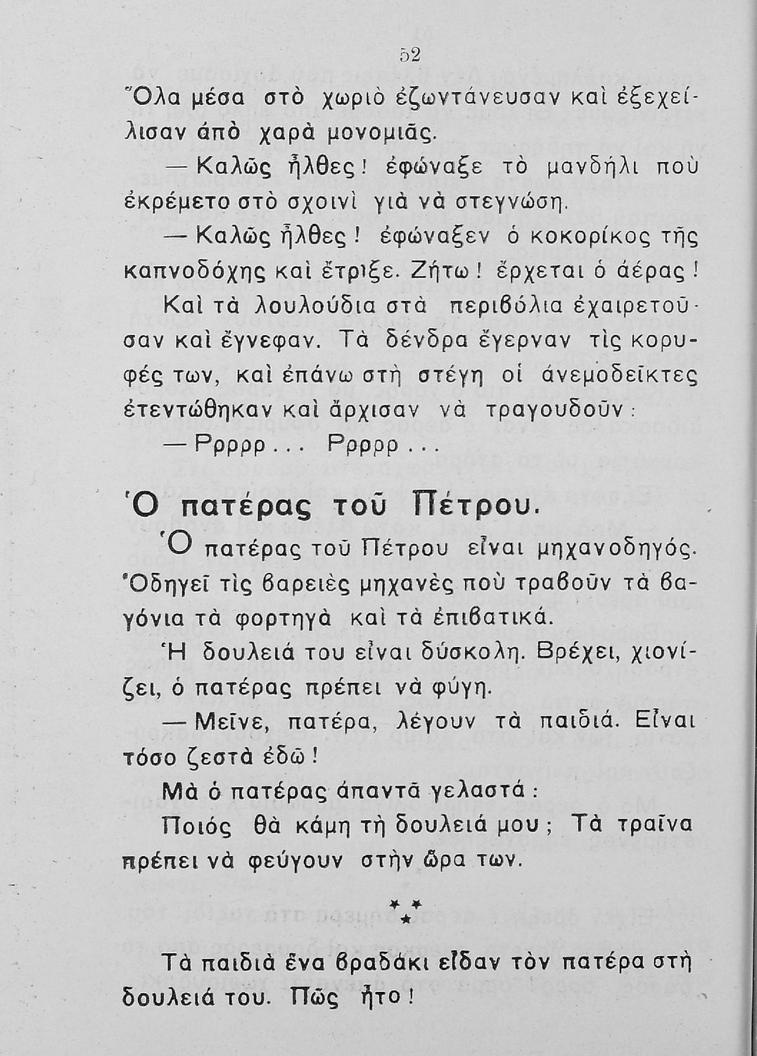Αναγνωστικό Β΄ Δημοτικού που περιλαμβάνει πεζογραφήματα και ποιήματα από την οικογενειακή και την κοινωνική ζωή των παιδιών, από την ελληνική ύπαιθρο, από τις ελληνικές εορτές και από τις 4 εποχές του χρόνου. Διαφοροποιείται αισθητά από τα βιβλία της επόμενης περιόδου που εμμένουν αρκετά στο τρίπτυχο "Πατρίς-θρησκεία-οικογένεια".