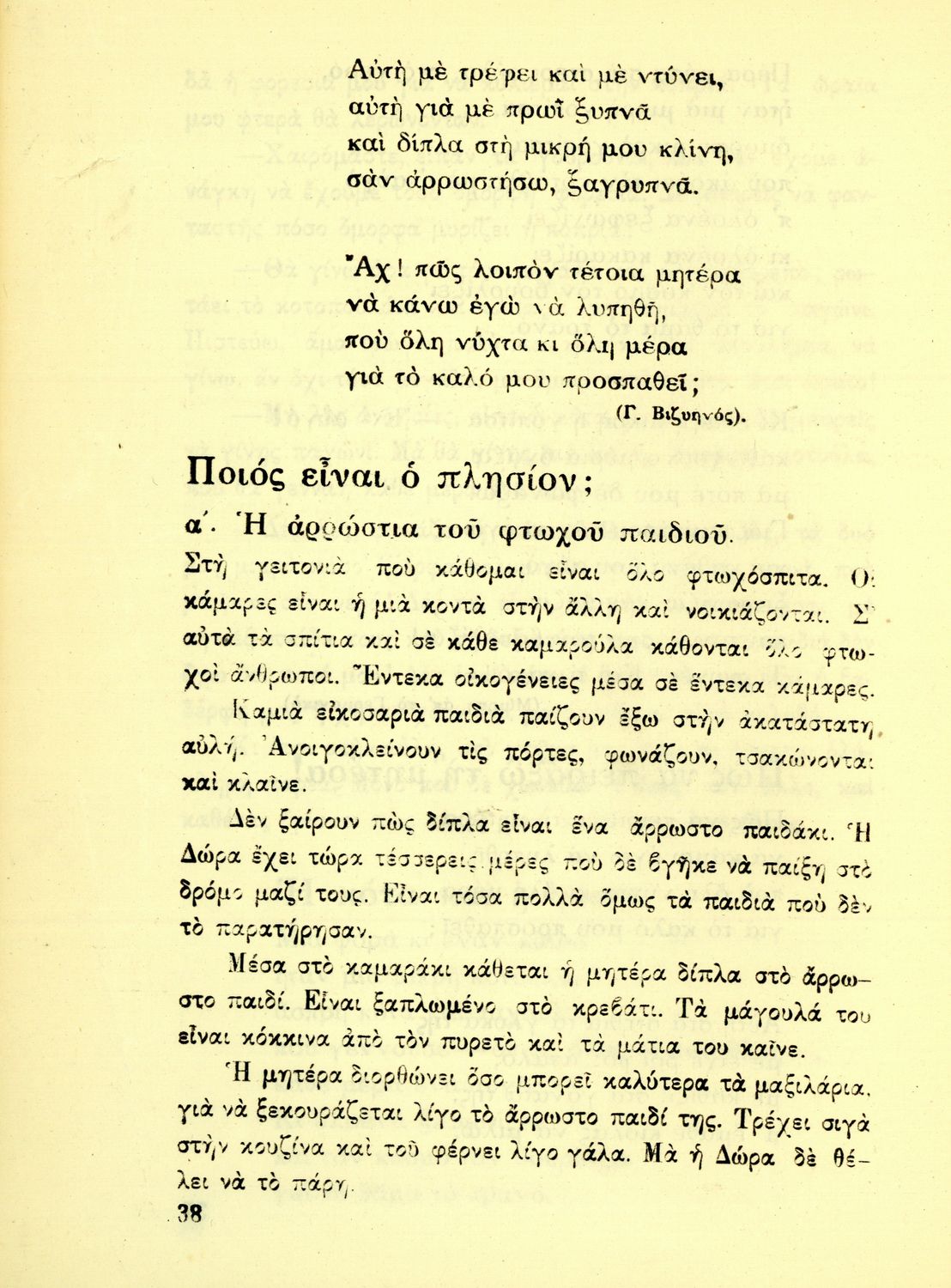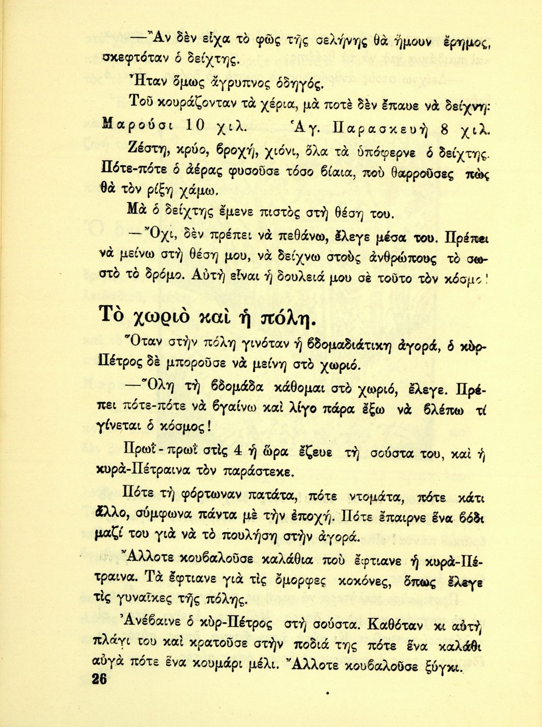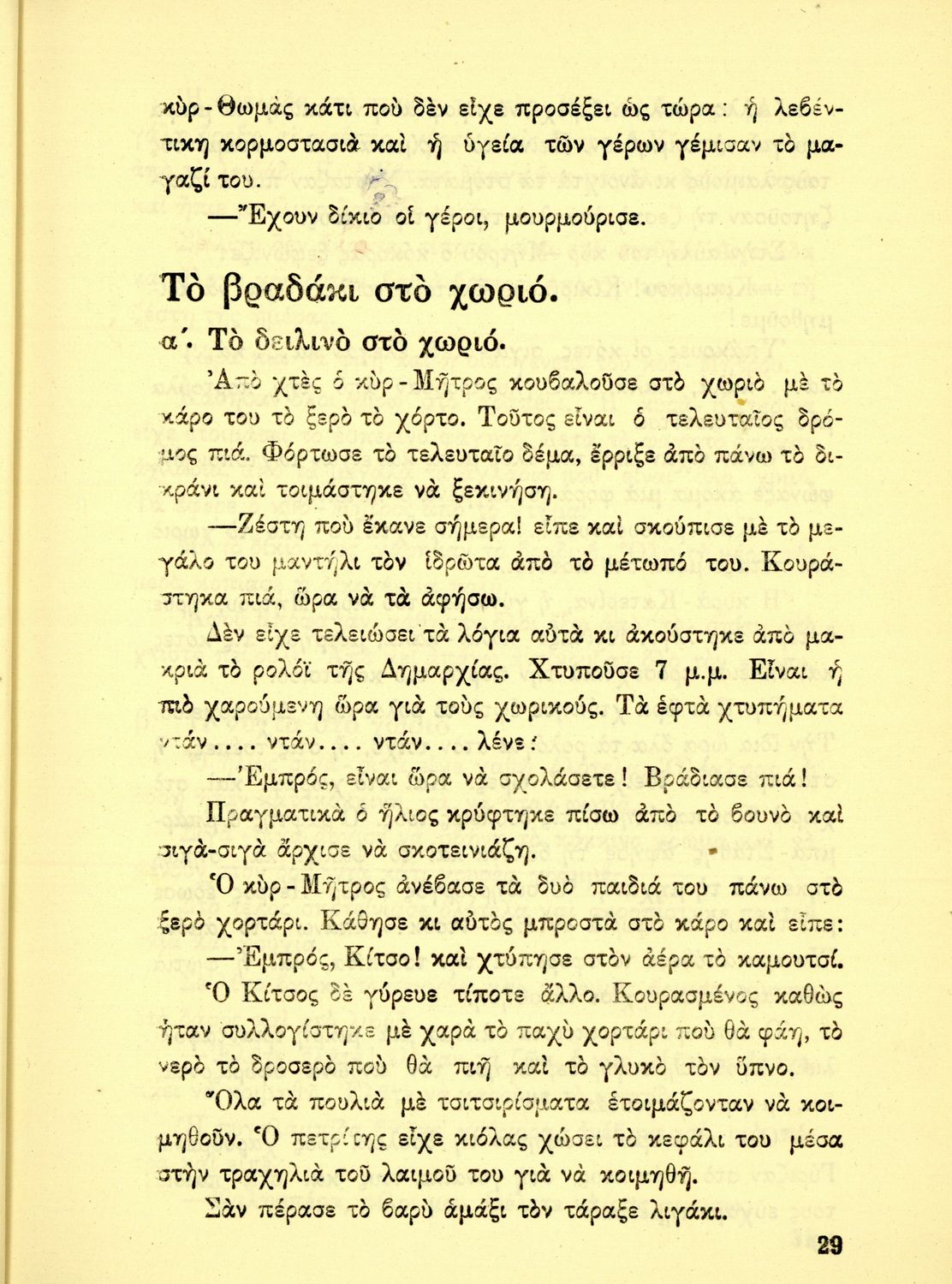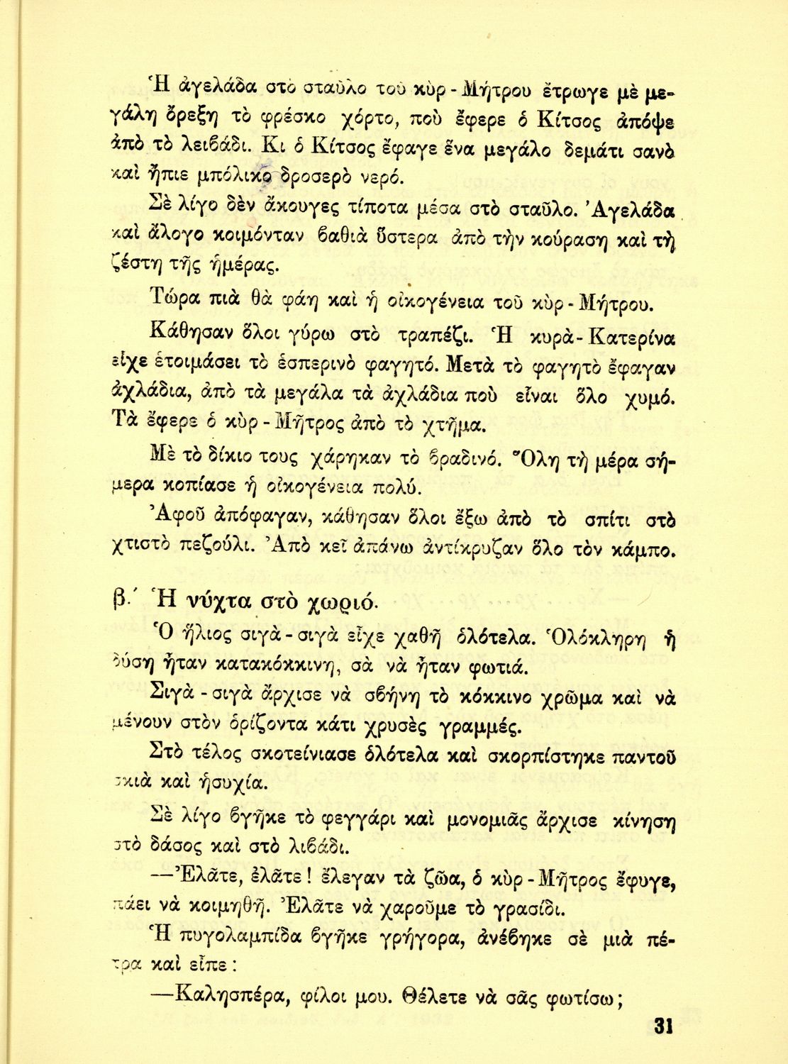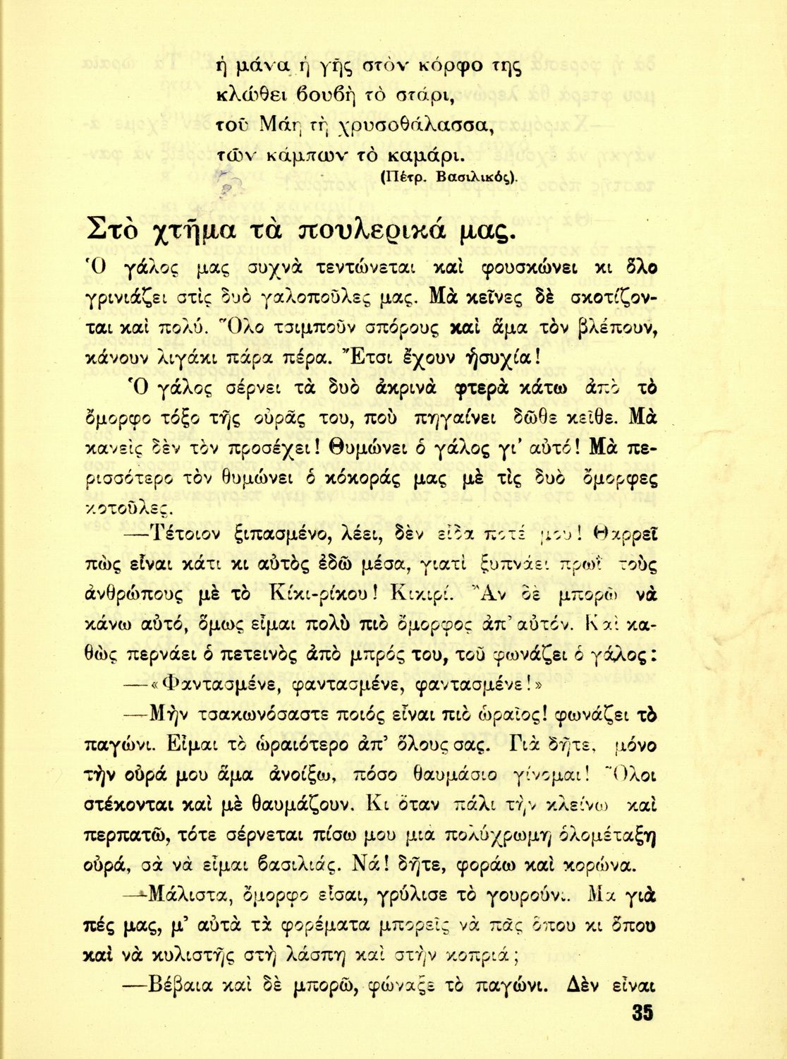 Αναγνωστικό Γ΄ Δημοτικού που περιλαμβάνει ποιήματα και πεζά εμπνευσμένα από τη ζωή της υπαίθρου, την οικογενειακή και κοινωνική ζωή και το εθνικό παρελθόν. Αποτυπώνει τις ιδεολογικές προκείμενες του μεταξικού ...