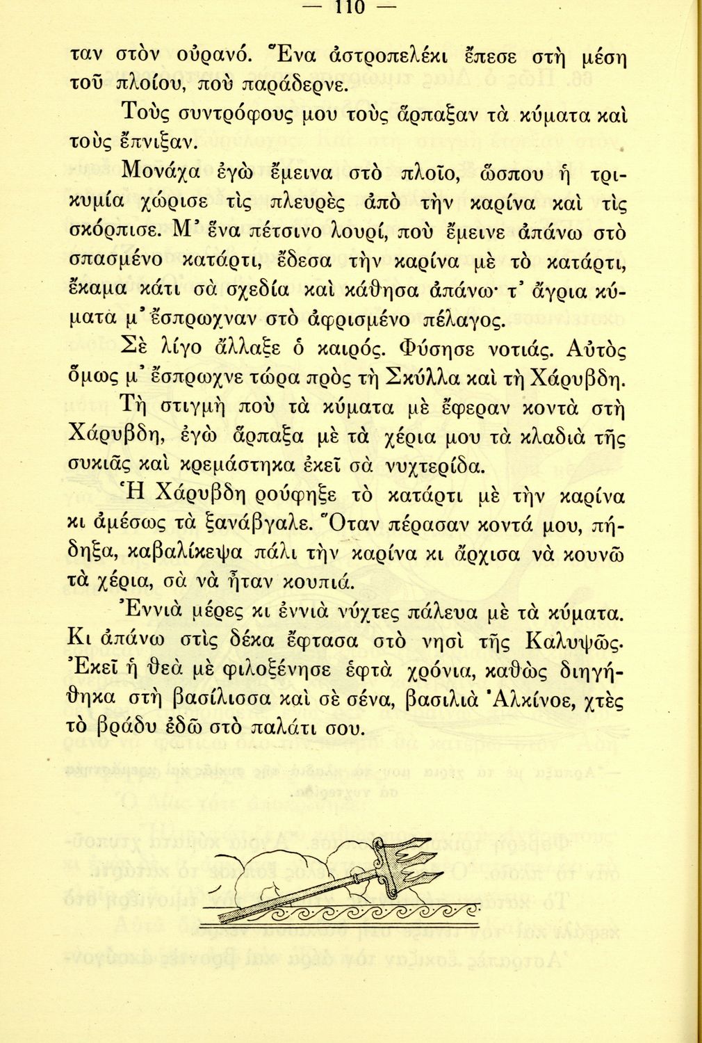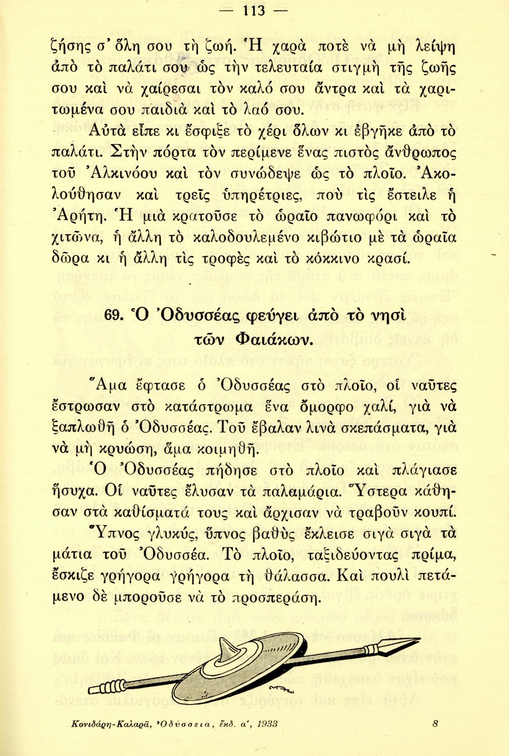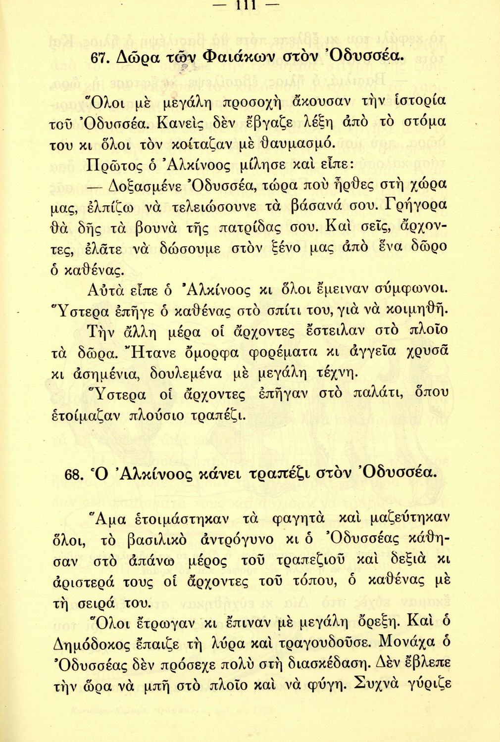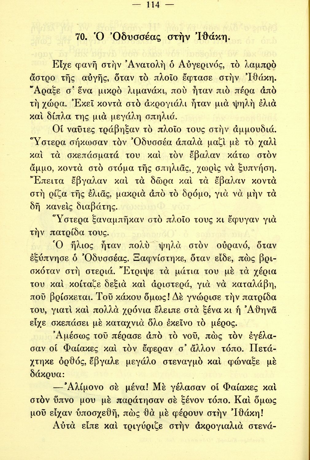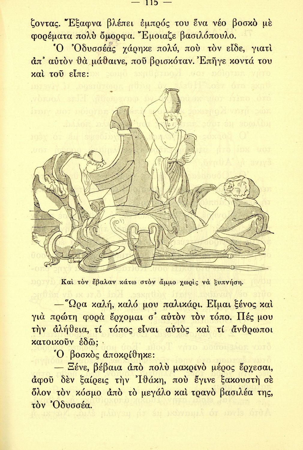 Αναγνωστικό Γ' Δημοτικού που εξιστορεί τις περιπέτειες του Οδυσσέα. Περιέχει παράρτημα με ποιήματα εμπνευσμένα από τον εθνικό, θρησκευτικό και κοινωνικό βίο, τα επαγγέλματα και τις καθημερινές ασχολίες, την αγάπη για την φύση και το περιβάλλον.