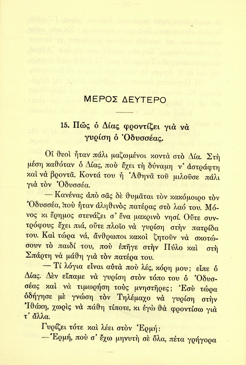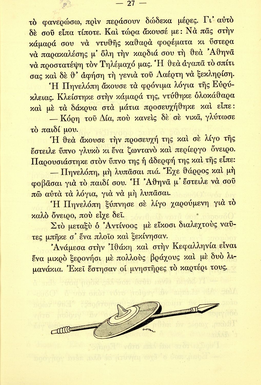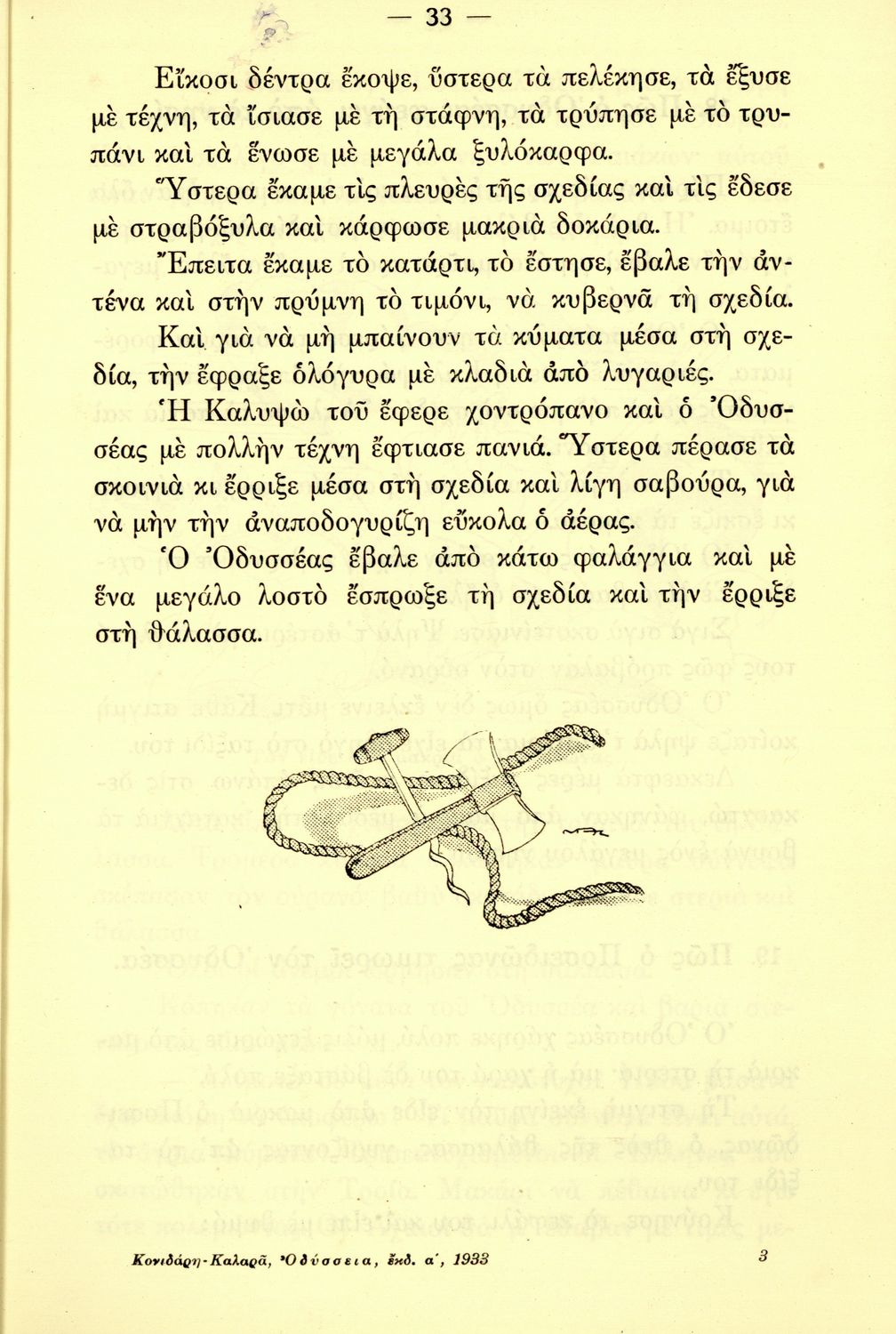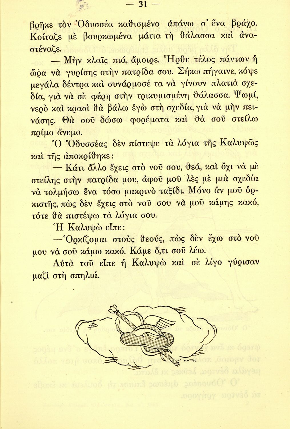 Αναγνωστικό Γ' Δημοτικού που εξιστορεί τις περιπέτειες του Οδυσσέα. Περιέχει παράρτημα με ποιήματα εμπνευσμένα από τον εθνικό, θρησκευτικό και κοινωνικό βίο, τα επαγγέλματα και τις καθημερινές ασχολίες, την αγάπη για την φύση και το περιβάλλον.