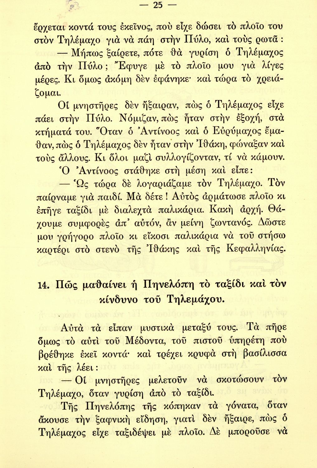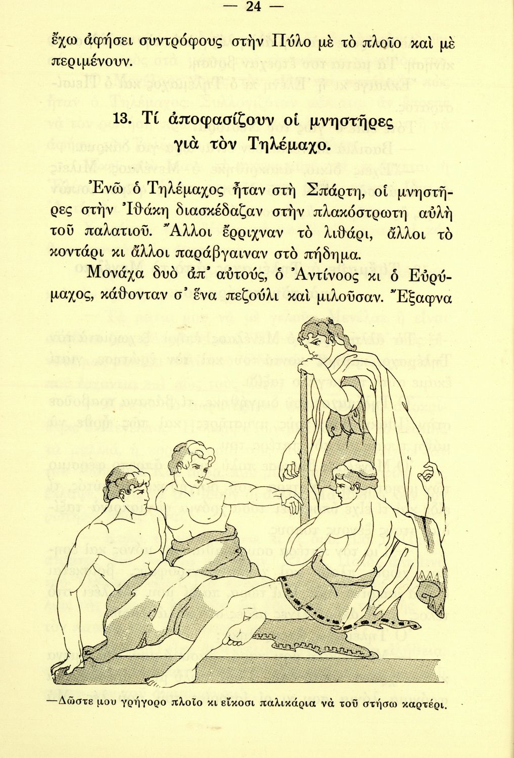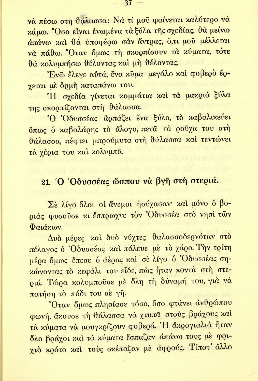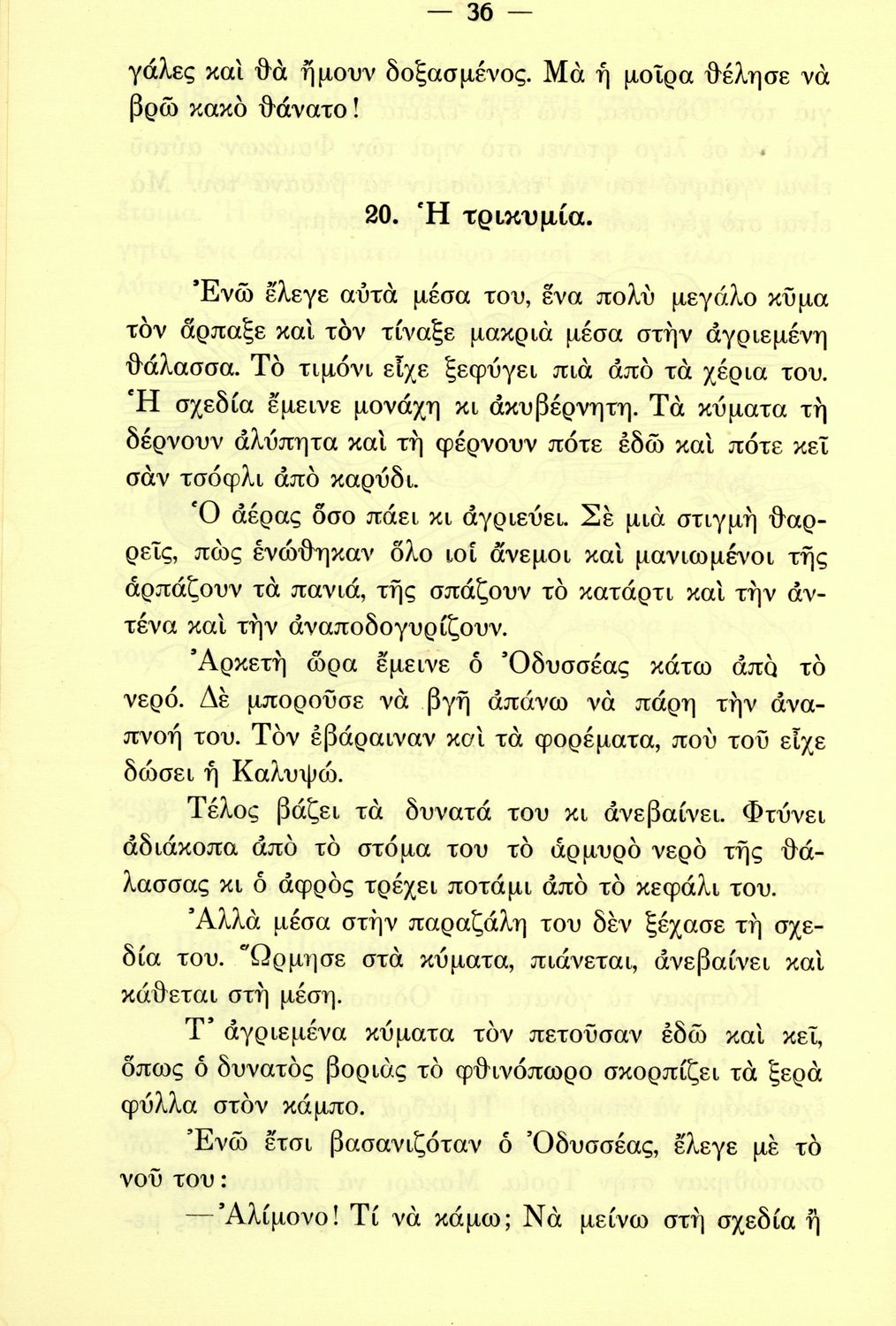 Αναγνωστικό Γ' Δημοτικού που εξιστορεί τις περιπέτειες του Οδυσσέα. Περιέχει παράρτημα με ποιήματα εμπνευσμένα από τον εθνικό, θρησκευτικό και κοινωνικό βίο, τα επαγγέλματα και τις καθημερινές ασχολίες, την αγάπη για την φύση και το περιβάλλον.