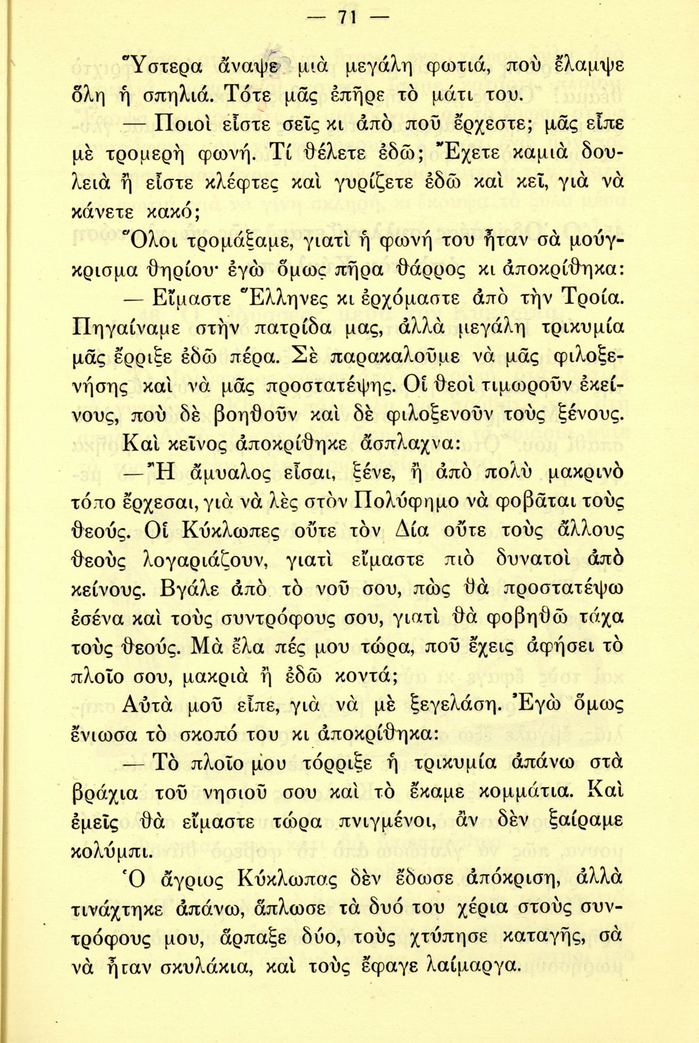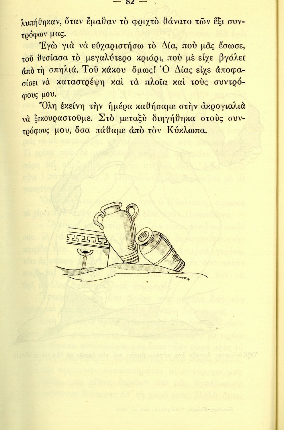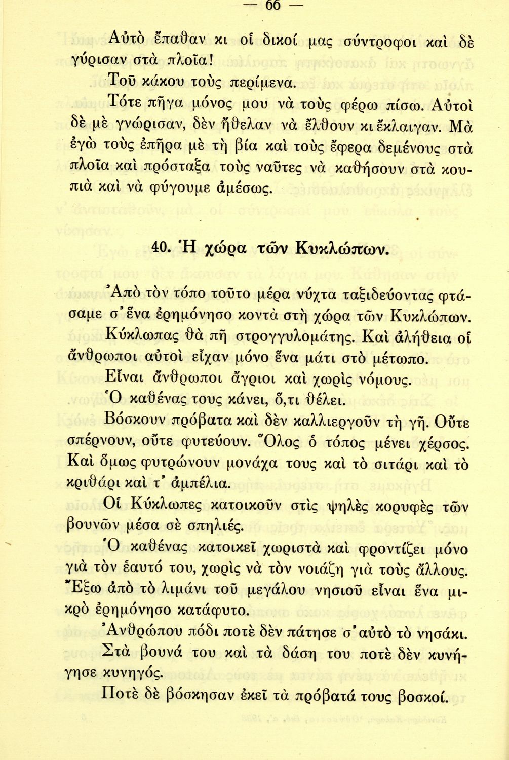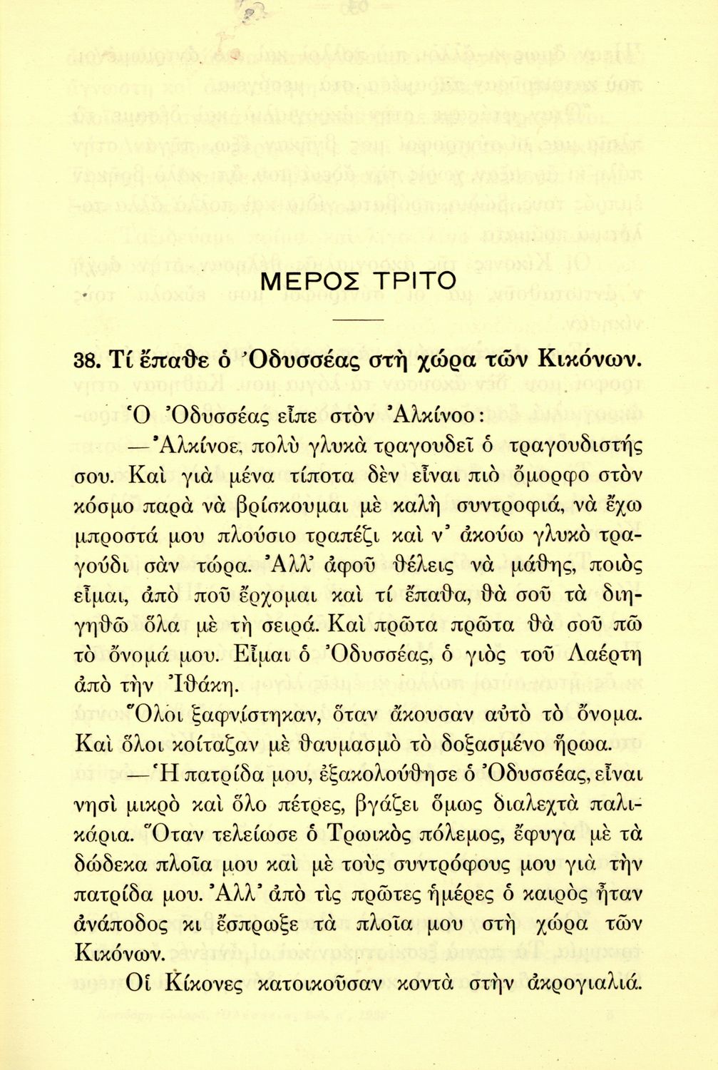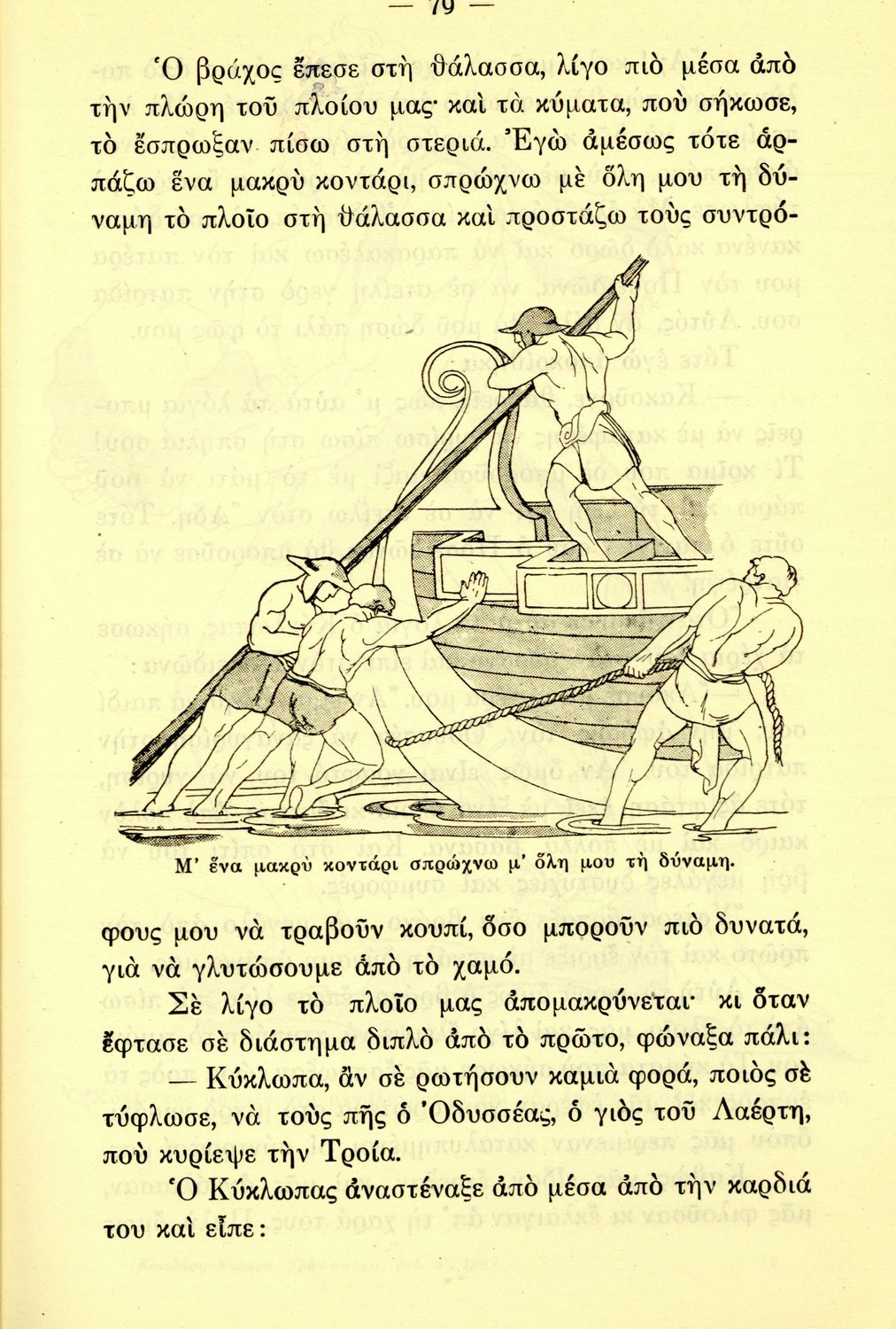 Αναγνωστικό Γ' Δημοτικού που εξιστορεί τις περιπέτειες του Οδυσσέα. Περιέχει παράρτημα με ποιήματα εμπνευσμένα από τον εθνικό, θρησκευτικό και κοινωνικό βίο, τα επαγγέλματα και τις καθημερινές ασχολίες, την αγάπη για την φύση και το περιβάλλον.