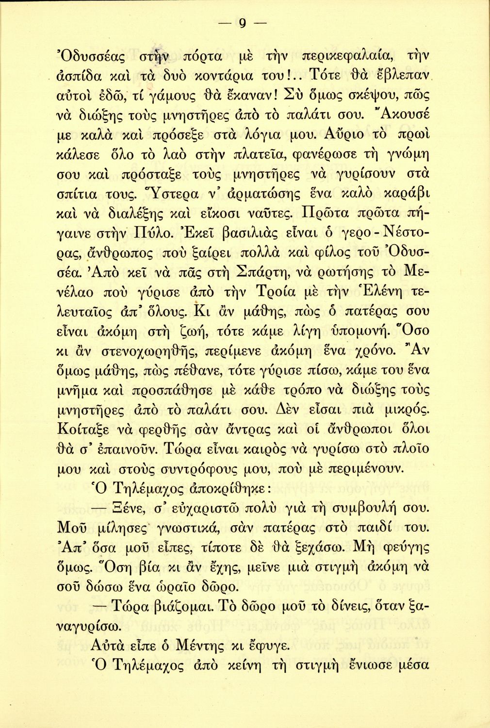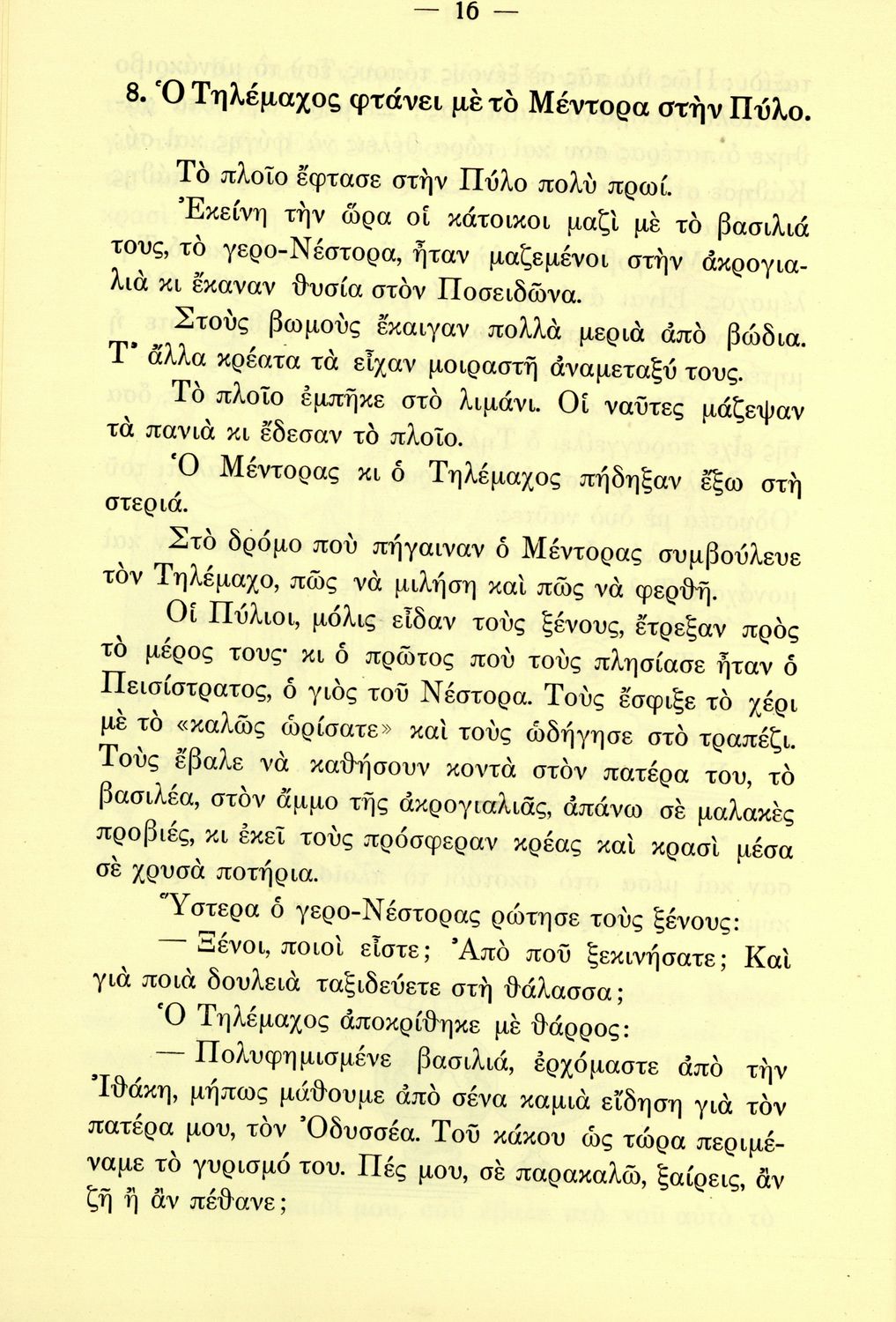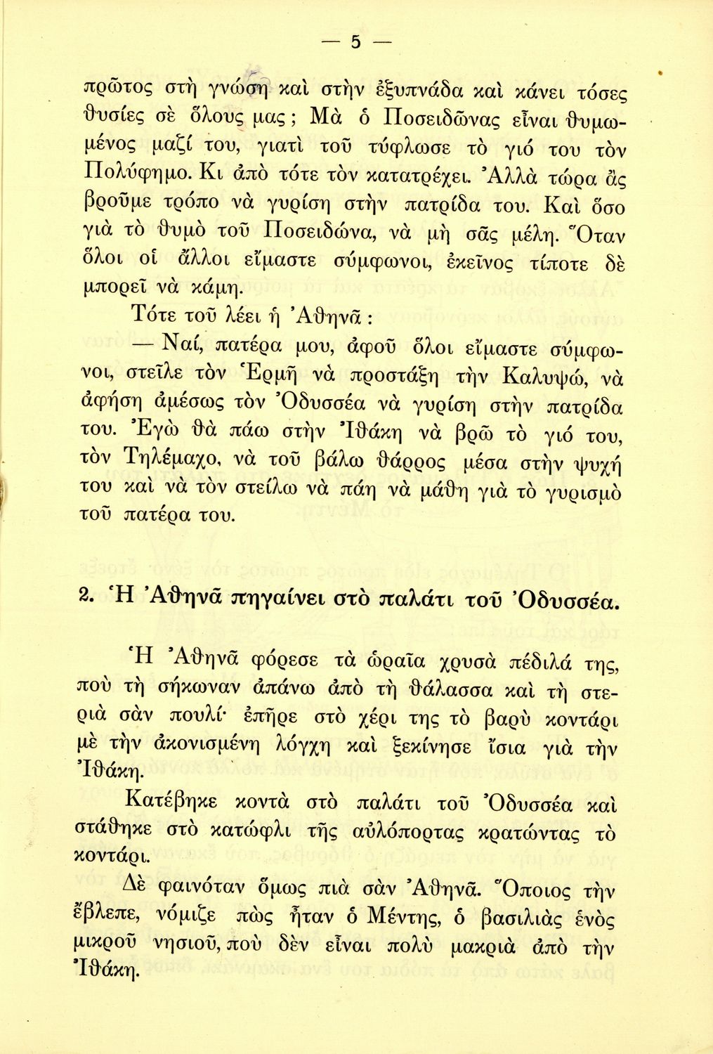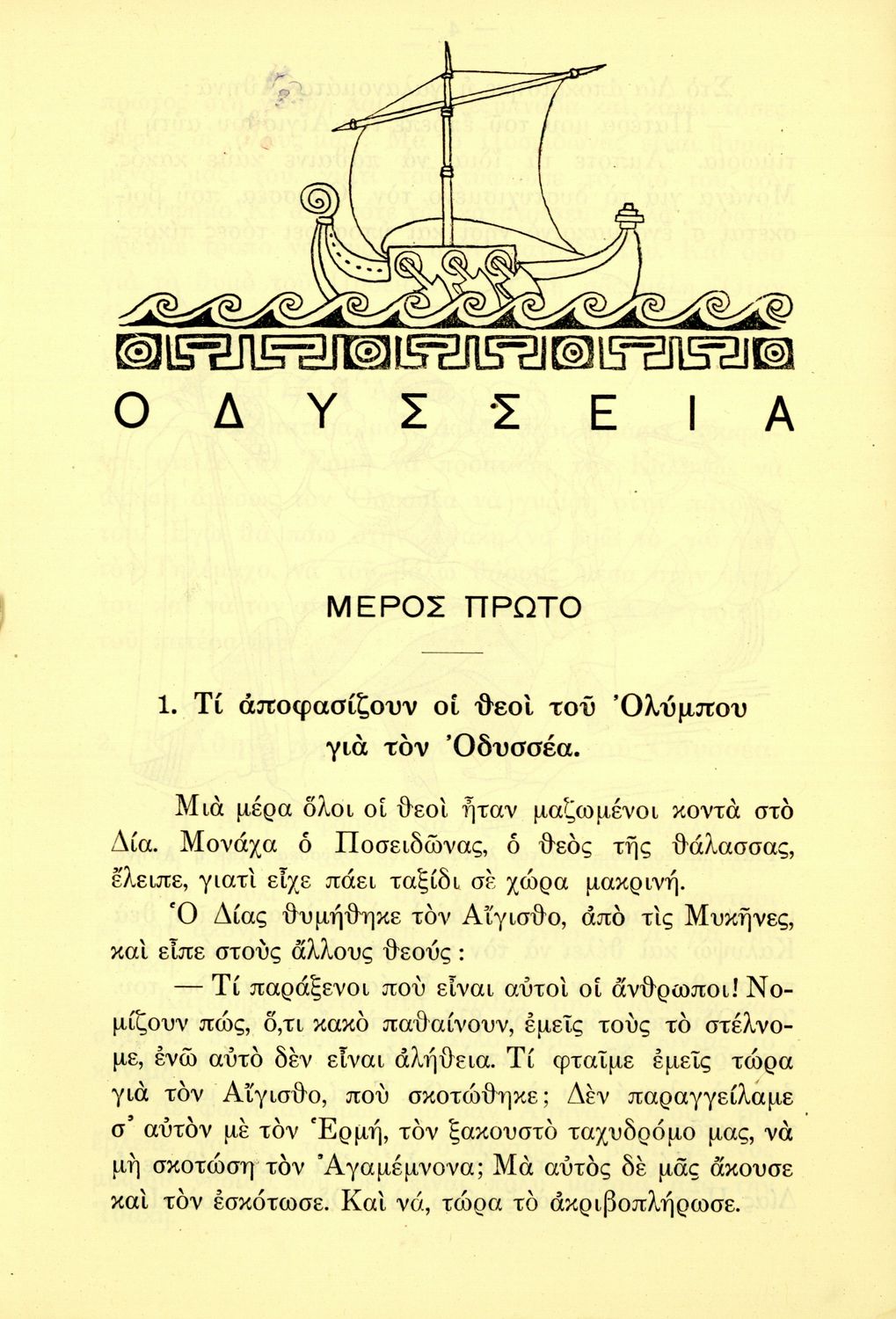 Αναγνωστικό Γ' Δημοτικού που εξιστορεί τις περιπέτειες του Οδυσσέα. Περιέχει παράρτημα με ποιήματα εμπνευσμένα από τον εθνικό, θρησκευτικό και κοινωνικό βίο, τα επαγγέλματα και τις καθημερινές ασχολίες, την αγάπη για την φύση και το περιβάλλον.