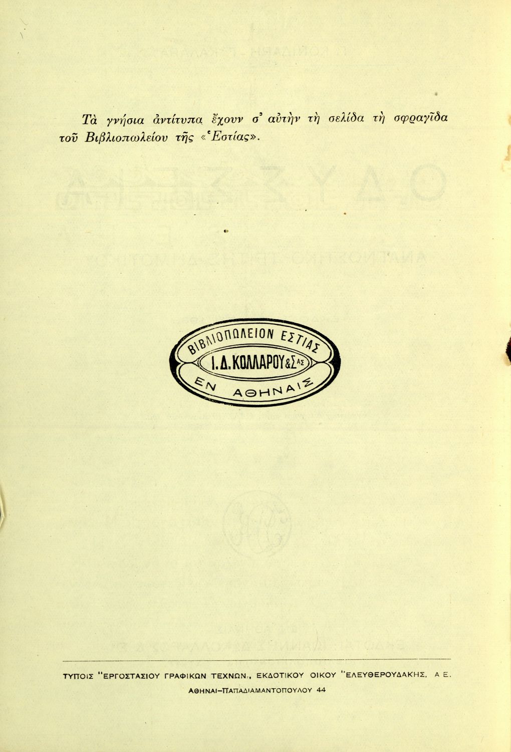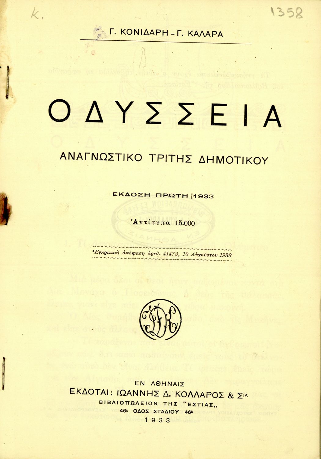 Εκδότης: Ιωάννης Δ. Κολλάρος και ΣΙΑ, Βιβλιοπωλείο της "Εστίας" Έτος έκδοσης: 1933 Τόπος έκδοσης: Αθήνα Έκδοση: 1η Υπουργική απόφαση / Σύμβαση: 41473/10-8-1933 Έτος έγκρισης: 1933 |