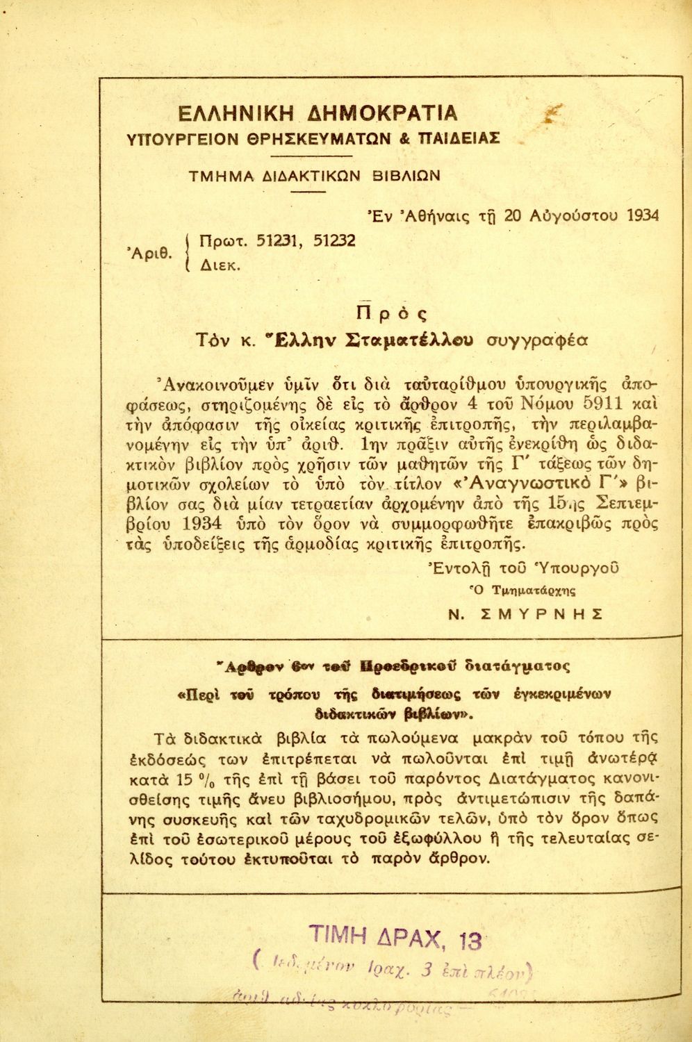 Εκδότης: Ιωάννης Δ. Κολλάρος και ΣΙΑ, Βιβλιοπωλείο της "Εστίας" Έτος έκδοσης: 1934 Τόπος έκδοσης: Αθήνα Έκδοση: 2η Υπουργική απόφαση / Σύμβαση: 51231/51232/20-8-1934 Έτος έγκρισης: 1934 |