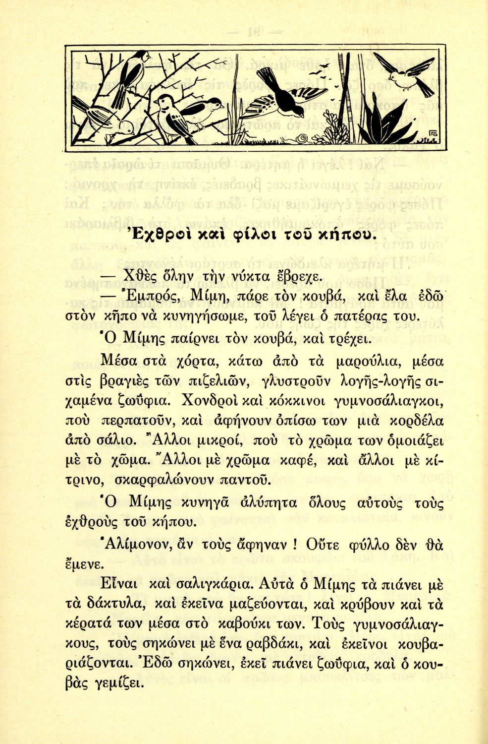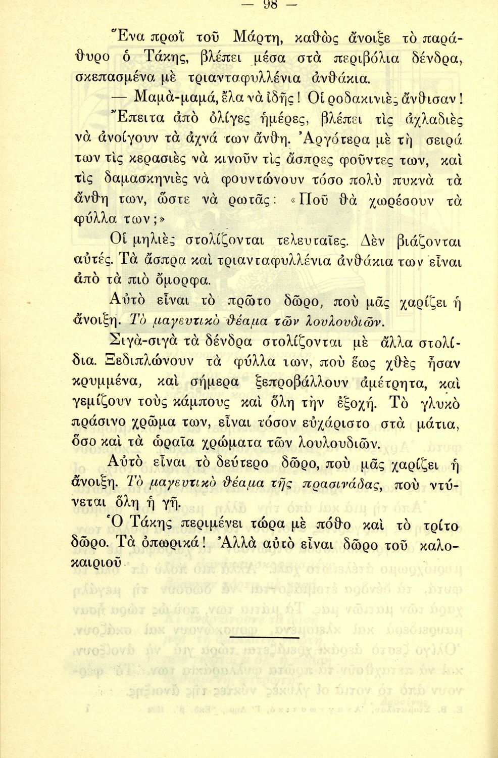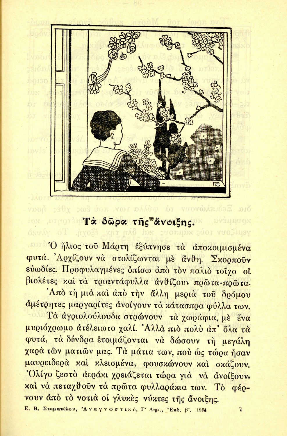 Αναγνωστικό για τους μαθητές της Γ' Δημοτικού. Περιέχει προσευχές, κείμενα με θέματα από τη φύση και την ελληνική μυθολογία.