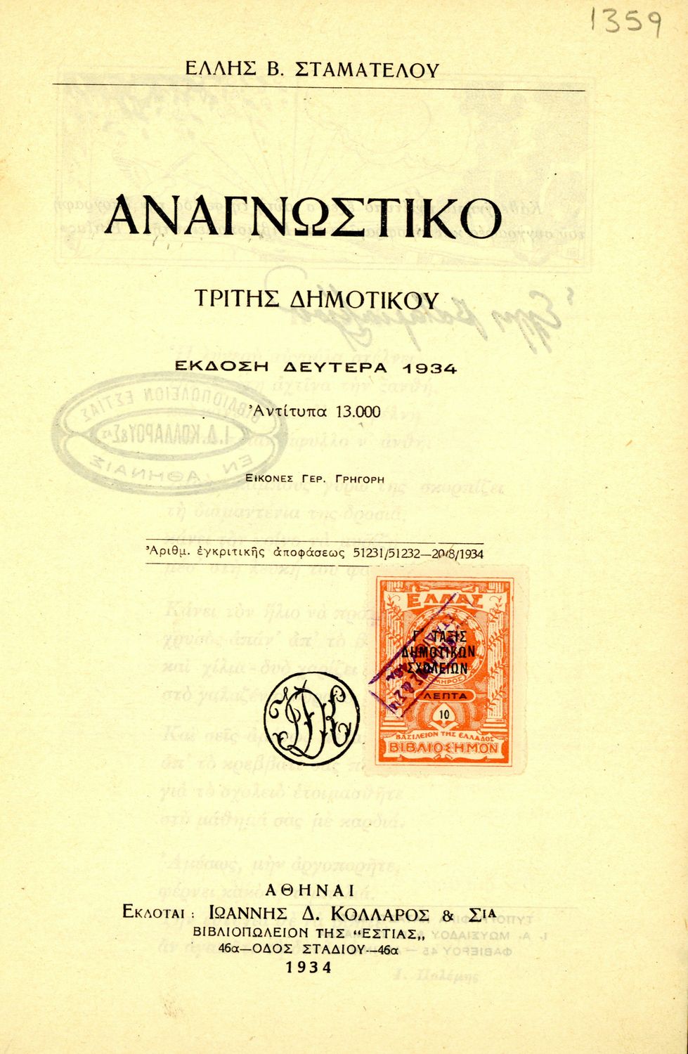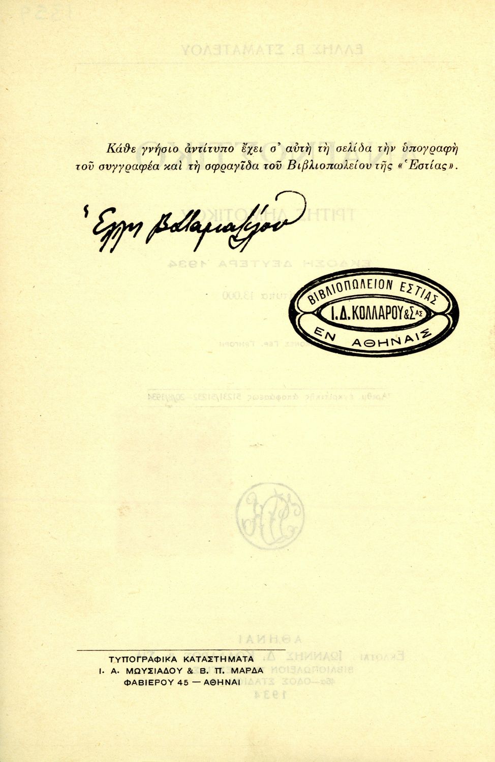 Εκδότης: Ιωάννης Δ. Κολλάρος και ΣΙΑ, Βιβλιοπωλείο της "Εστίας"
