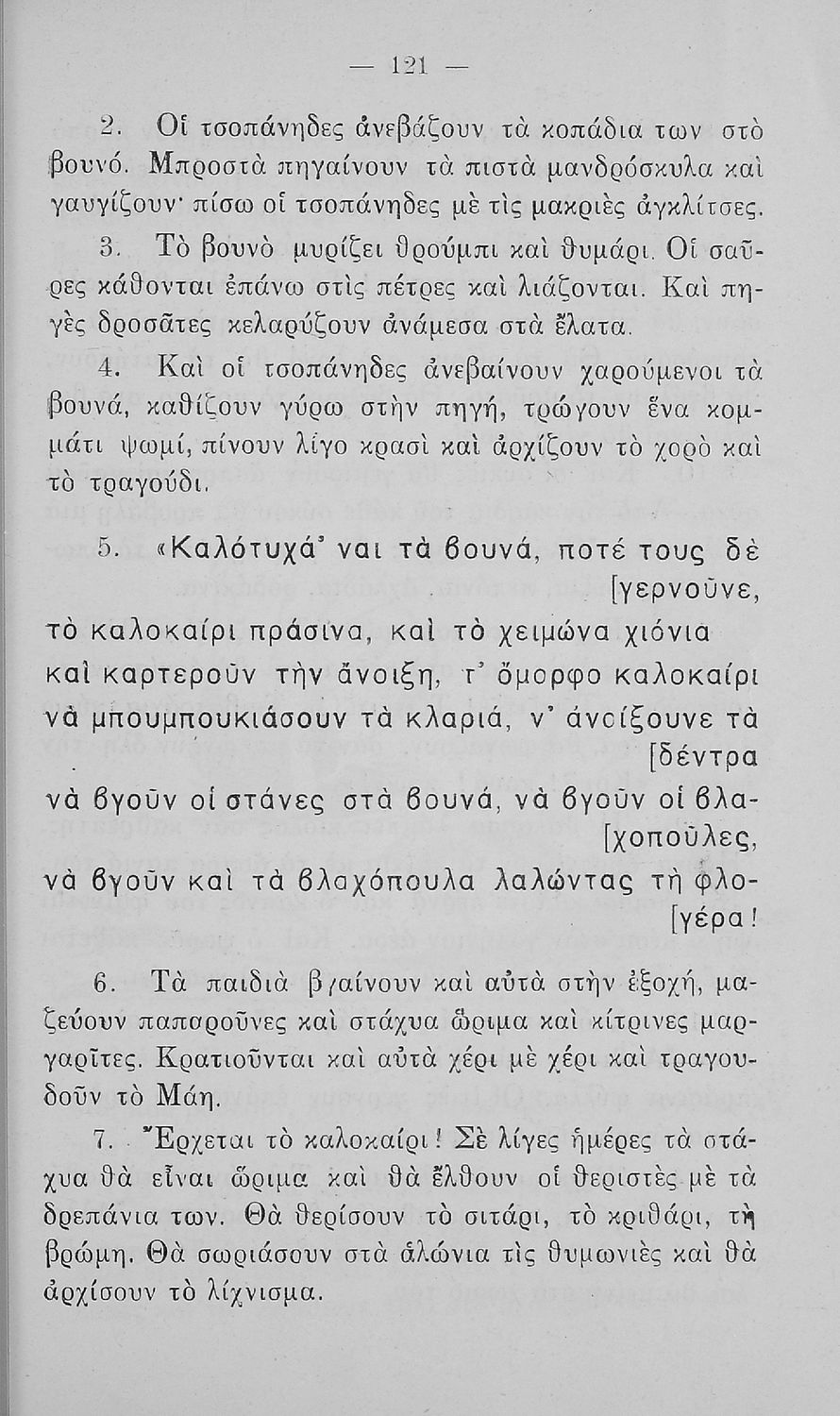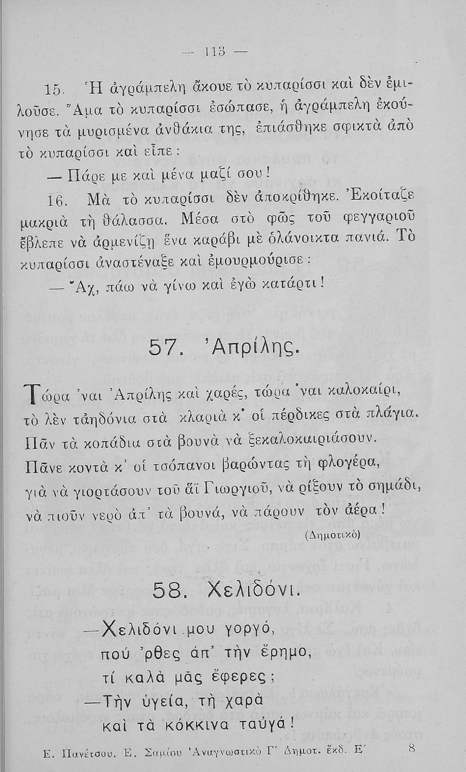 Αναγνωστικό Γ' Δημοτικού που περιέχει πεζά και ποιήματα ηθικοπλαστικού περιεχομένου εμπνευσμένα από τη θρησκευτική, εθνική, κοινωνική και ατομική ζωή, την ελληνική φύση, ιστορία και μυθολογία και την υγιεινή.