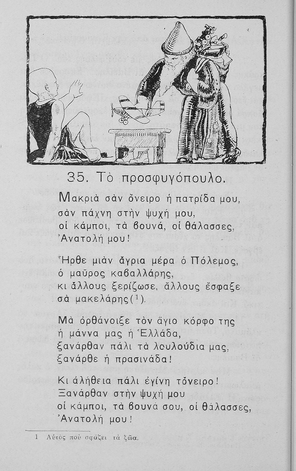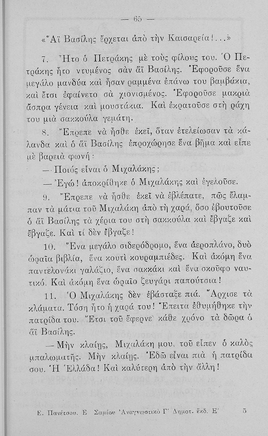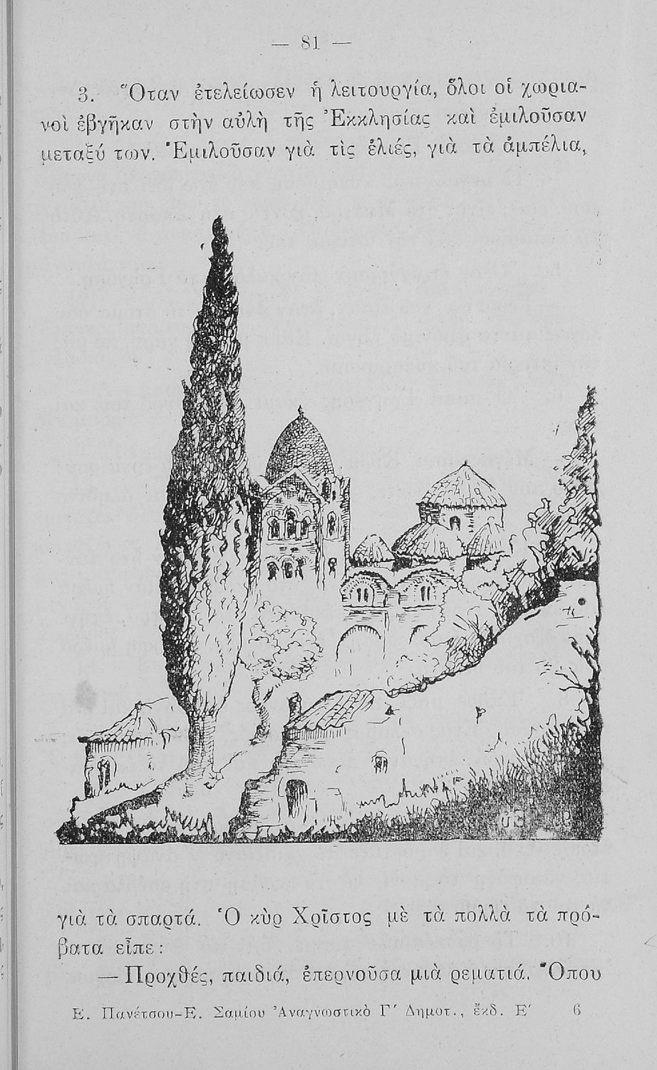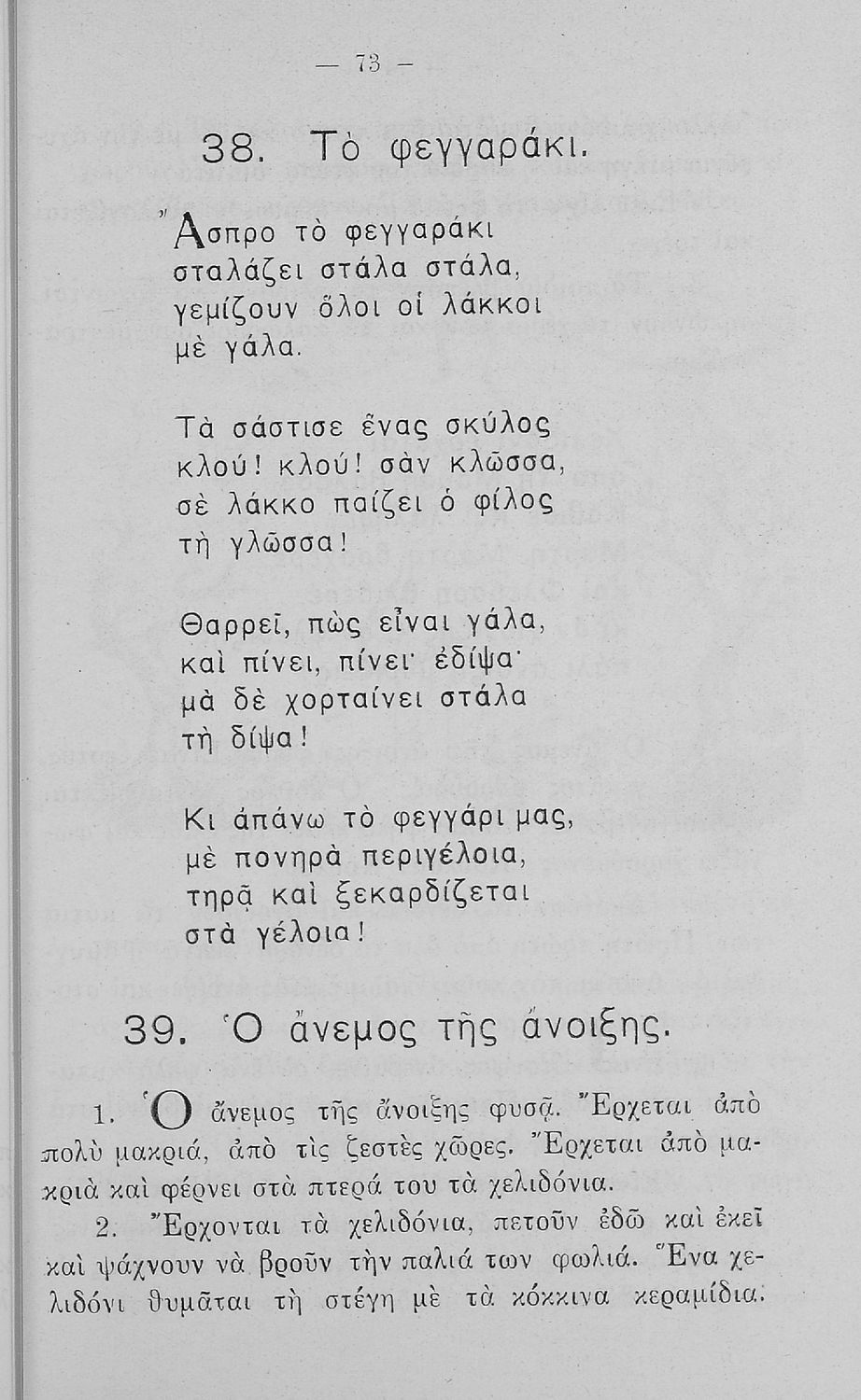 Αναγνωστικό Γ' Δημοτικού που περιέχει πεζά και ποιήματα ηθικοπλαστικού περιεχομένου εμπνευσμένα από τη θρησκευτική, εθνική, κοινωνική και ατομική ζωή, την ελληνική φύση, ιστορία και μυθολογία και την υγιεινή.
