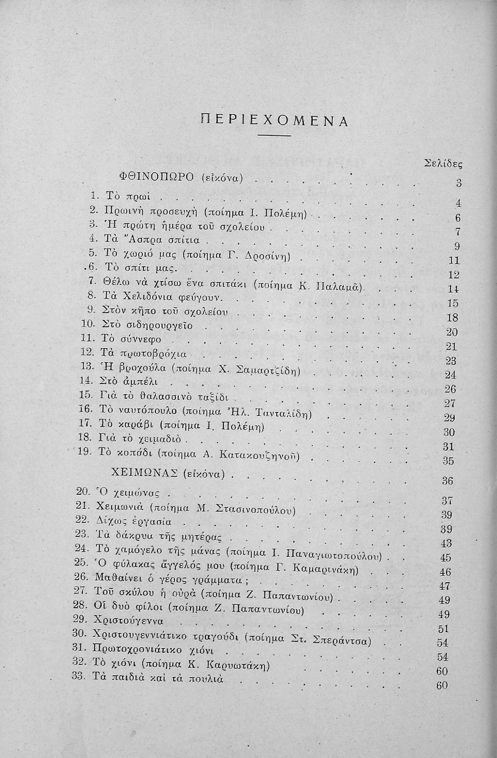 Αναγνωστικό Γ' Δημοτικού που είναι χωρισμένο σύμφωνα με τις εποχές του χρόνου και περιλαμβάνει ποιήματα και πεζά εμπνευσμένα από τη ζωή στην ύπαιθρο, την εθνική, οικογενειακή και κοινωνική ζωή, τη θρησκευτική ...