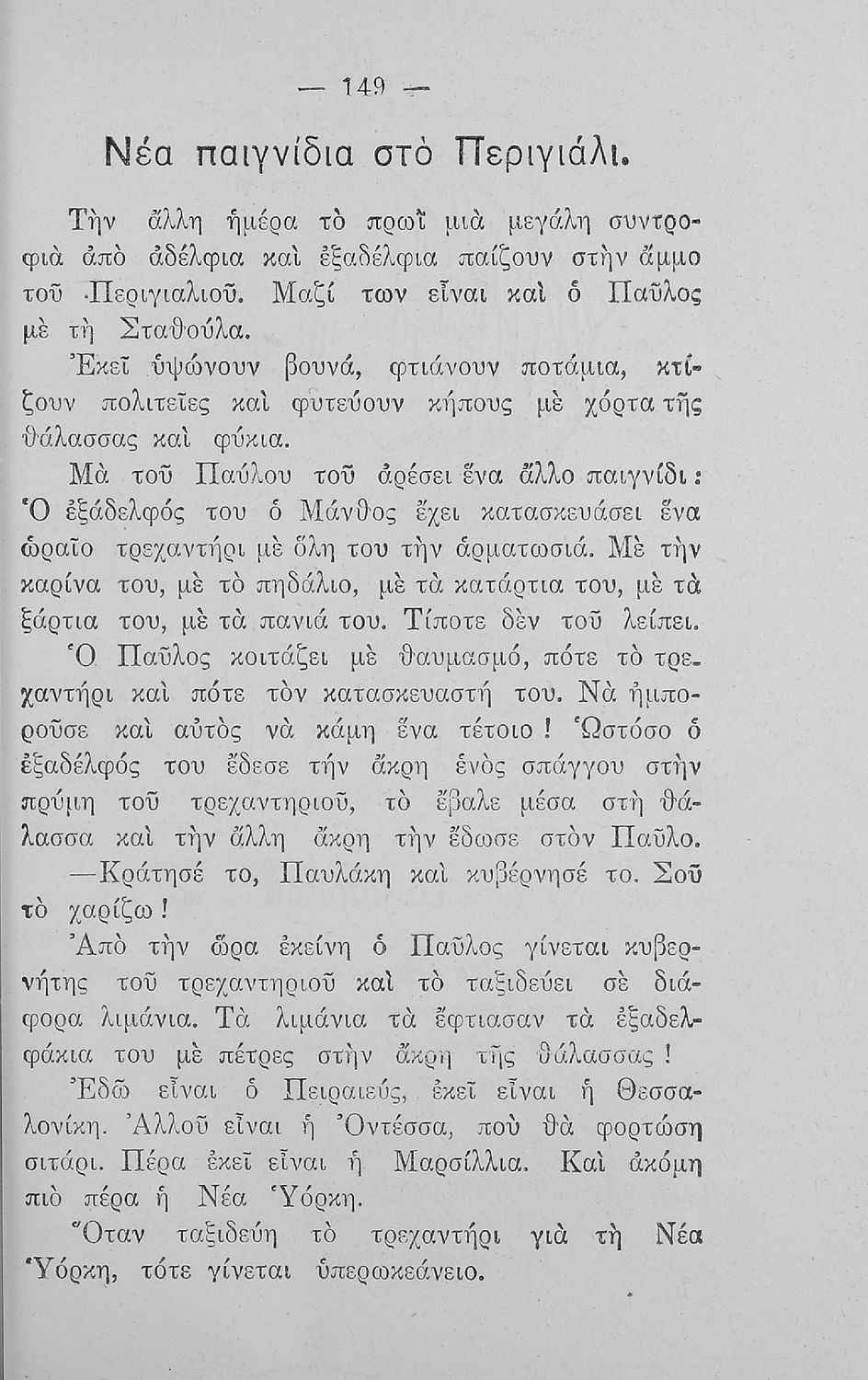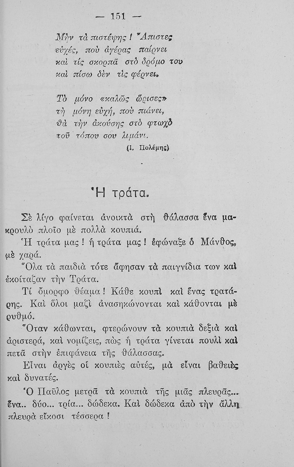 Αναγνωστικό που περιλαμβάνει διηγήματα εμπνευσμένα από τον Τρωικό Πόλεμο και αποσκοπεί να διδάξει στους ελληνόπαιδες "ότι προς ταις αρεταίς της ειρήνης υπάρχουσι και αρεταίς του πολέμου, η αρετή της πειθαρχίας