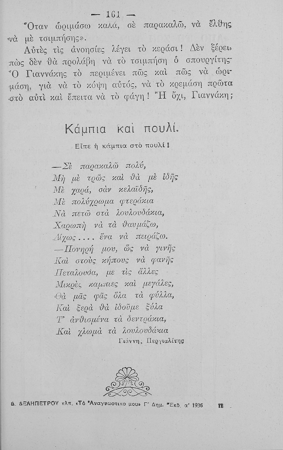 Αναγνωστικό Γ΄ Δημοτικού που περιλαμβάνει ποιήματα και πεζά με θέματα όπως η καλή και κακή συναναστροφή, η φρόνηση, η οκνηρία, η φιλανθρωπία και η πίστη στο Θεό
