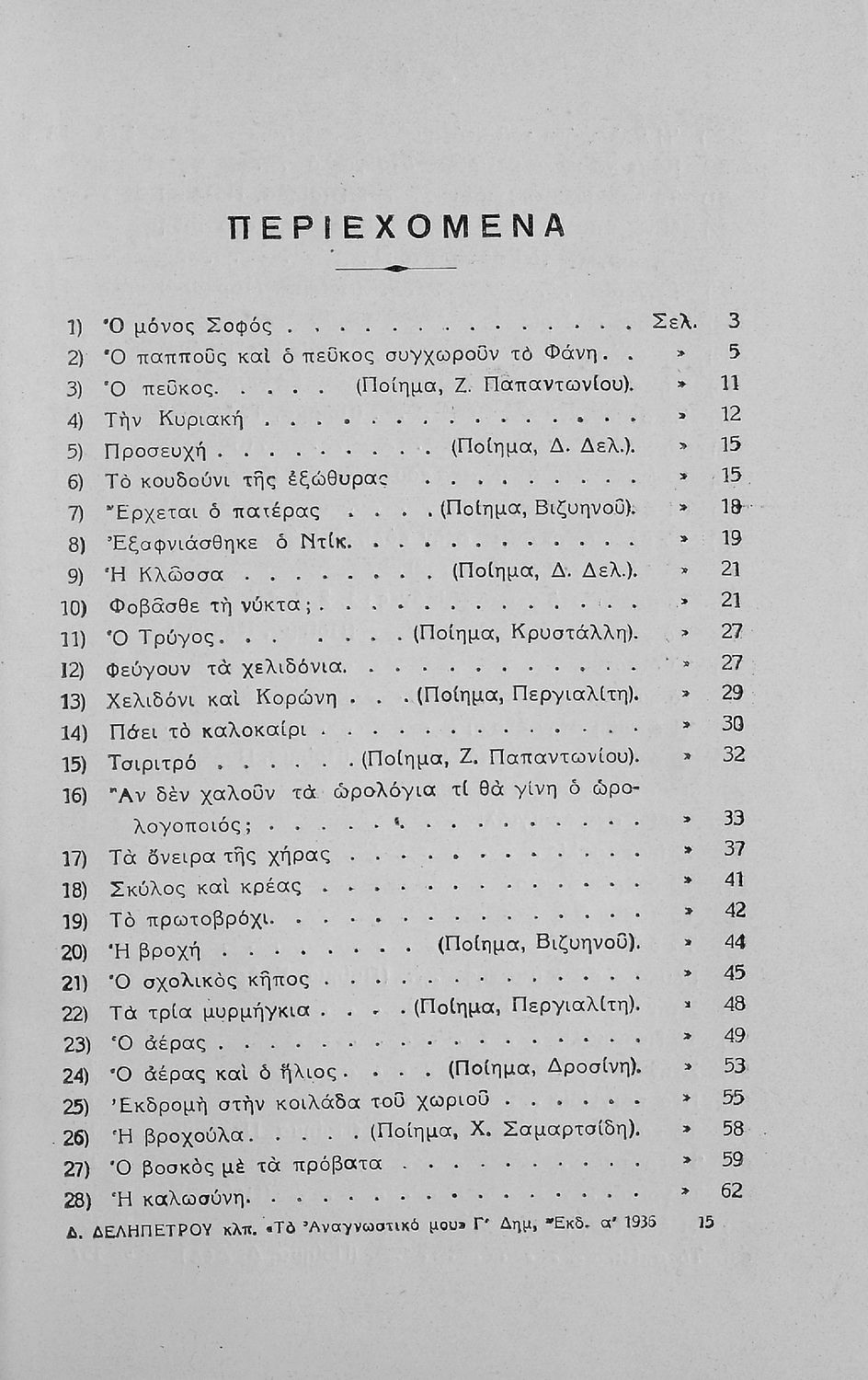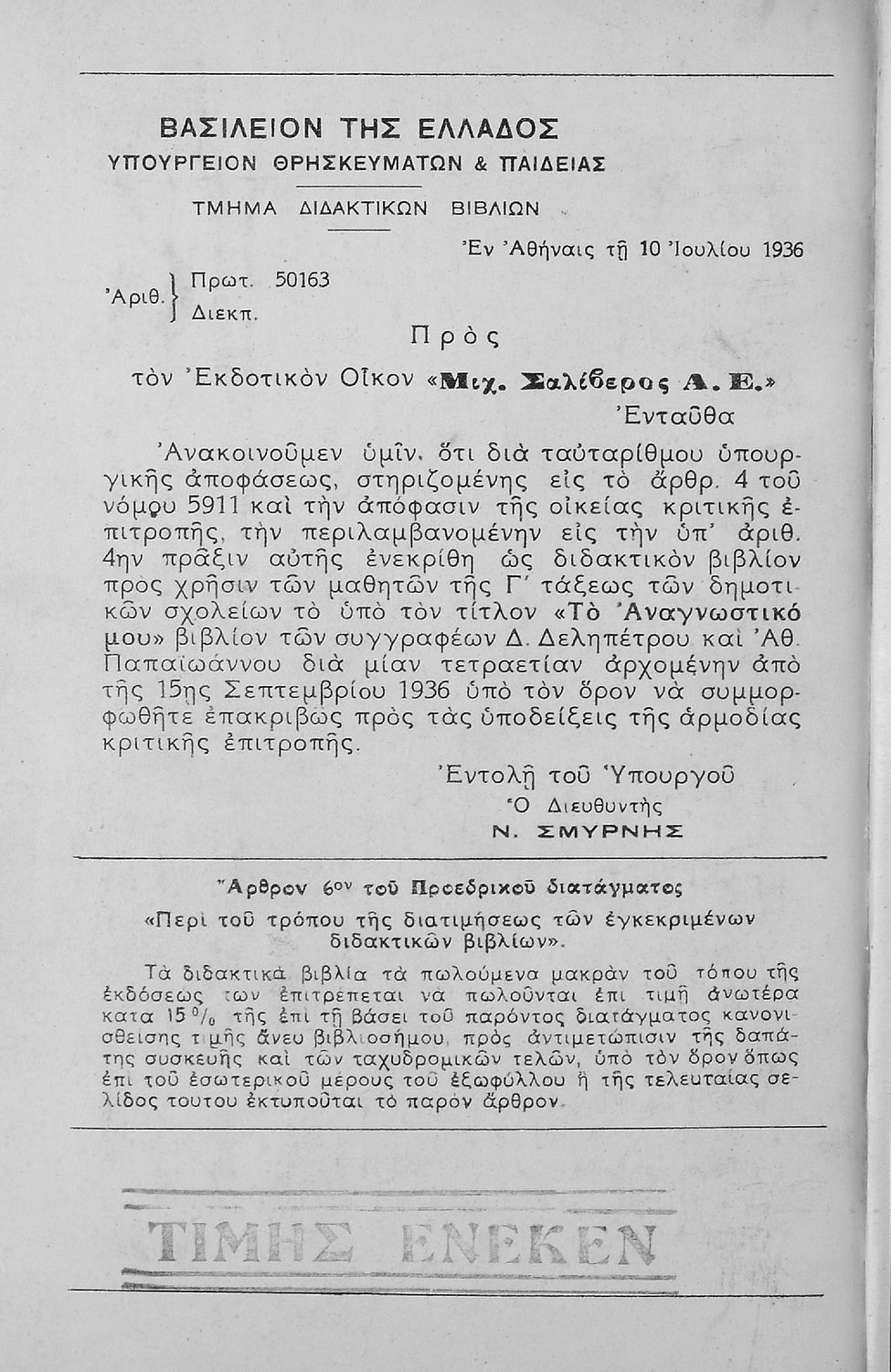 Εκδότης: Μιχαήλ Ι. Σαλίβερος Έτος έκδοσης: 1936 Τόπος έκδοσης: Αθήνα Έκδοση: 1η Υπουργική απόφαση / Σύμβαση: 50163/ 10-7-1936 Έτος έγκρισης: 1936 |