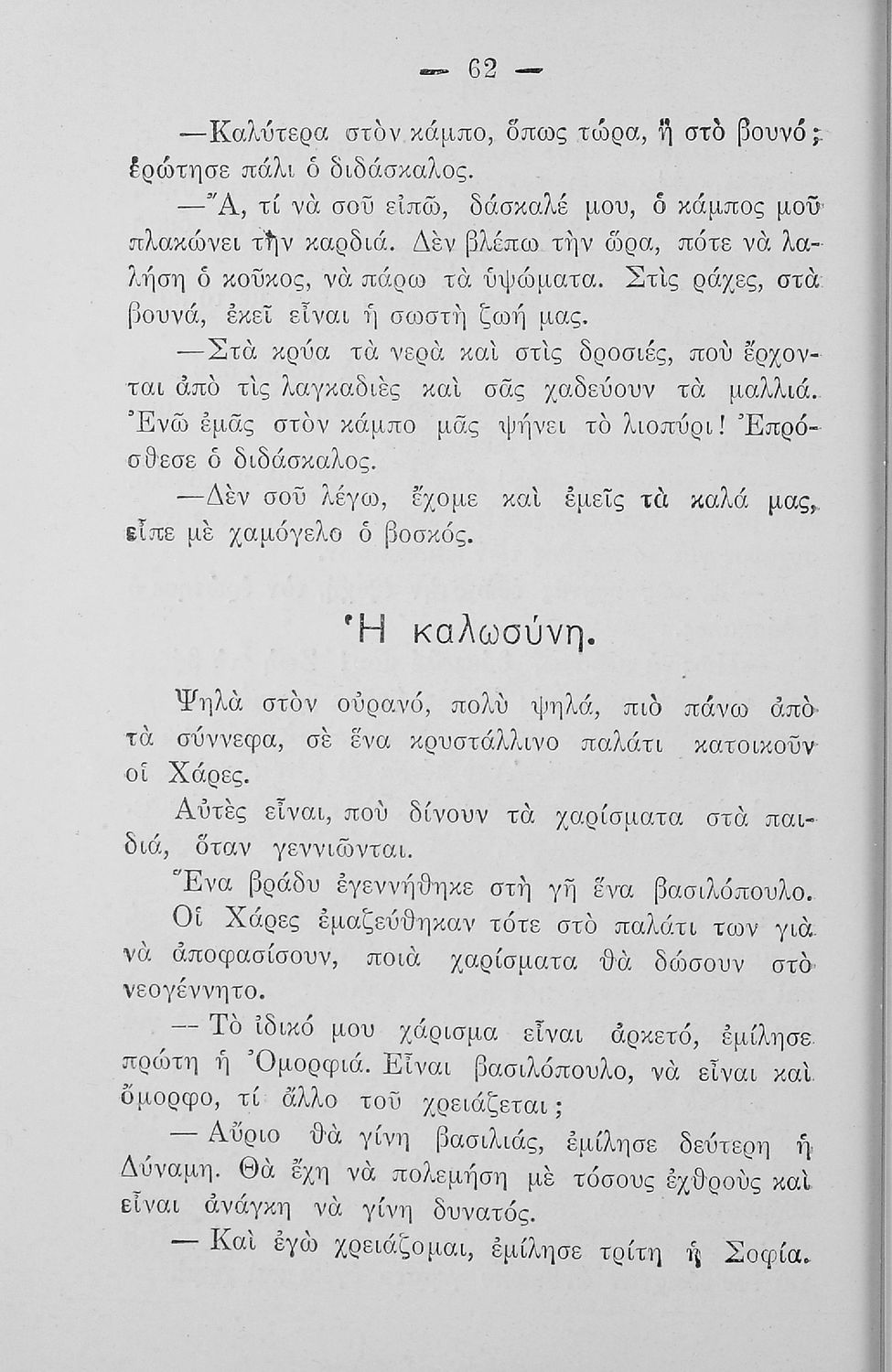 Αναγνωστικό Γ΄ Δημοτικού που περιλαμβάνει ποιήματα και πεζά με θέματα όπως η καλή και κακή συναναστροφή, η φρόνηση, η οκνηρία, η φιλανθρωπία και η πίστη στο Θεό