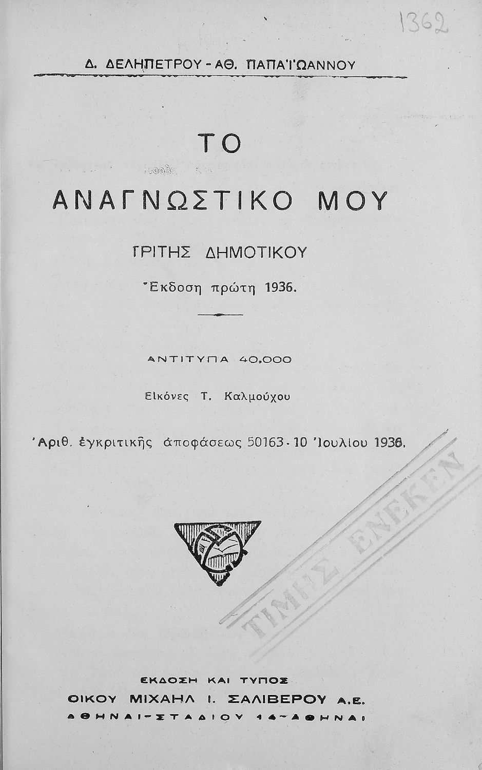 Εκδότης: Μιχαήλ Ι. Σαλίβερος Έτος έκδοσης: 1936 Τόπος έκδοσης: Αθήνα Έκδοση: 1η Υπουργική απόφαση / Σύμβαση: 50163/ 10-7-1936 Έτος έγκρισης: 1936 |