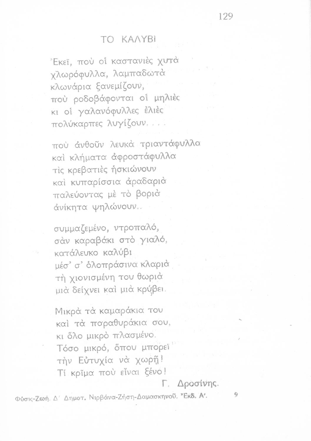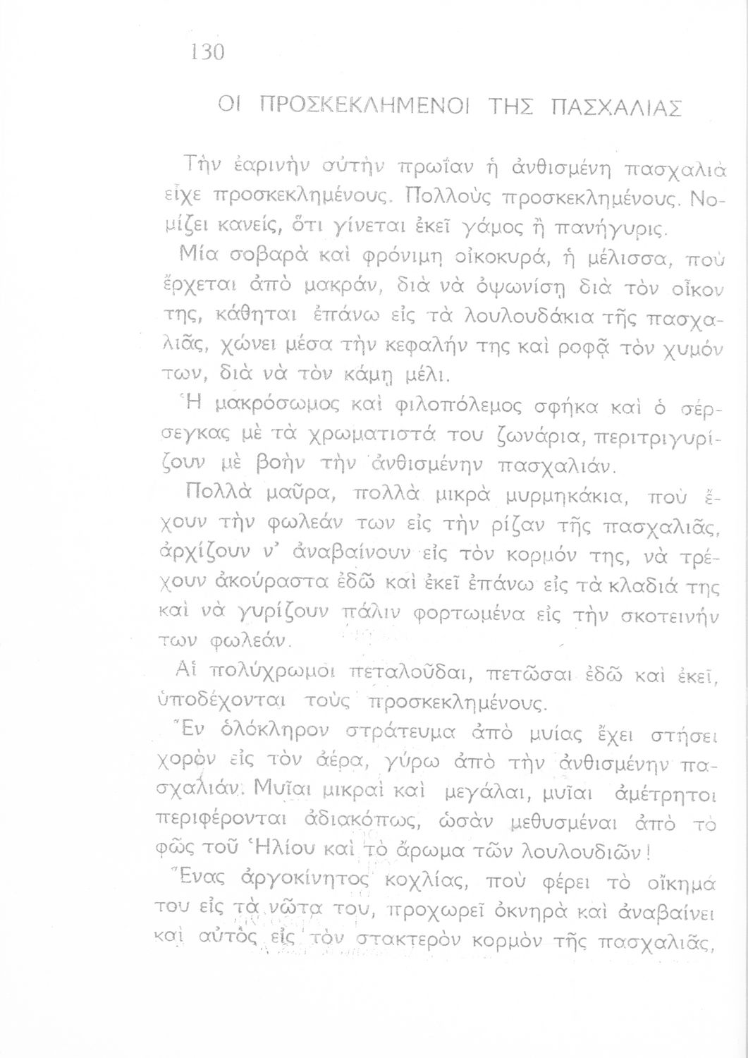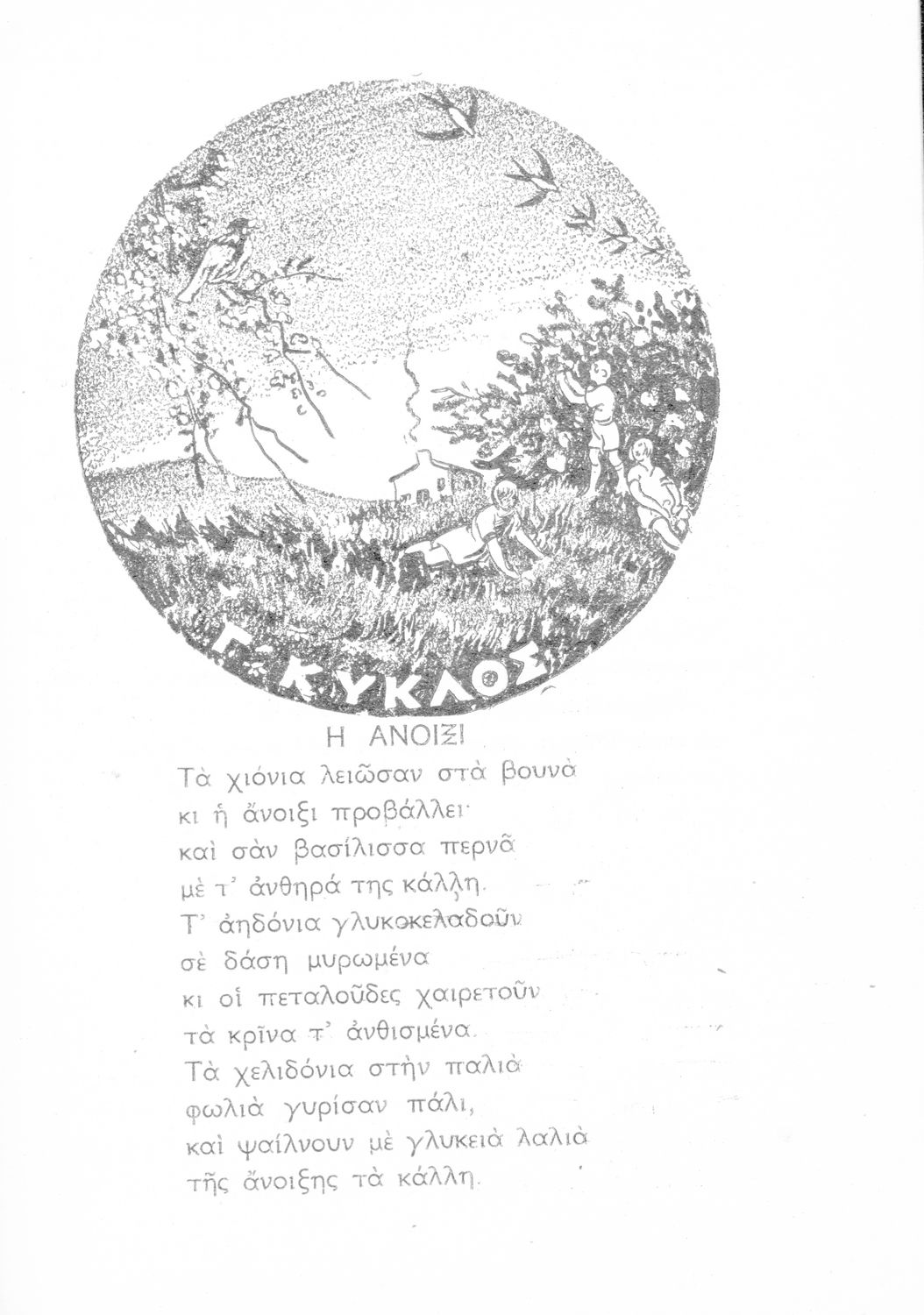 Σχολικό εγχειρίδιο Νέων Ελληνικών Δ΄ Γυμνασίου Θηλέων που περιλαμβάνει πεζά, ποιήματα και δημοτικά τραγούδια εμπνευσμένα από την σύγχρονη ελληνική ιστορία και την οικογενειακή και θρησκευτική ζωή. Περιέχει και