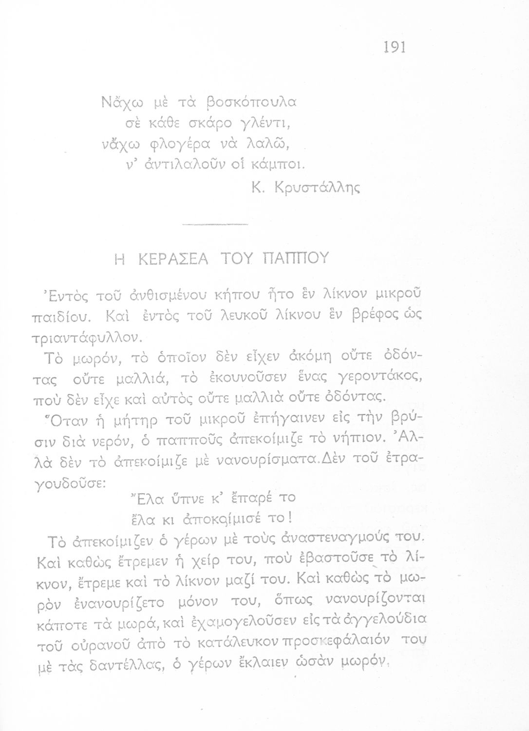 Αναγνωστικό Δ΄ Δημοτικού που περιλαμβάνει θέματα από την θρησκευτική, οικογενειακή και σχολική ζωή του παιδιού, την ελληνική μυθολογία και ιστορία και τη ζωή των ζώων.