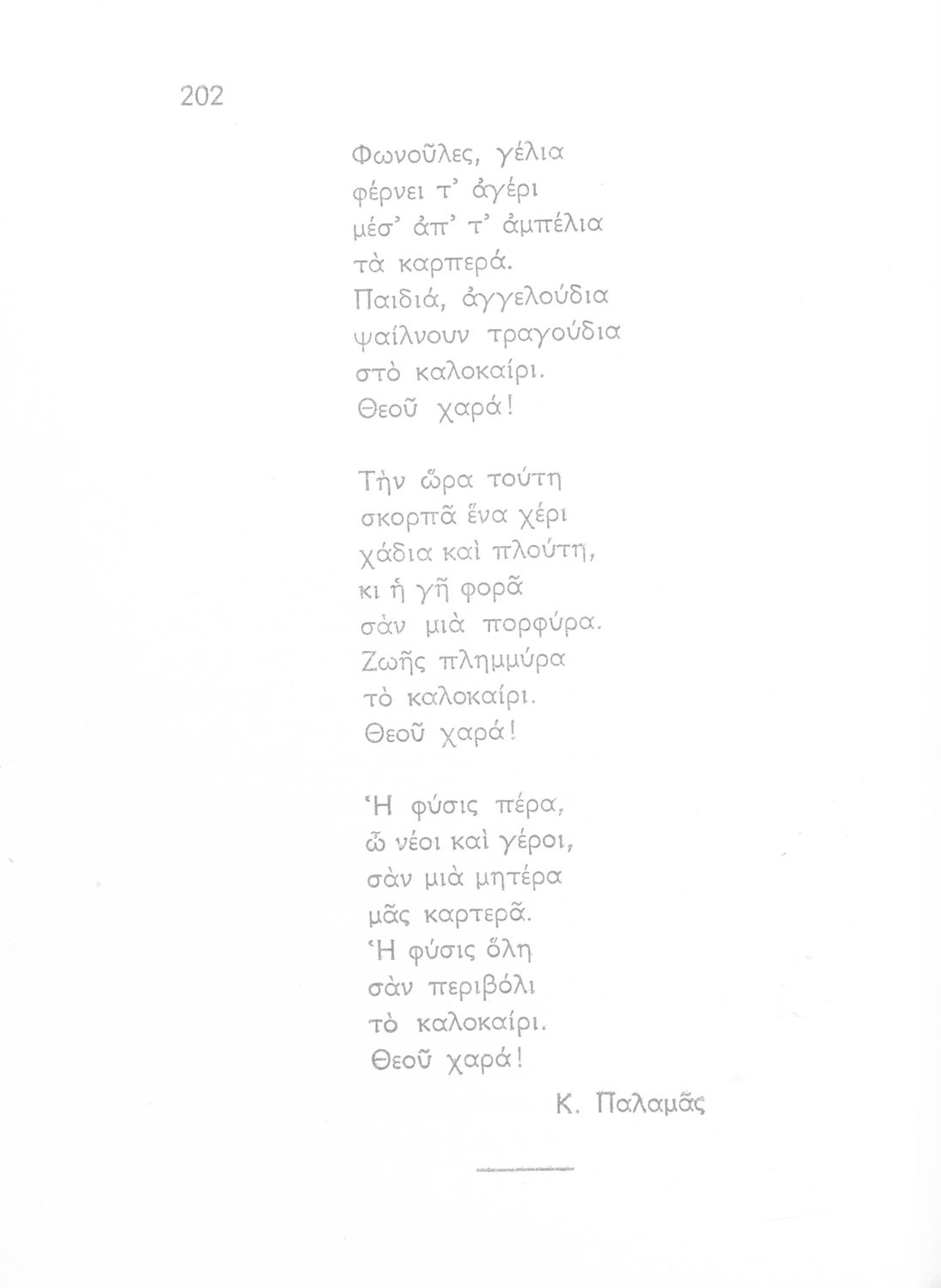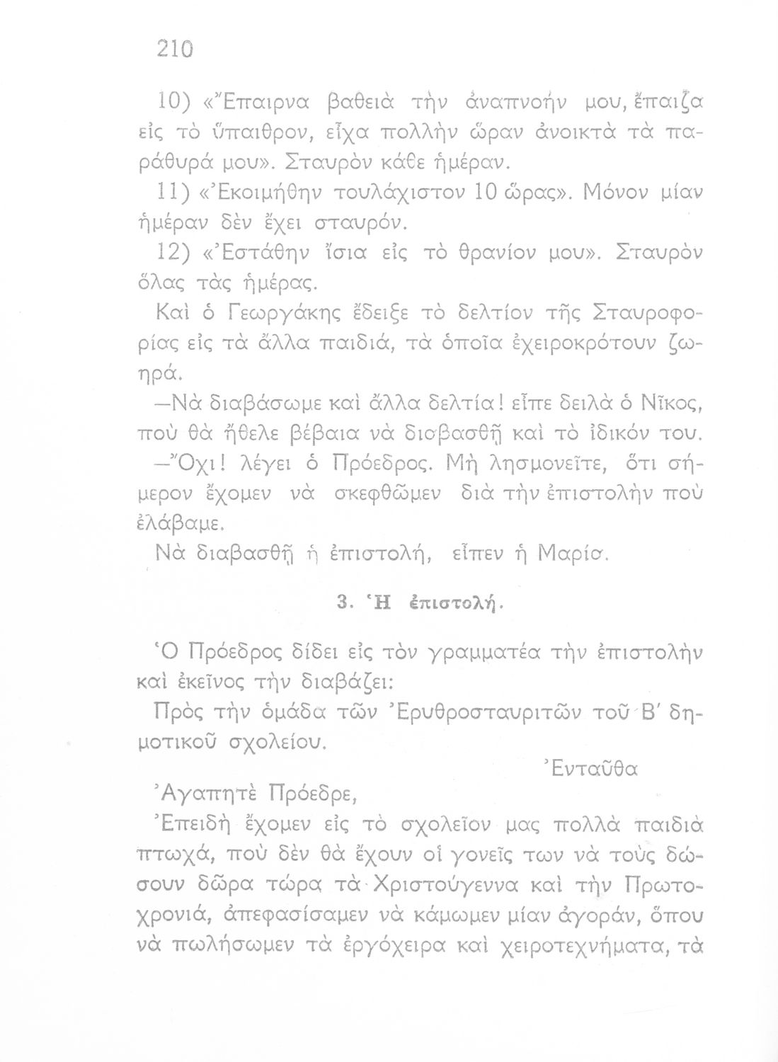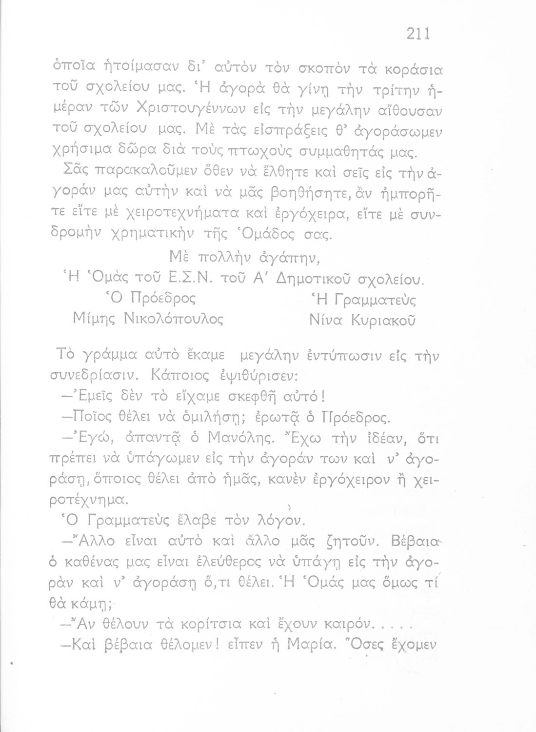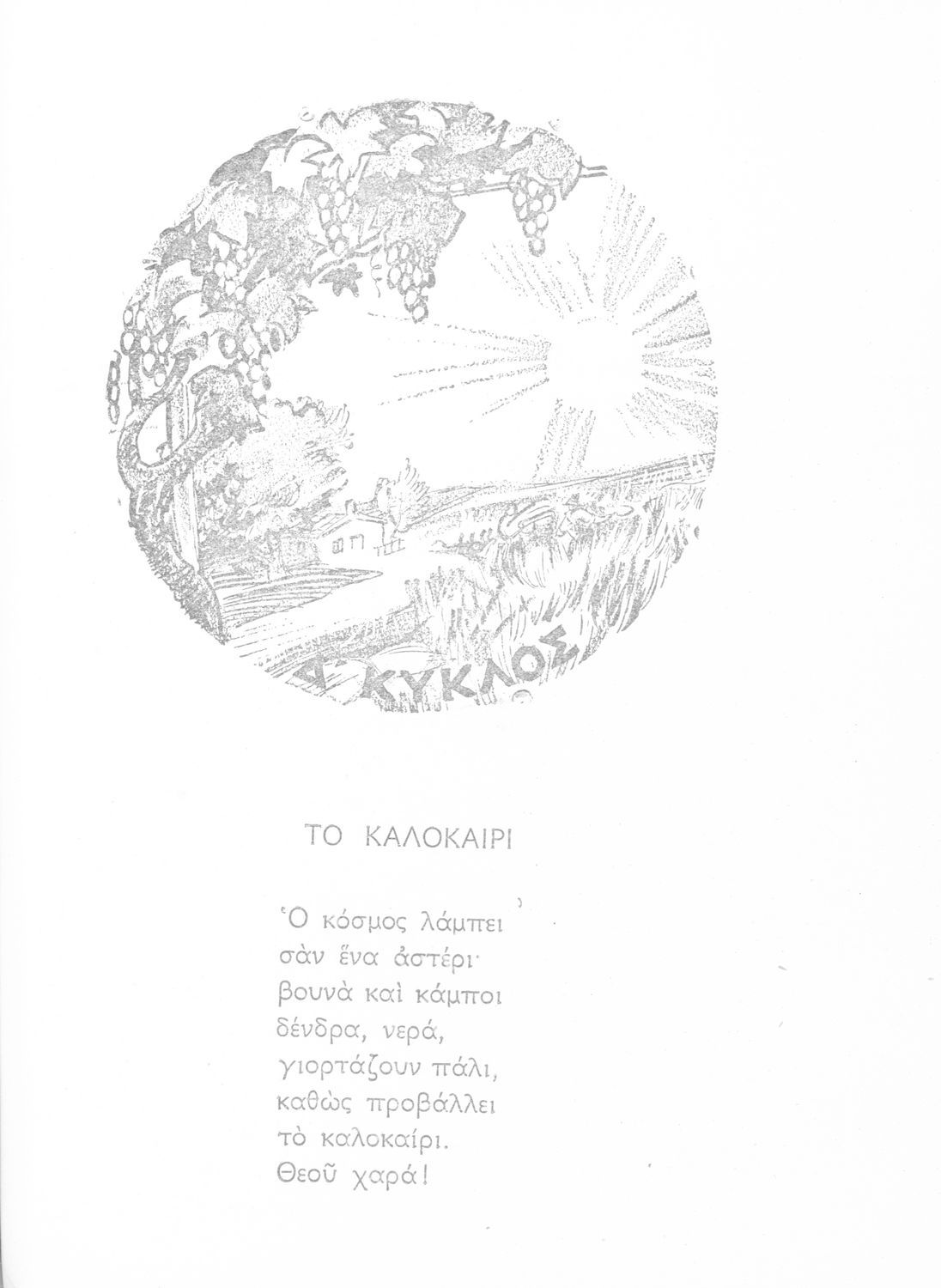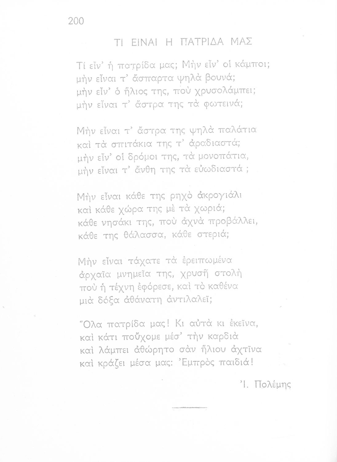 Σχολικό εγχειρίδιο Νέων Ελληνικών Δ΄ Γυμνασίου Θηλέων που περιλαμβάνει πεζά, ποιήματα και δημοτικά τραγούδια εμπνευσμένα από την σύγχρονη ελληνική ιστορία και την οικογενειακή και θρησκευτική ζωή. Περιέχει και