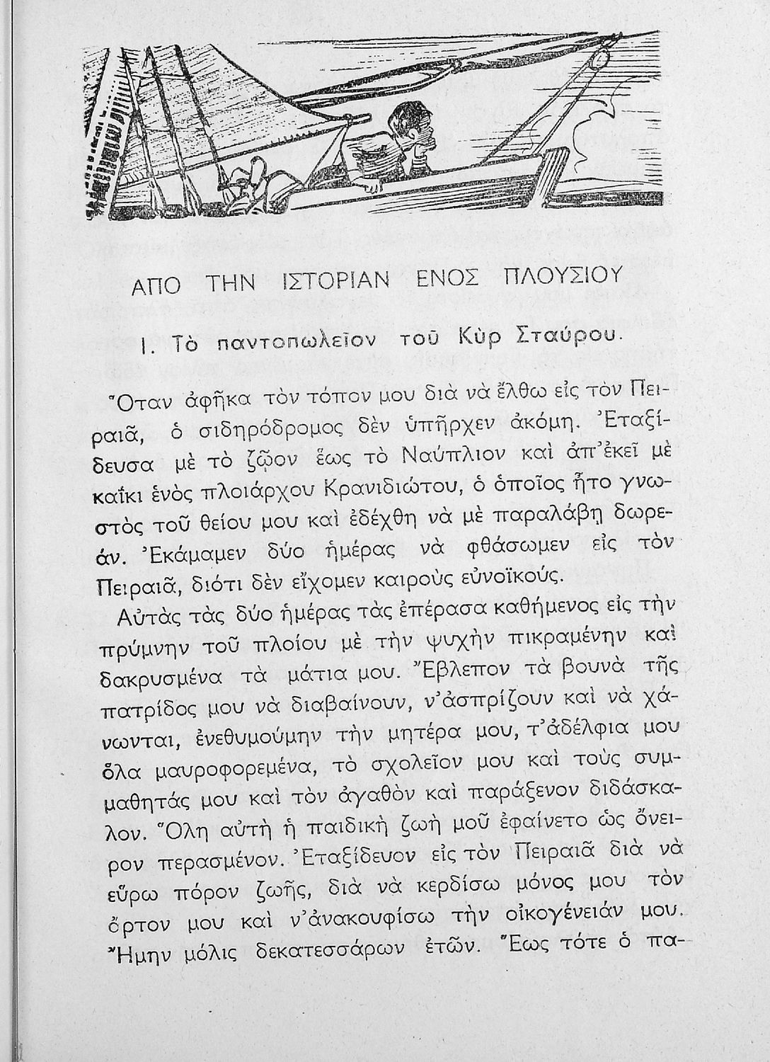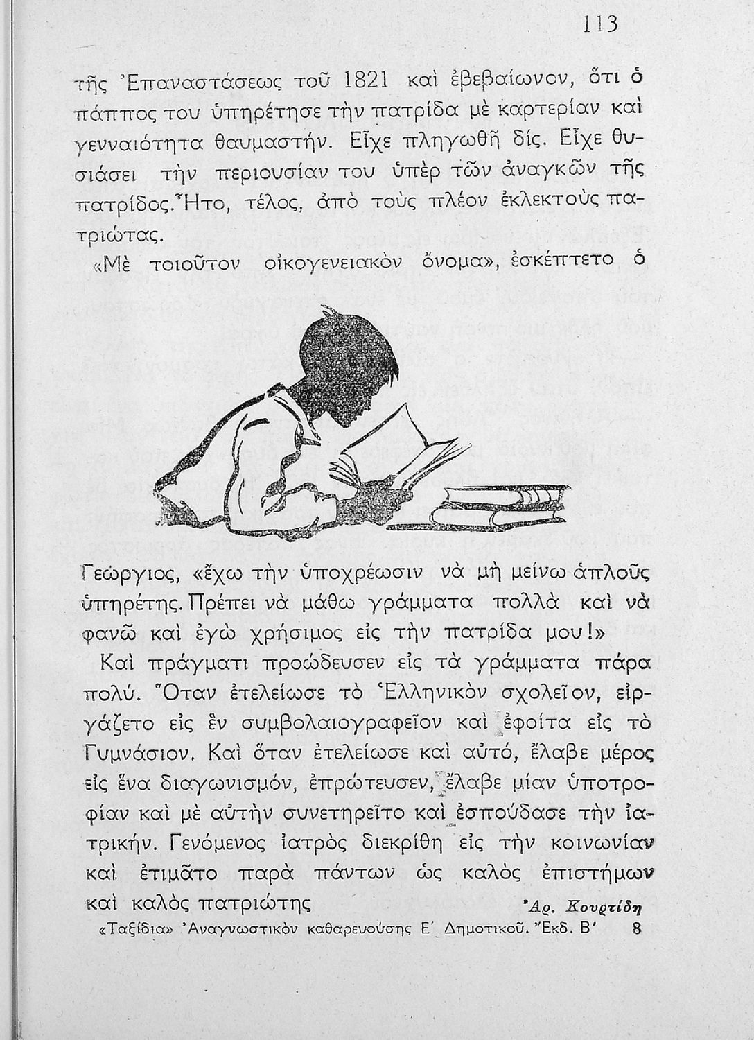 Βαθμίδα εκπαίδευσης: Πρωτοβάθμια Τάξη: Ε' Δημοτικού Μάθημα: Νέα Ελληνικά Γλώσσα: Καθαρεύουσα Παρουσίαση περιεχομένου: Αναγνωστικό Ε΄ Δημοτικού που περιλαμβάνει κείμενα από την ελληνική μυθολογία, τη θρησκευτική παράδοση, τον κόσμο των πτηνών και των ζώων, την κοινωνική και επαγγελματική ζωή, την ελληνική γη και τις μεγάλες ανακαλύψεις. |