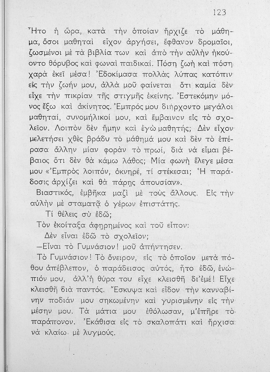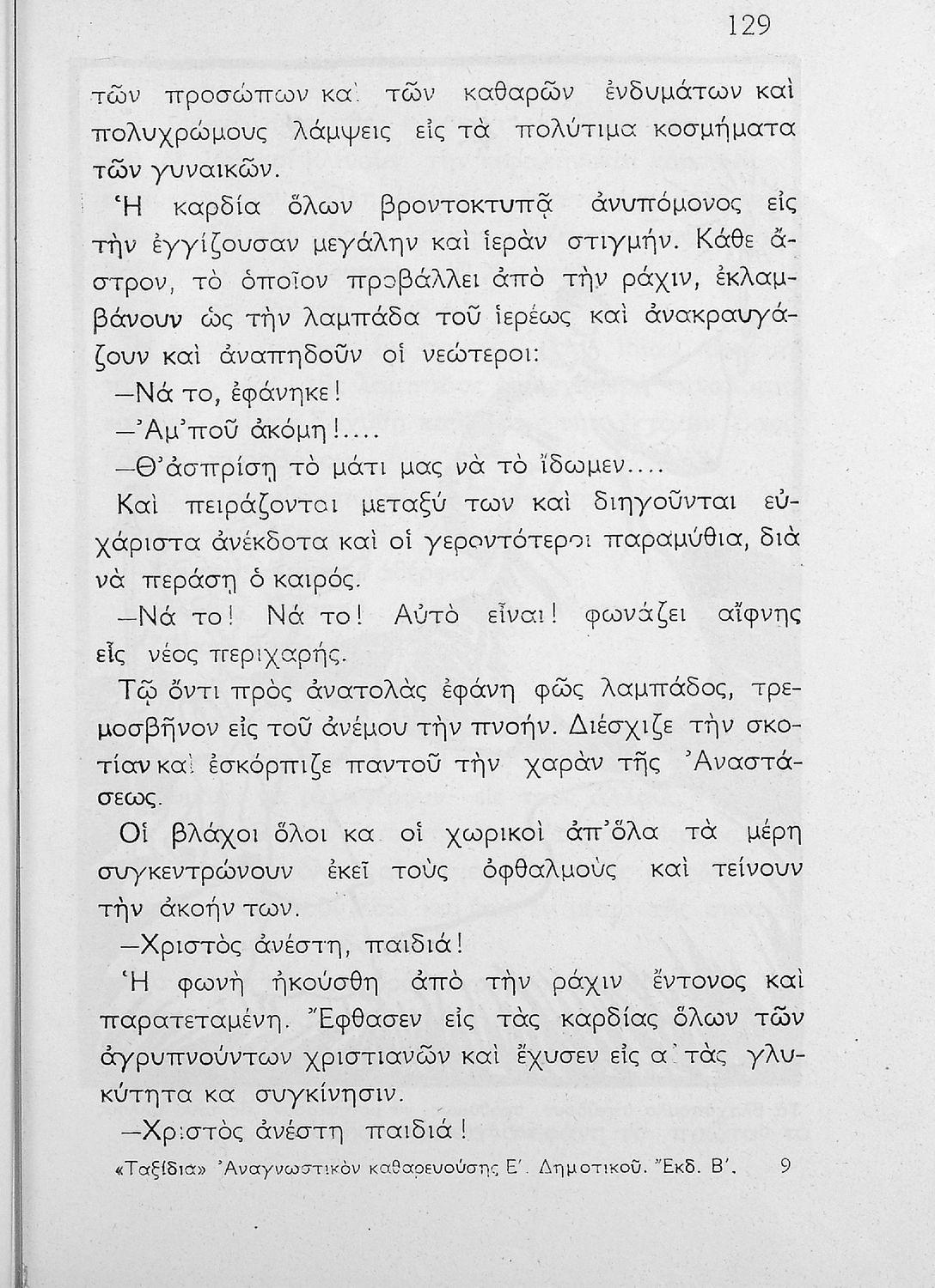 Βαθμίδα εκπαίδευσης: Πρωτοβάθμια Τάξη: Ε' Δημοτικού Μάθημα: Νέα Ελληνικά Γλώσσα: Καθαρεύουσα Παρουσίαση περιεχομένου: Αναγνωστικό Ε΄ Δημοτικού που περιλαμβάνει κείμενα από την ελληνική μυθολογία, τη θρησκευτική παράδοση, τον κόσμο των πτηνών και των ζώων, την κοινωνική και επαγγελματική ζωή, την ελληνική γη και τις μεγάλες ανακαλύψεις. |