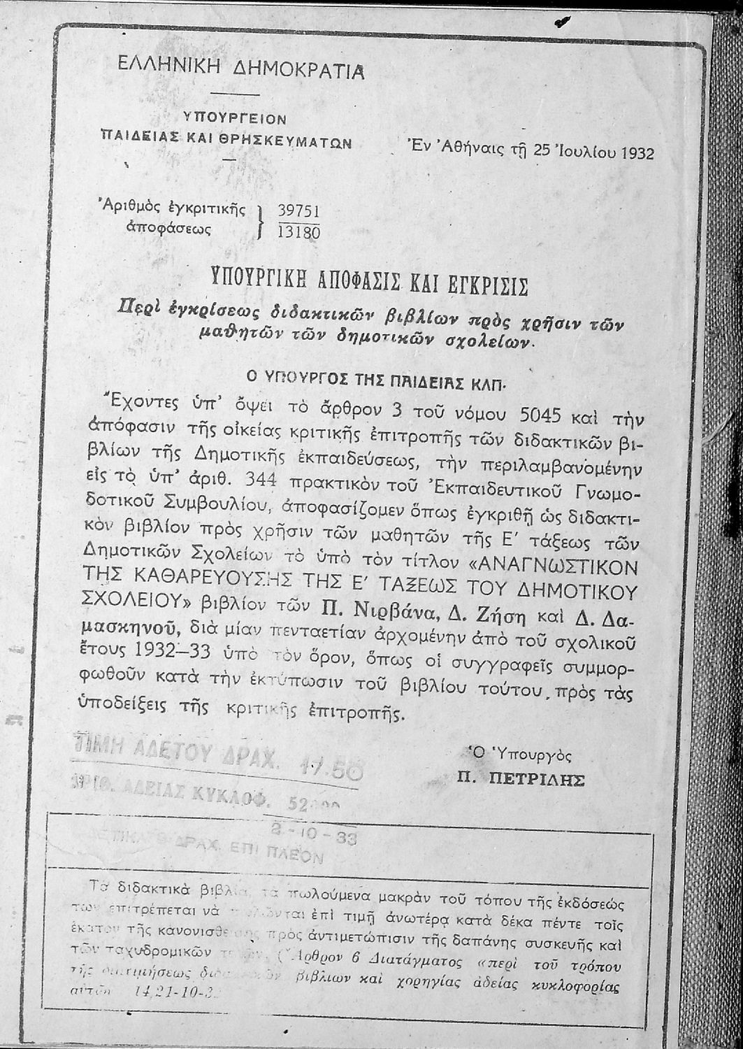 Υπουργική απόφαση / Σύμβαση: 39751/25-7-1932