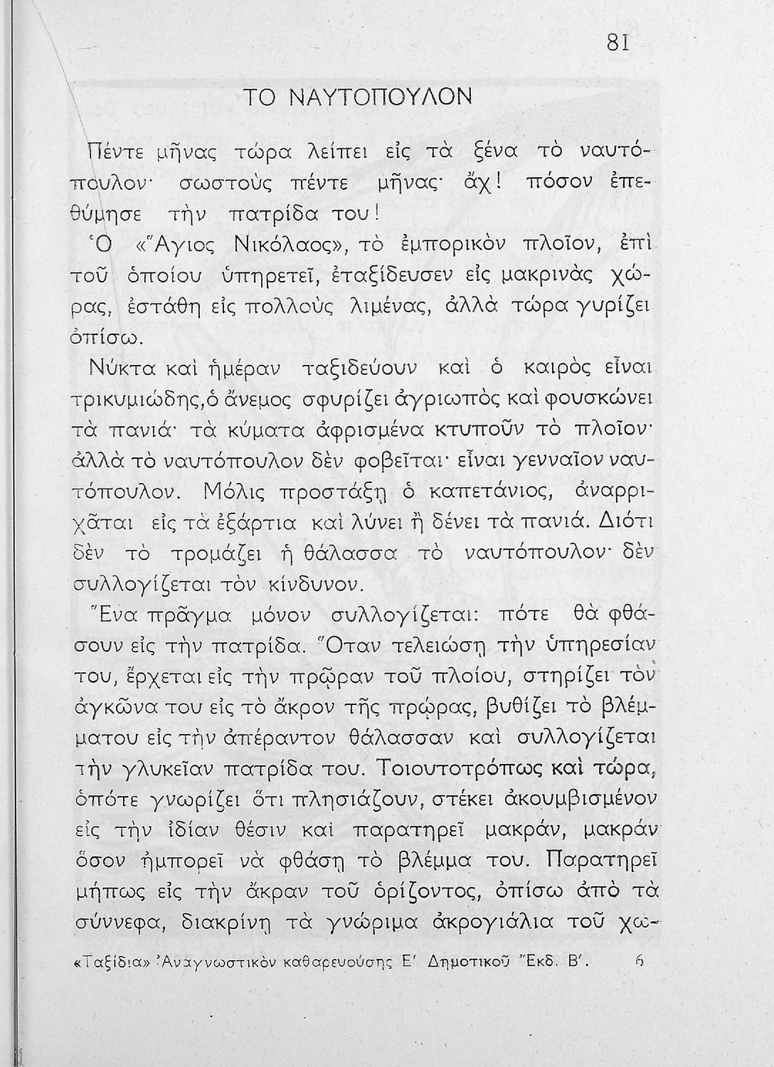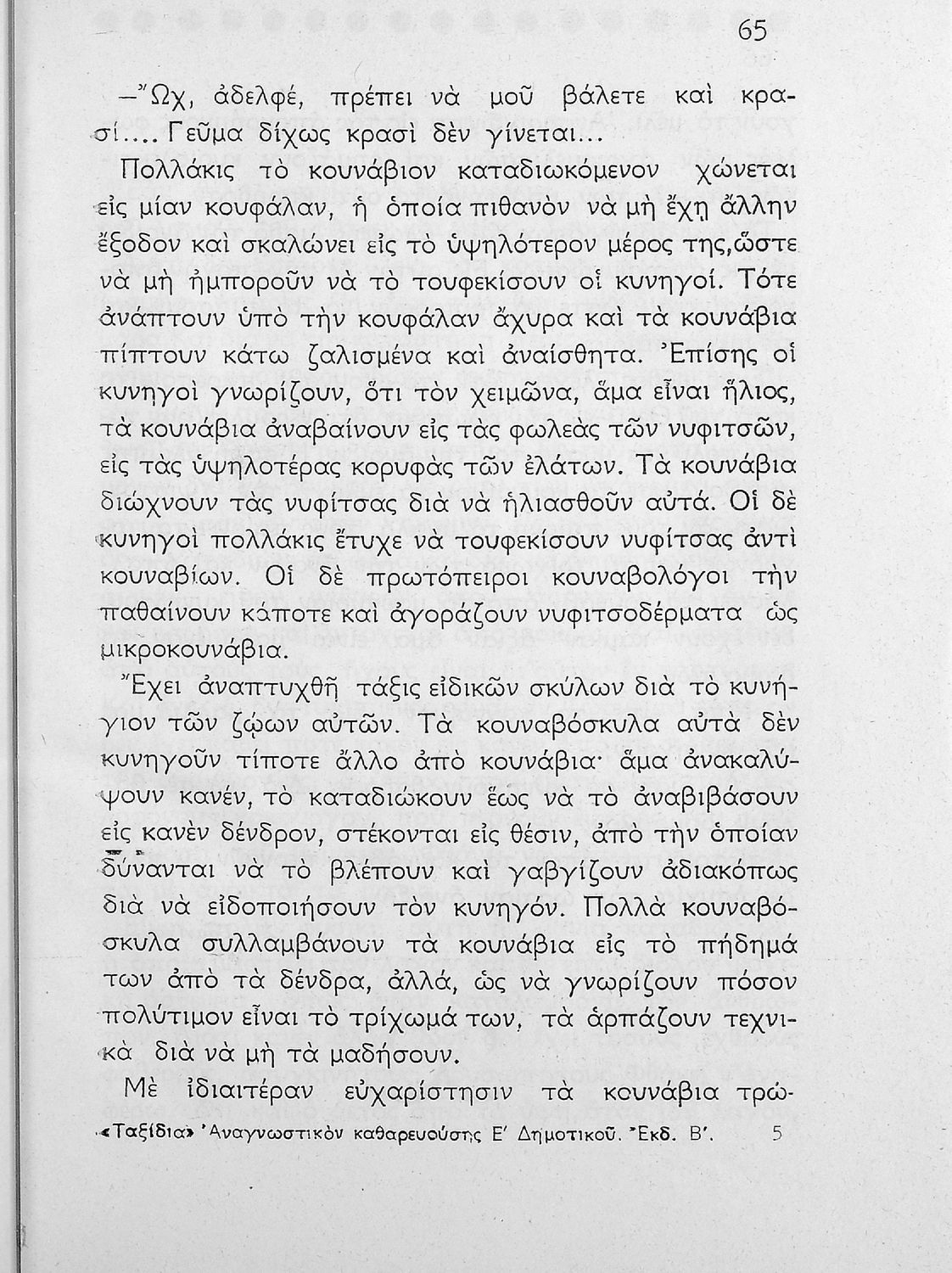 Βαθμίδα εκπαίδευσης: Πρωτοβάθμια Τάξη: Ε' Δημοτικού Μάθημα: Νέα Ελληνικά Γλώσσα: Καθαρεύουσα Παρουσίαση περιεχομένου: Αναγνωστικό Ε΄ Δημοτικού που περιλαμβάνει κείμενα από την ελληνική μυθολογία, τη θρησκευτική παράδοση, τον κόσμο των πτηνών και των ζώων, την κοινωνική και επαγγελματική ζωή, την ελληνική γη και τις μεγάλες ανακαλύψεις. |