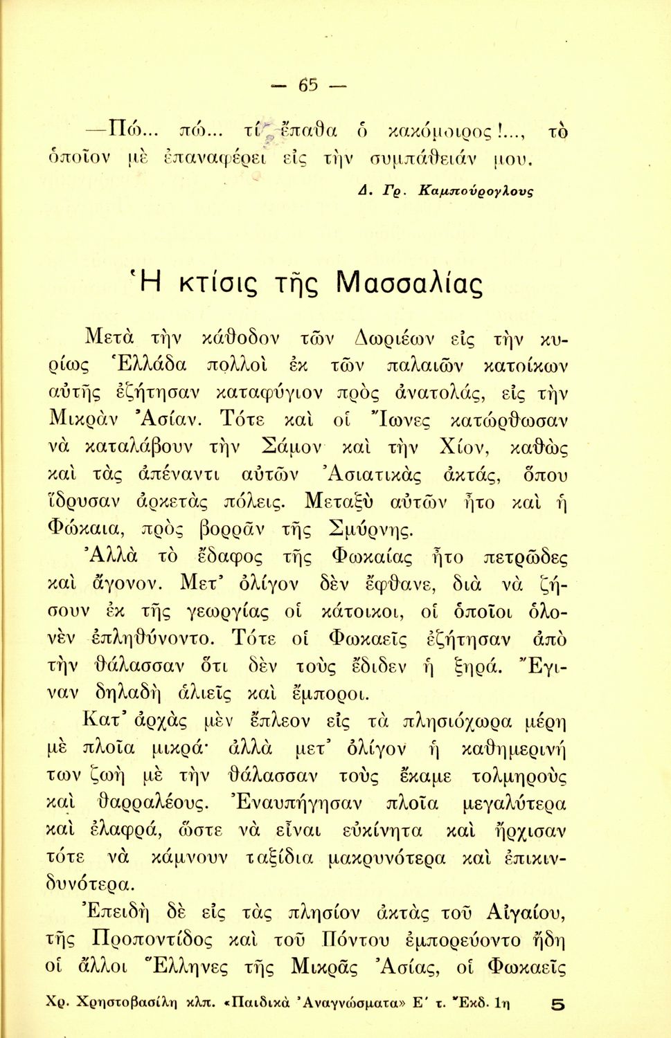 Βαθμίδα εκπαίδευσης: Πρωτοβάθμια Τάξη: Ε' Δημοτικού Μάθημα: Νέα Ελληνικά Γλώσσα: Καθαρεύουσα Παρουσίαση περιεχομένου: Αναγνωστικό για τη Ε' Δημοτικού που περιέχει ποιήματα και πεζά με ιστορικό και θρησκευτικό περιεχόμενο. |
