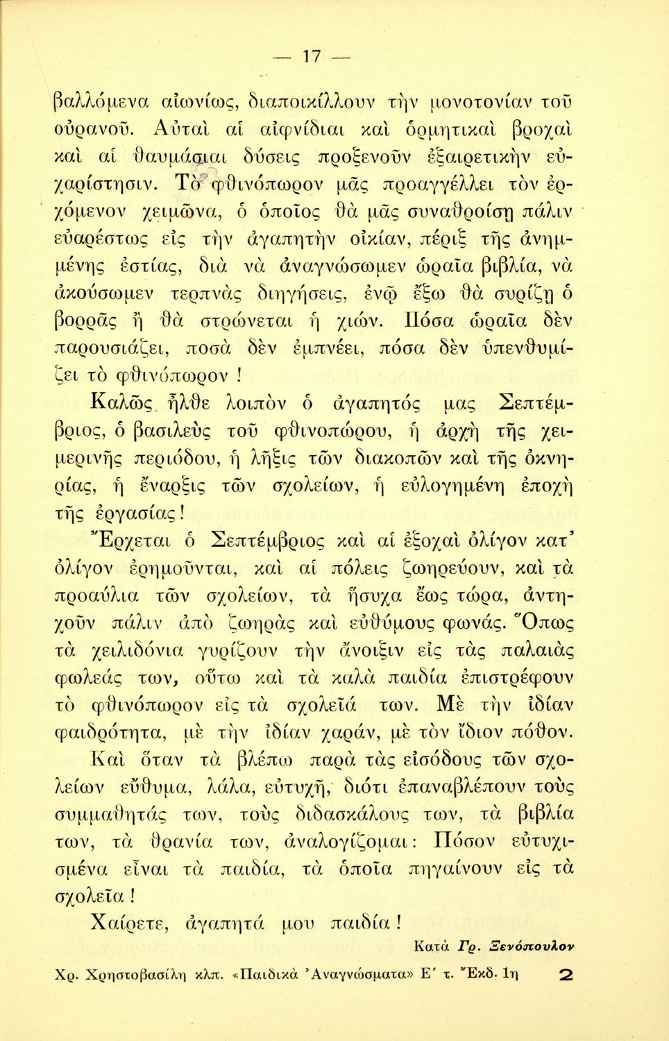 Βαθμίδα εκπαίδευσης: Πρωτοβάθμια Τάξη: Ε' Δημοτικού Μάθημα: Νέα Ελληνικά Γλώσσα: Καθαρεύουσα Παρουσίαση περιεχομένου: Αναγνωστικό για τη Ε' Δημοτικού που περιέχει ποιήματα και πεζά με ιστορικό και θρησκευτικό περιεχόμενο. |