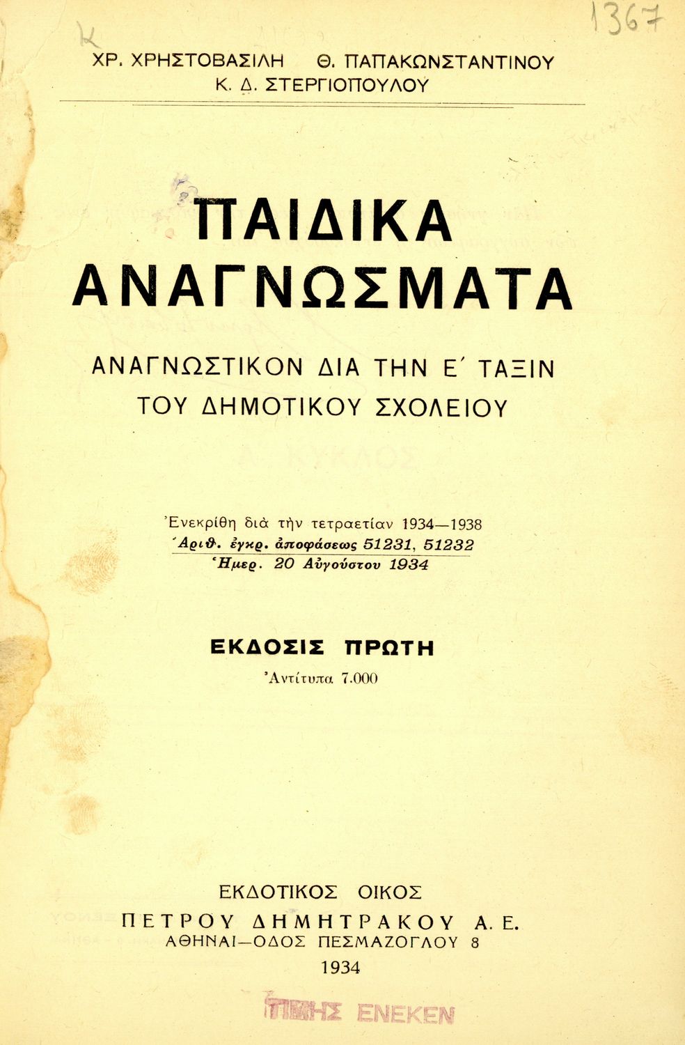 Κωδικός αναγνώρισης: 20-01367 Τίτλος: Παιδικά αναγνώσματα. Αναγνωστικόν διά την Ε΄ τάξιν του Δημοτικού Σχολείου Συγγραφέας: Χ. Χρηστοβασίλης, Θ. Παπακωνσταντίνου, Κ. Στεργιόπουλος Μέγεθος και υπόστρωμα: Σχολικό εγχειρίδιο, 20εκ., μαλακό εξώφυλλο, 230 σελίδες. Εξώφυλλο (έγχρωμο), σκίτσα (ασπρόμαυρα). |