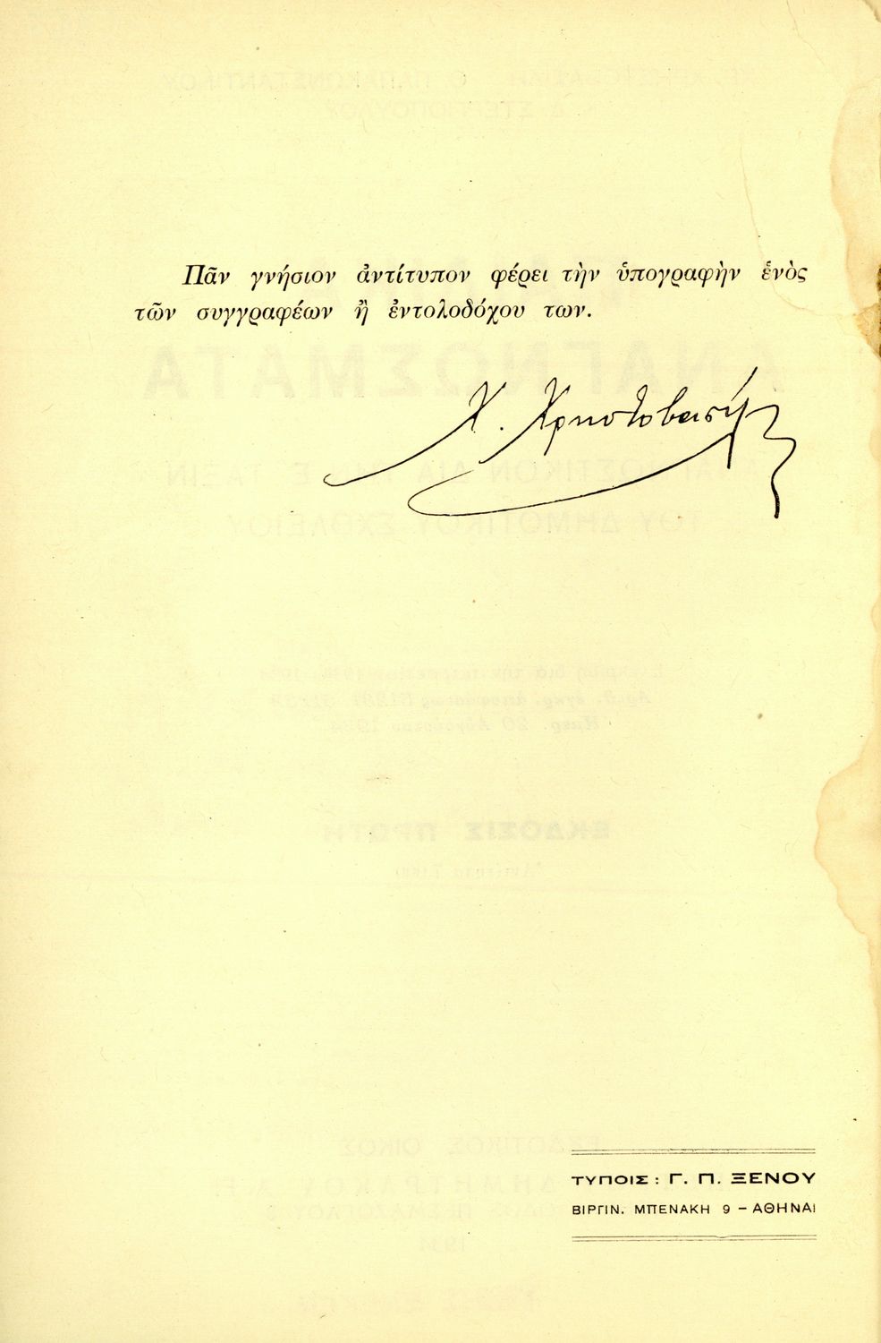 Εκδότης: Πέτρος Δημητράκος Έτος έκδοσης: 1934 Τόπος έκδοσης: Αθήνα Έκδοση: 1η Υπουργική απόφαση / Σύμβαση: 51231/51232/20-8-1934 Έτος έγκρισης: 1934 |