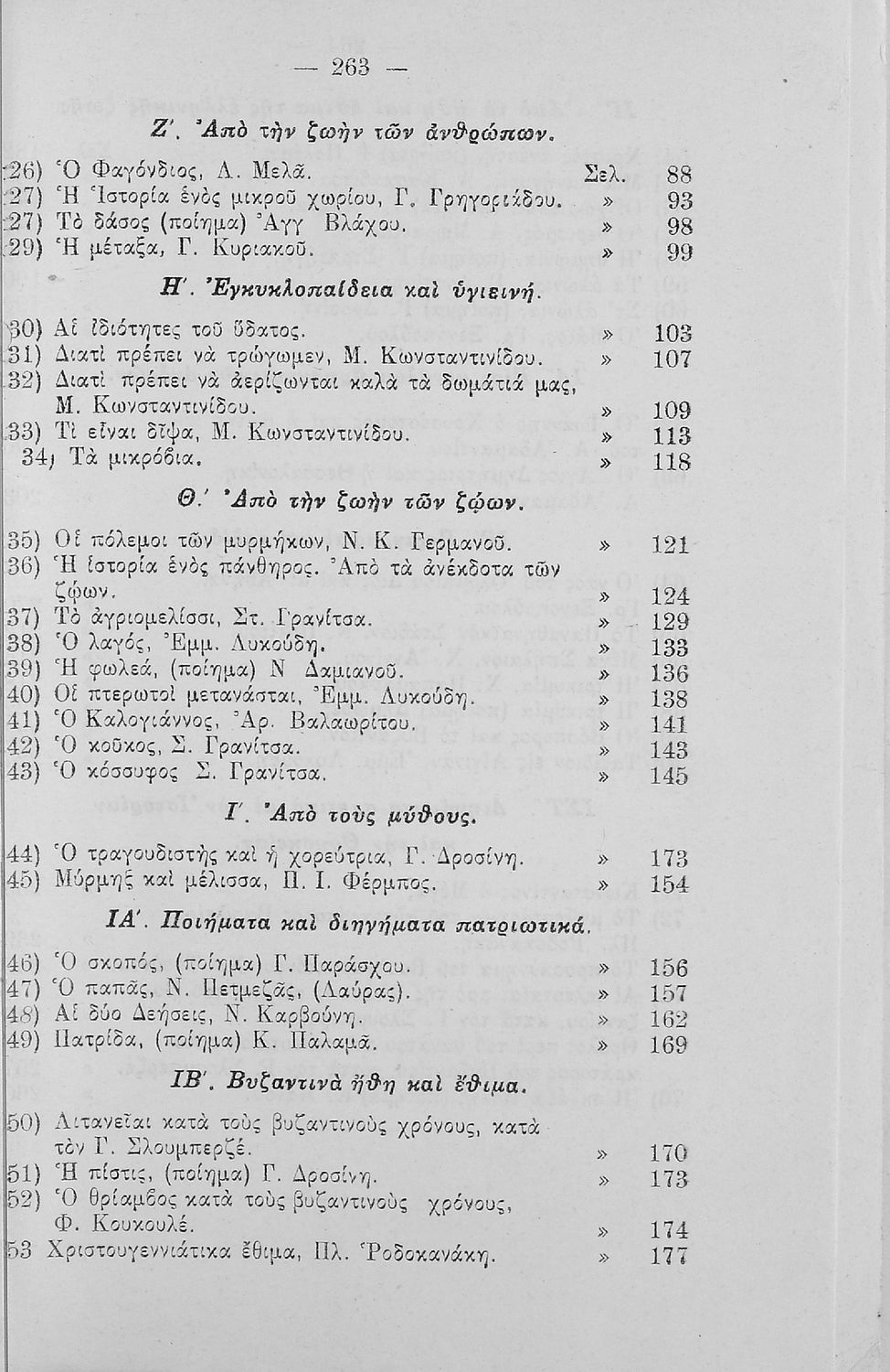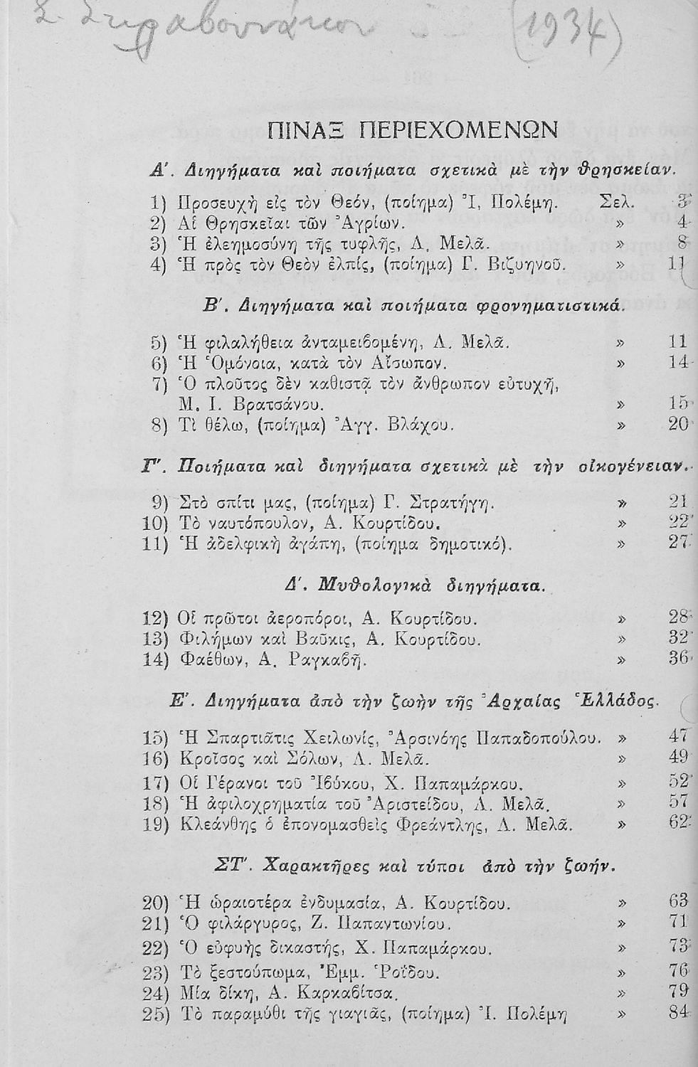 Αναγνωστικό Ε΄ Δημοτικού που αποτελείται από πεζά γραμμένα σε καθαρεύουσα και ποιήματα σε δημοτική εμπνευσμένα από την οικογένεια, τη θρησκεία, την μυθολογία και ιστορία, την υγιεινή, την πατρίδα, την ελληνική φύση, την αγάπη για τα ζώα, τις καθημερινές ασχολίες και επαγγέλματα και τις ηθικές αρετές.