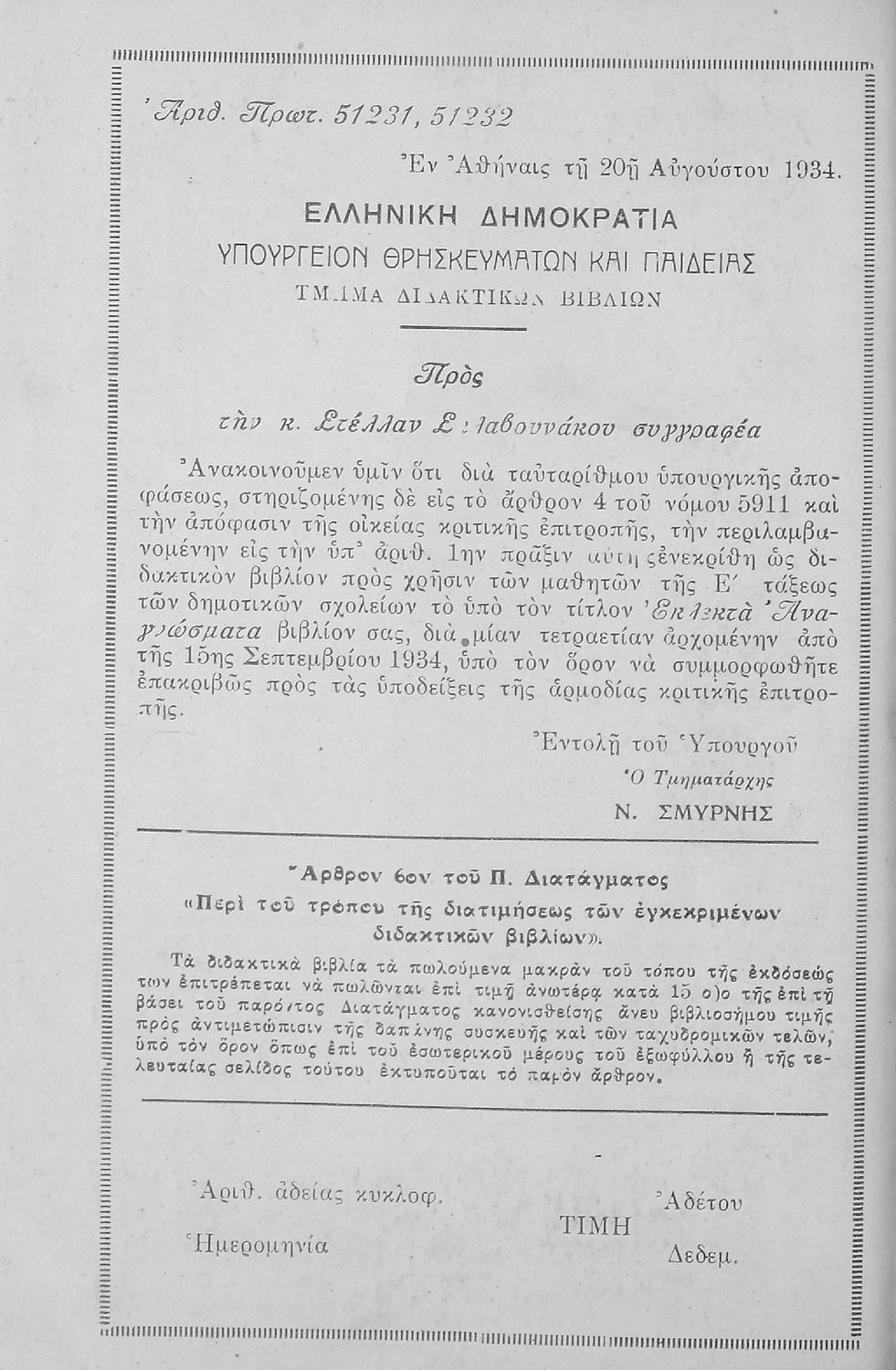Υπουργική απόφαση / Σύμβαση: 51231,51232/20-8-1934