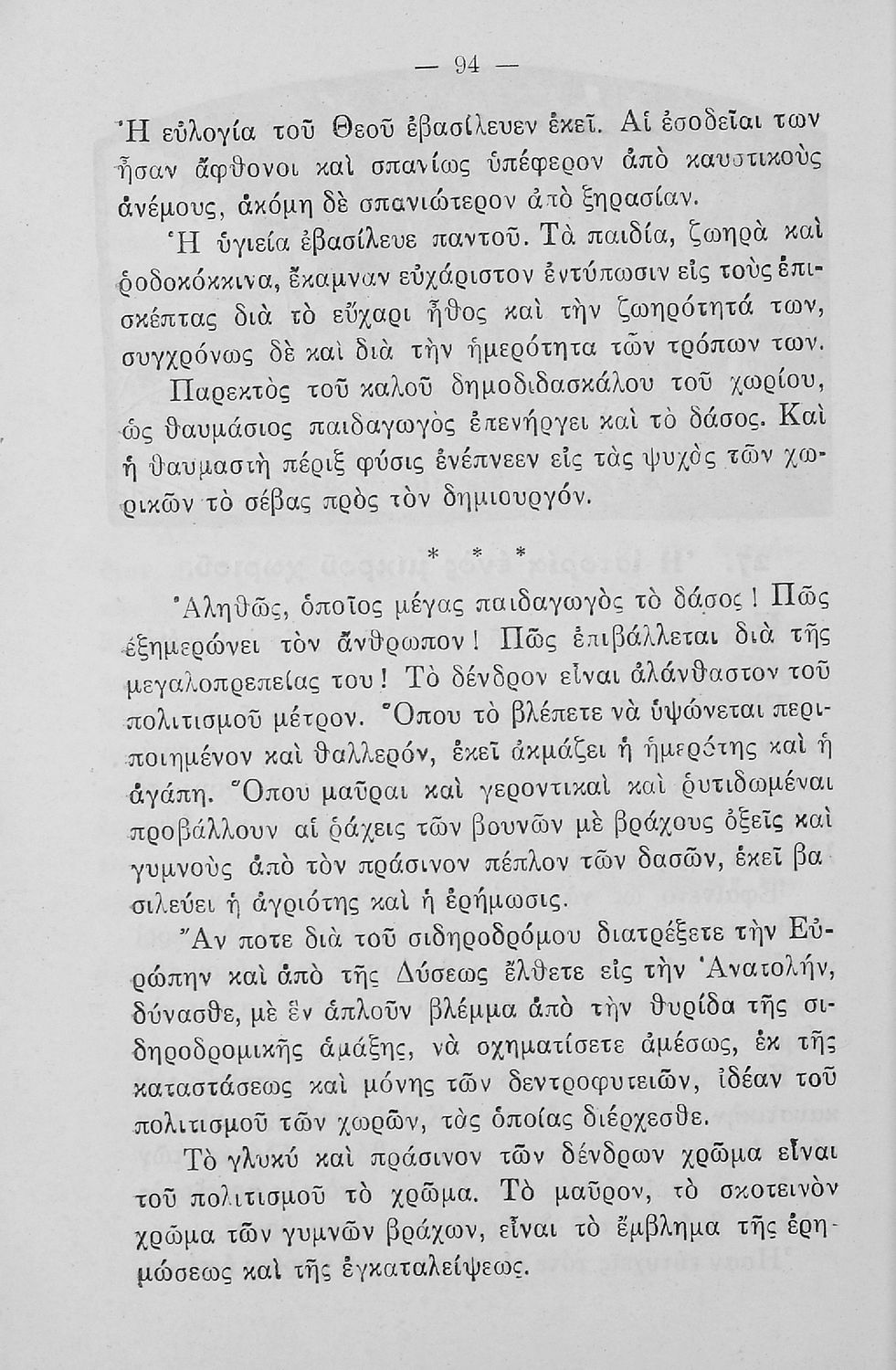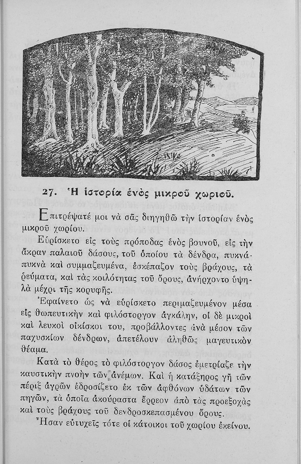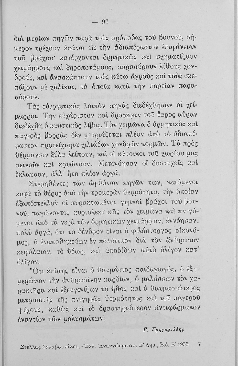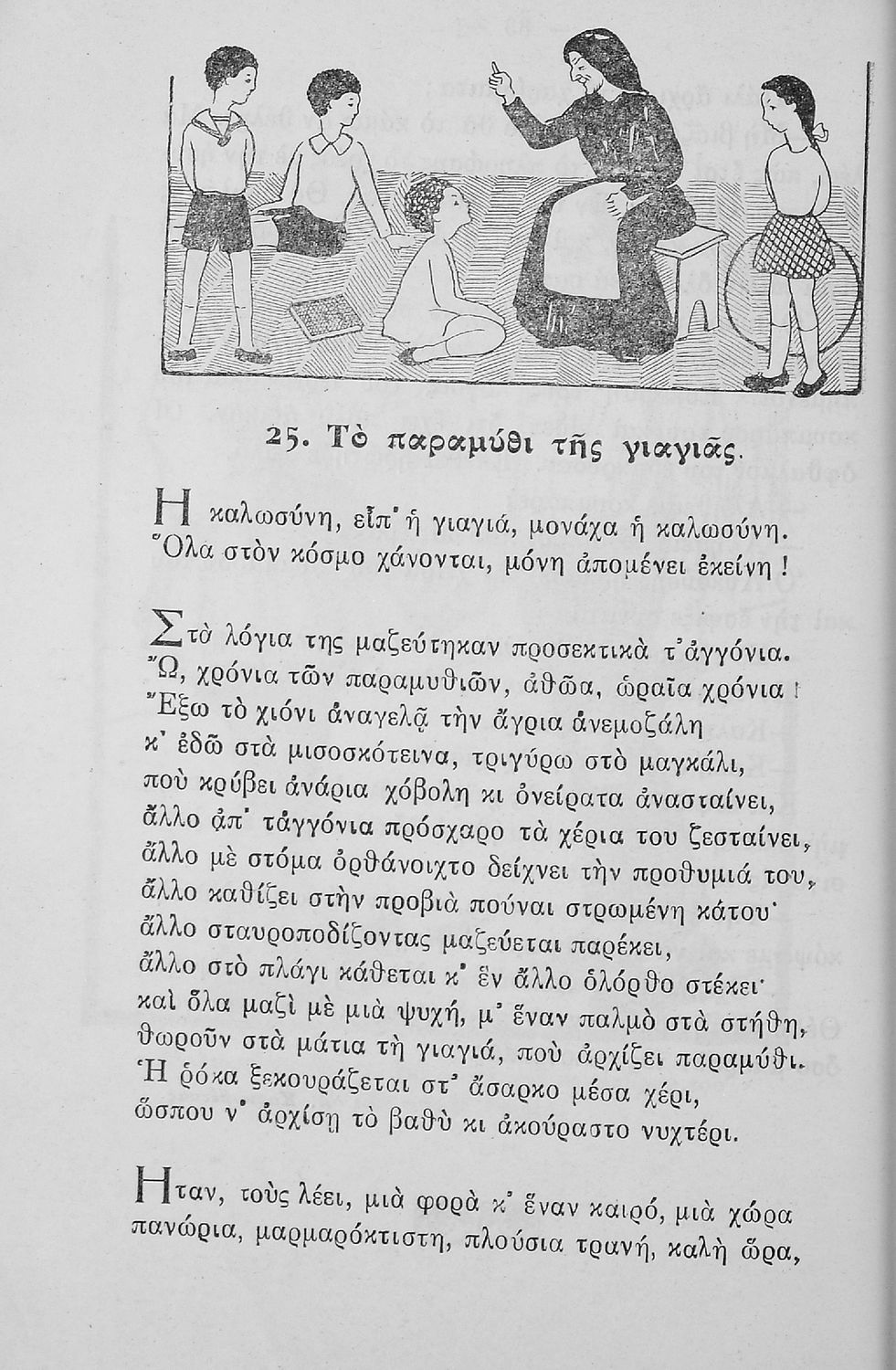 Αναγνωστικό Ε΄ Δημοτικού που αποτελείται από πεζά γραμμένα σε καθαρεύουσα και ποιήματα σε δημοτική εμπνευσμένα από την οικογένεια, τη θρησκεία, την μυθολογία και ιστορία, την υγιεινή, την πατρίδα, την ελληνική φύση, την αγάπη για τα ζώα, τις καθημερινές ασχολίες και επαγγέλματα και τις ηθικές αρετές.