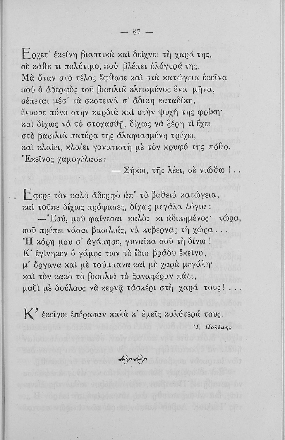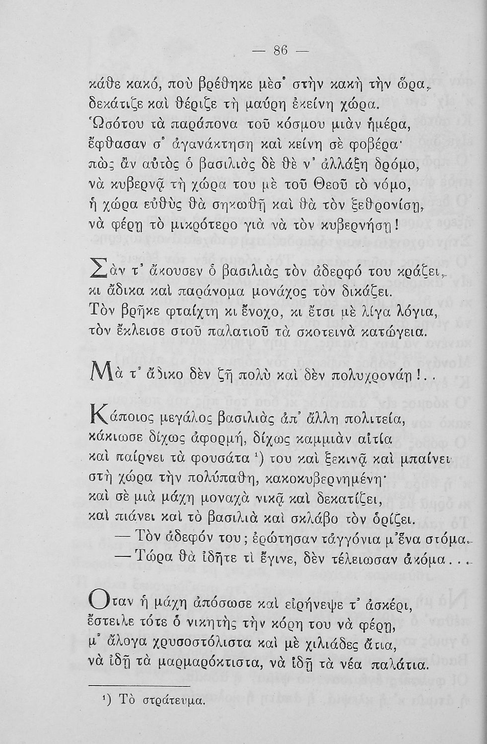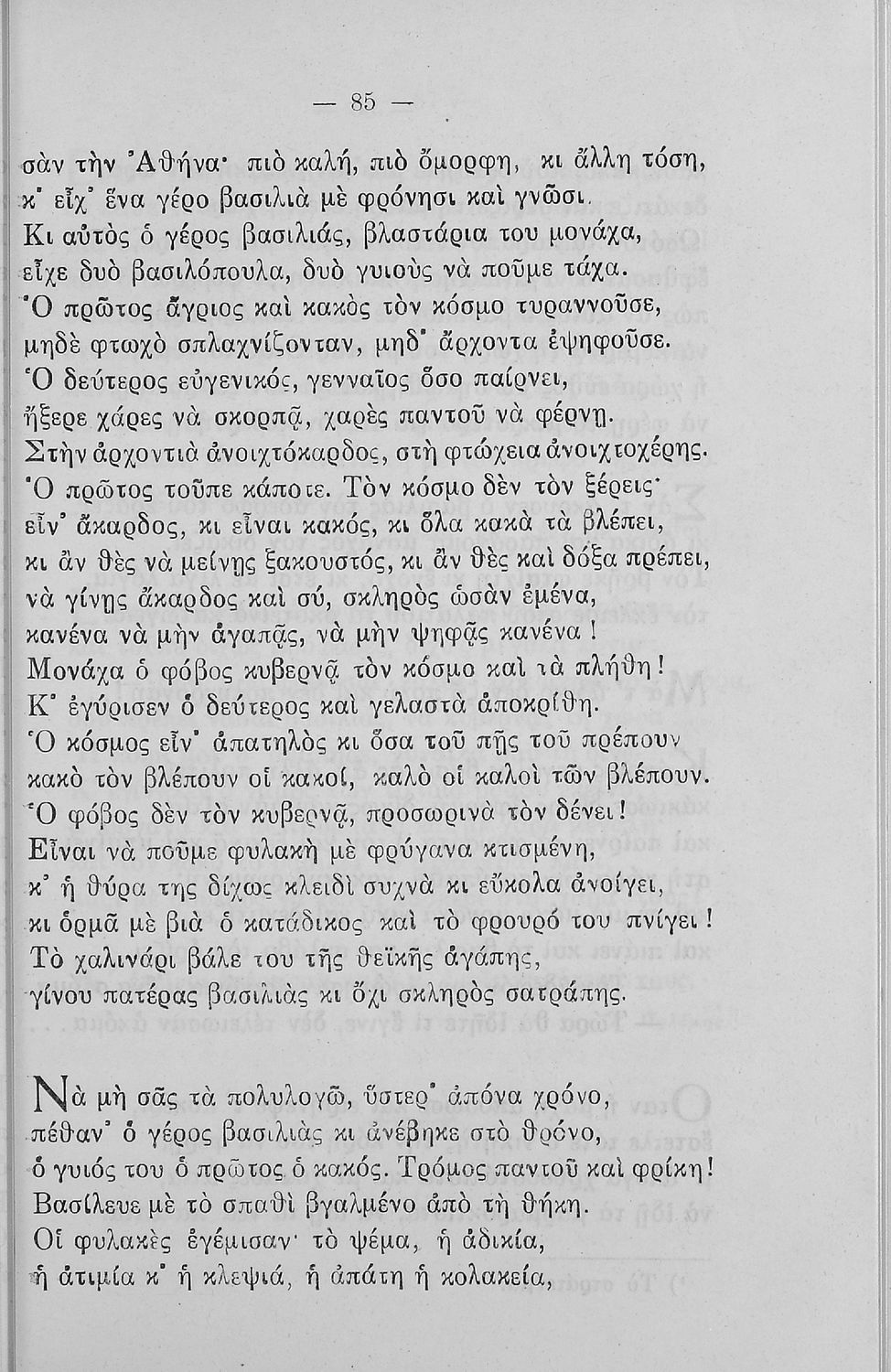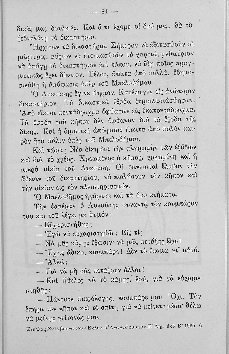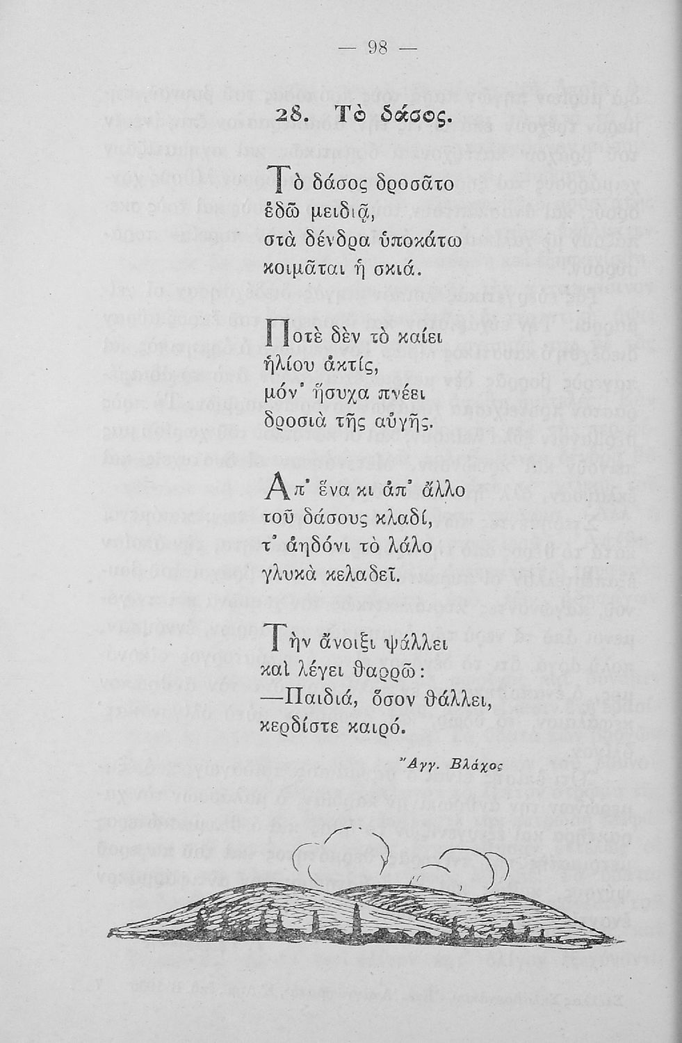 Αναγνωστικό Ε΄ Δημοτικού που αποτελείται από πεζά γραμμένα σε καθαρεύουσα και ποιήματα σε δημοτική εμπνευσμένα από την οικογένεια, τη θρησκεία, την μυθολογία και ιστορία, την υγιεινή, την πατρίδα, την ελληνική φύση, την αγάπη για τα ζώα, τις καθημερινές ασχολίες και επαγγέλματα και τις ηθικές αρετές.