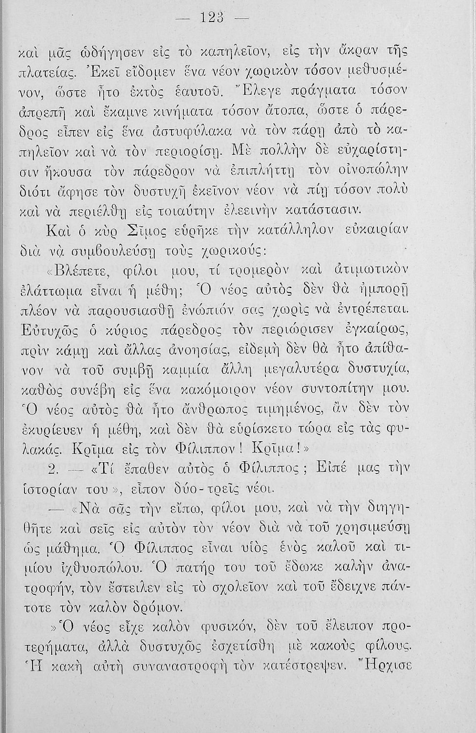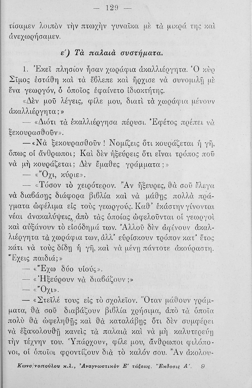 Βαθμίδα εκπαίδευσης: Πρωτοβάθμια Τάξη: Ε' Δημοτικού Μάθημα: Νέα Ελληνικά Γλώσσα: Καθαρεύουσα Παρουσίαση περιεχομένου: Αναγνωστικό Ε΄ Δημοτικού που περιλαμβάνει κείμενα που βασίζονται στο τρίπτυχο "Πατρίς-Θρησκεία-Οικογένεια", το ολυμπιακό ιδεώδες, την αγάπη για τα ζώα και τις ηθικές αρετές. |