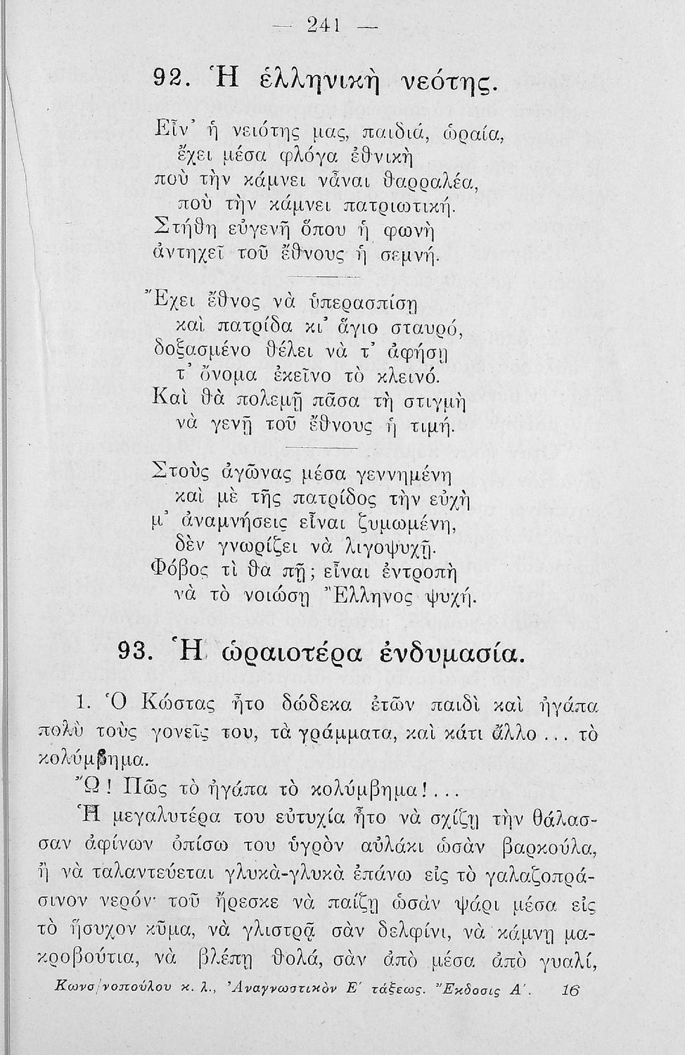 Αναγνωστικό Ε΄ Δημοτικού που περιλαμβάνει πεζογραφήματα εμπνευσμένα από την ελληνική φύση, την αγροτική ζωή και από το τρίπτυχο "Πατρίς- θρησκεία- οικογένεια".