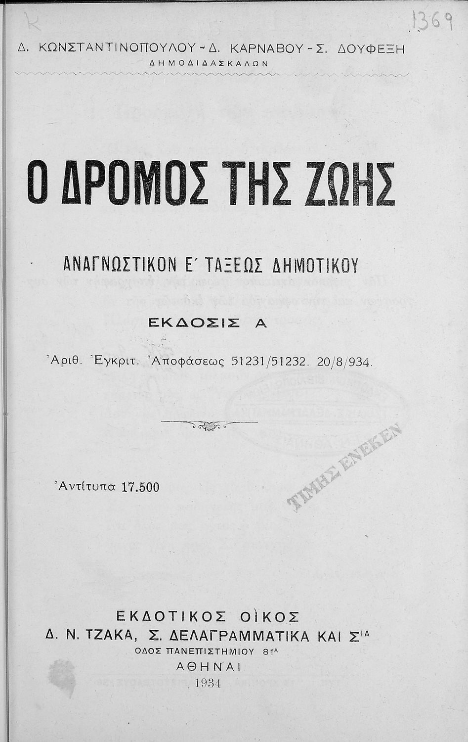Τίτλος: Ο δρόμος της ζωής. Αναγνωστικόν Ε΄ τάξεως Δημοτικού