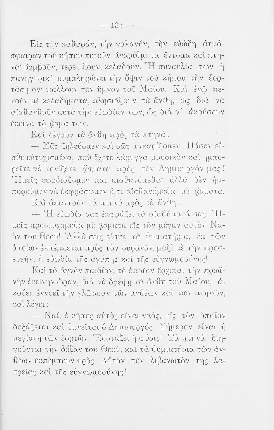 Αναγνωστικό Ε' Δημοτικού που περιλαμβάνει ποιήματα και πεζά με θέματα από την ελληνική φύση, τη θρησκεία και την αρχαία ελληνική και βυζαντινή ιστορία.