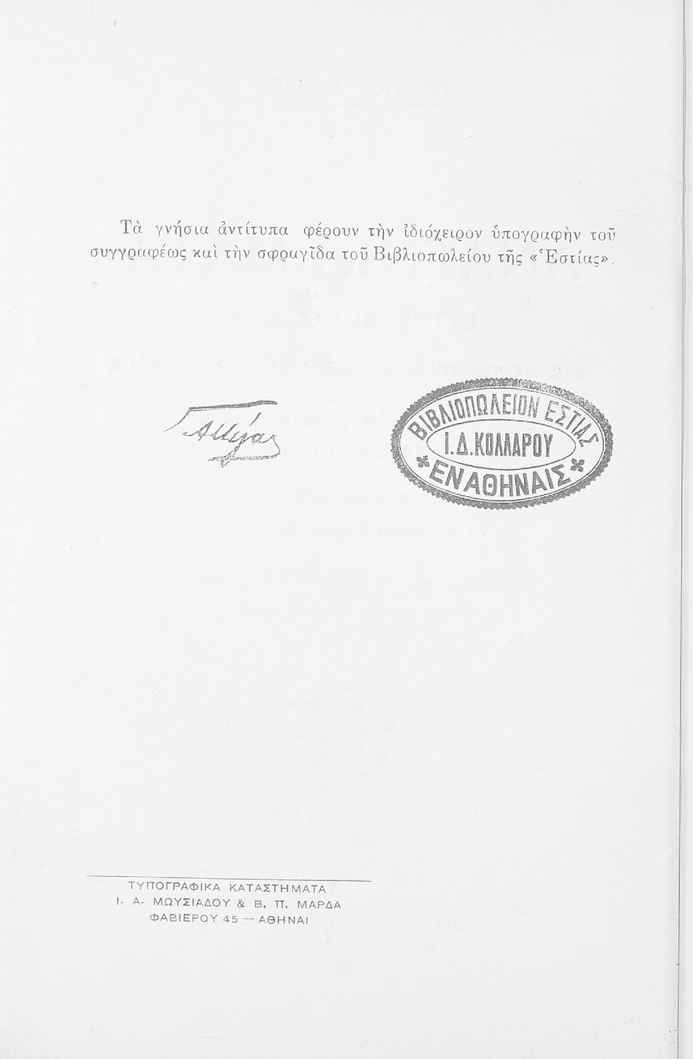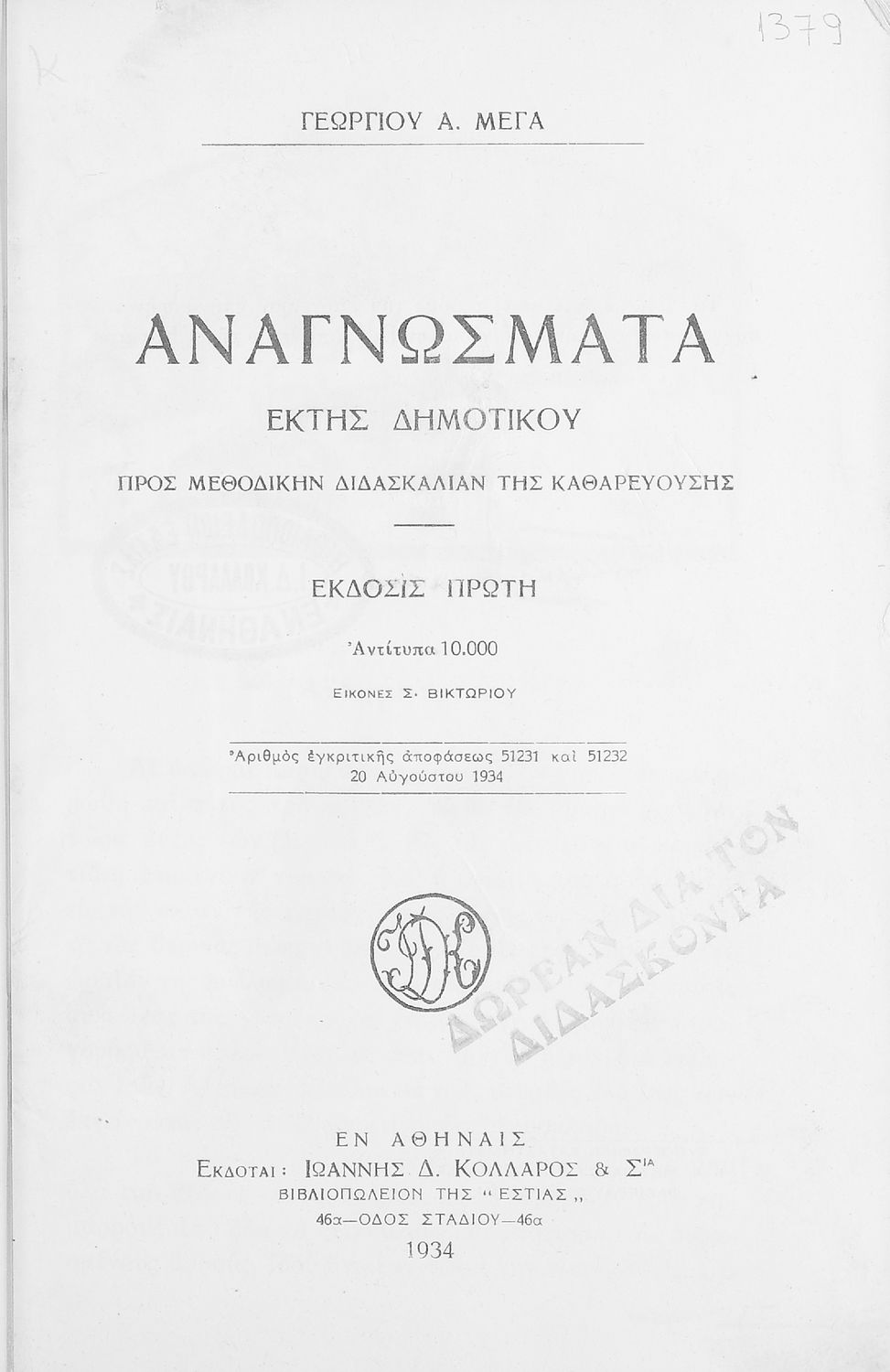 Εκδότης: Ιωάννης Δ. Κολλάρος, Βιβλιοπωλείο της "Εστίας" Έτος έκδοσης: 1934 Τόπος έκδοσης: Αθήνα Έκδοση: 1η Υπουργική απόφαση / Σύμβαση: 51231,51232/20-8-1934 Έτος έγκρισης: 1934 |