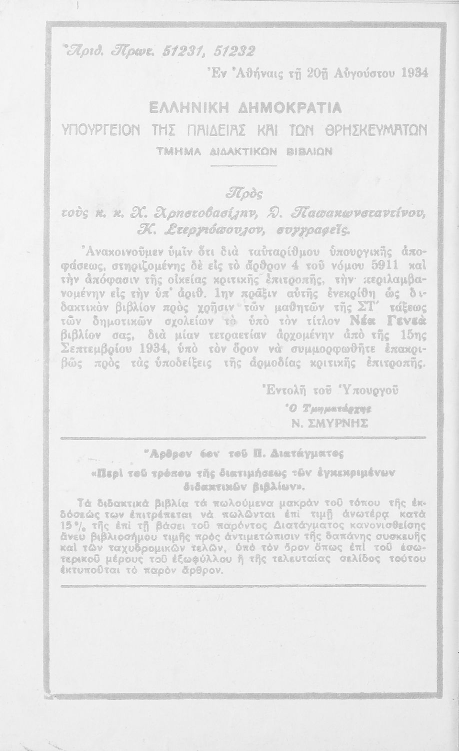 Υπουργική απόφαση / Σύμβαση: 51231,51232/20-8-1934