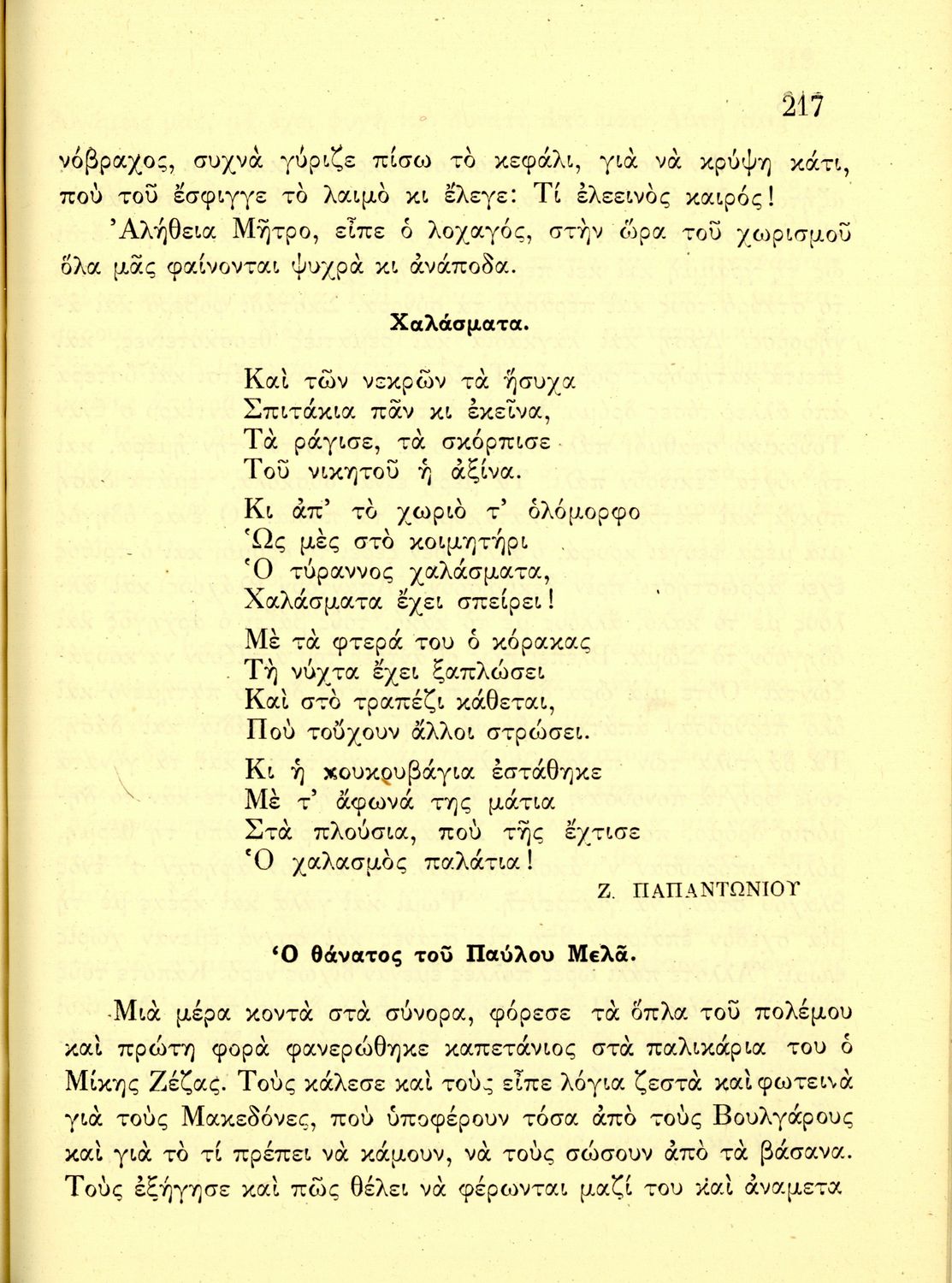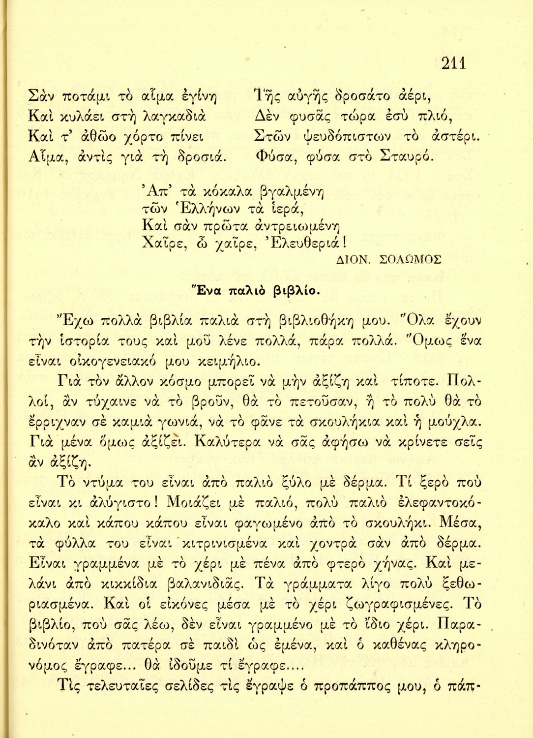 Αναγνωστικό ΣΤ΄ Δημοτικού που περιλαμβάνει ποιήματα και πεζά που εκθειάζουν αξίες όπως της πατρίδας, της θρησκείας, της οικογένειας, της αυτοθυσίας και του ηρωισμού των γυναικών, της τιμιότητας και της αγάπης.