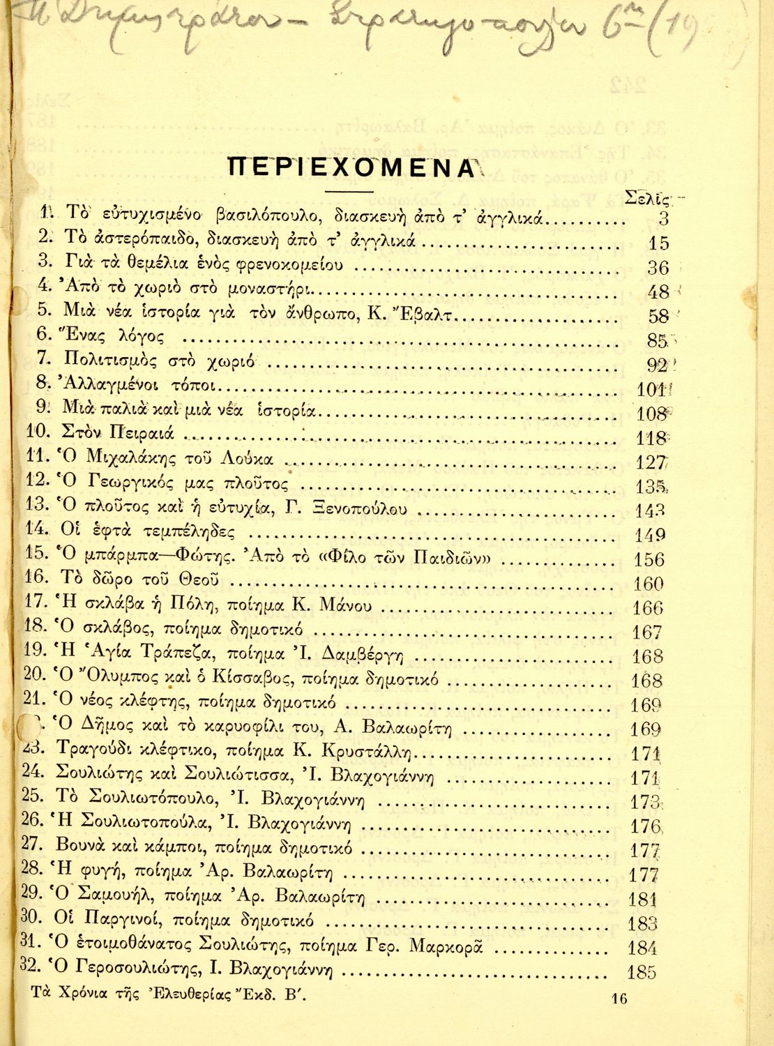 Αναγνωστικό ΣΤ΄ Δημοτικού που περιλαμβάνει ποιήματα και πεζά που εκθειάζουν αξίες όπως της πατρίδας, της θρησκείας, της οικογένειας, της αυτοθυσίας και του ηρωισμού των γυναικών, της τιμιότητας και της αγάπης.