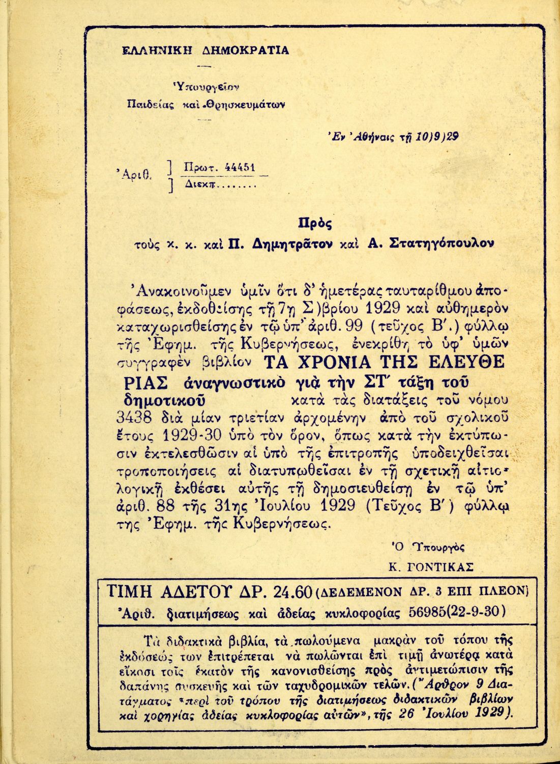 Αναγνωστικό της ΣΤ΄ Δημοτικού που κυκλοφόρησε σε 7.000 αντίτυπα 25 ημέρες πριν την 4η Αυγούστου 1936, οπότε κατά την επόμενη σχολική χρονιά διδάχτηκε ελάχιστα και η έκδοσή του με αυτή την μορφή σταμάτησε.